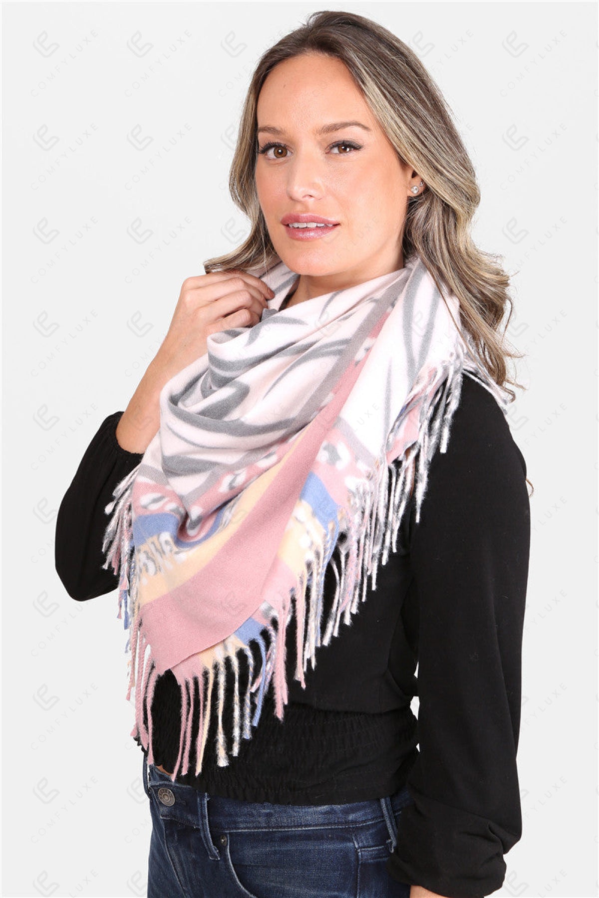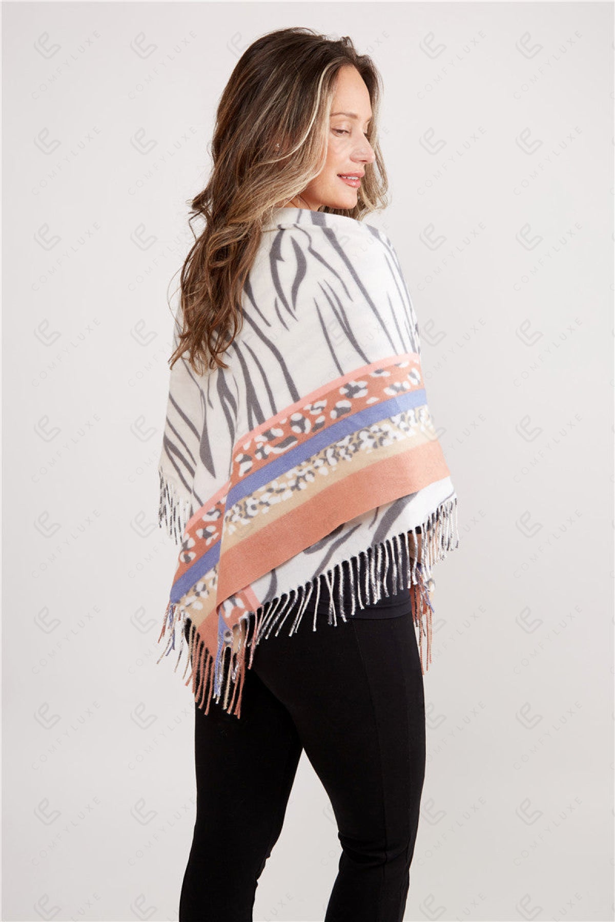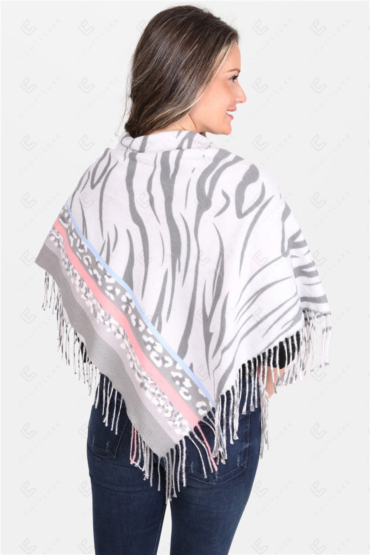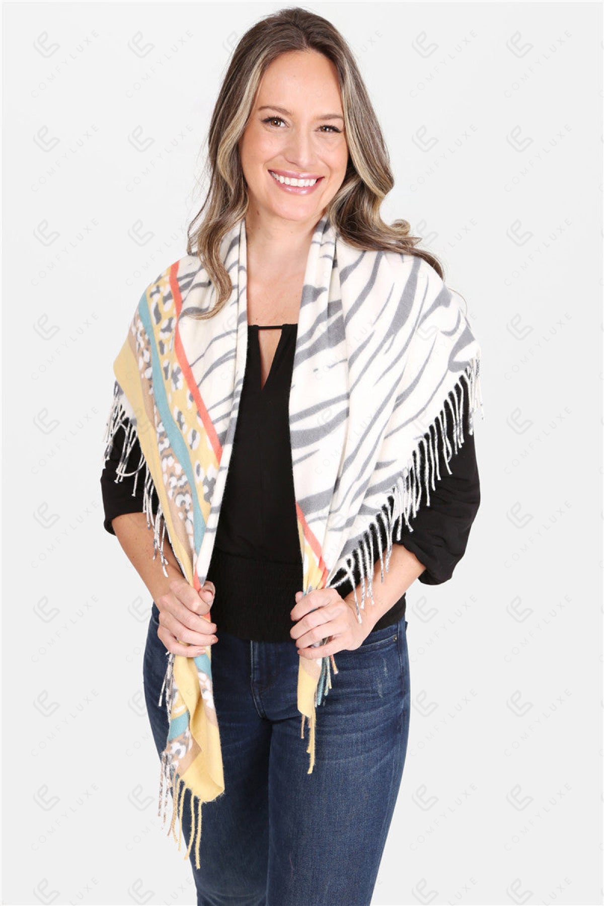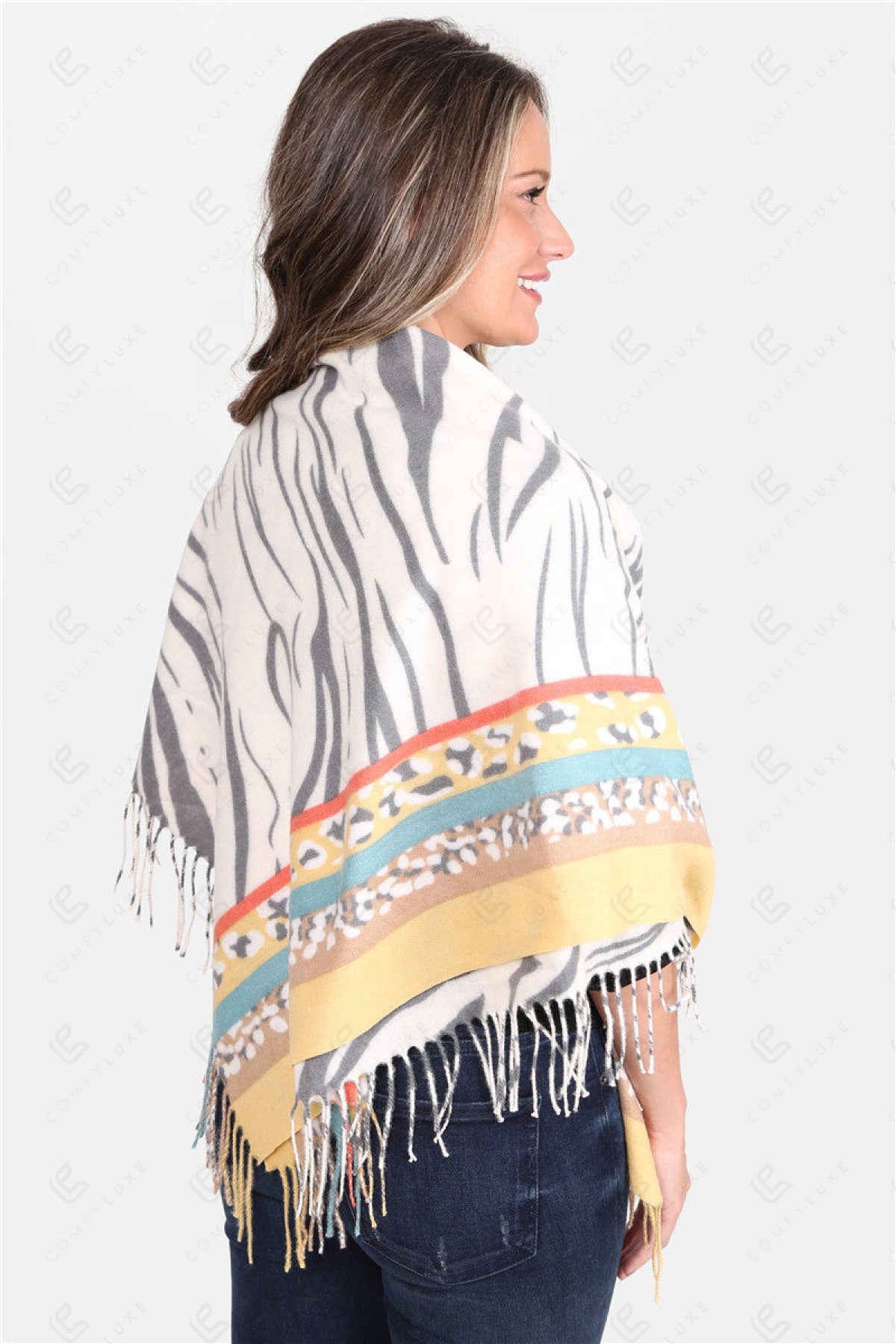 MIXED ANIMAL PATTERN BLANKET SCARF W/ FRINGE