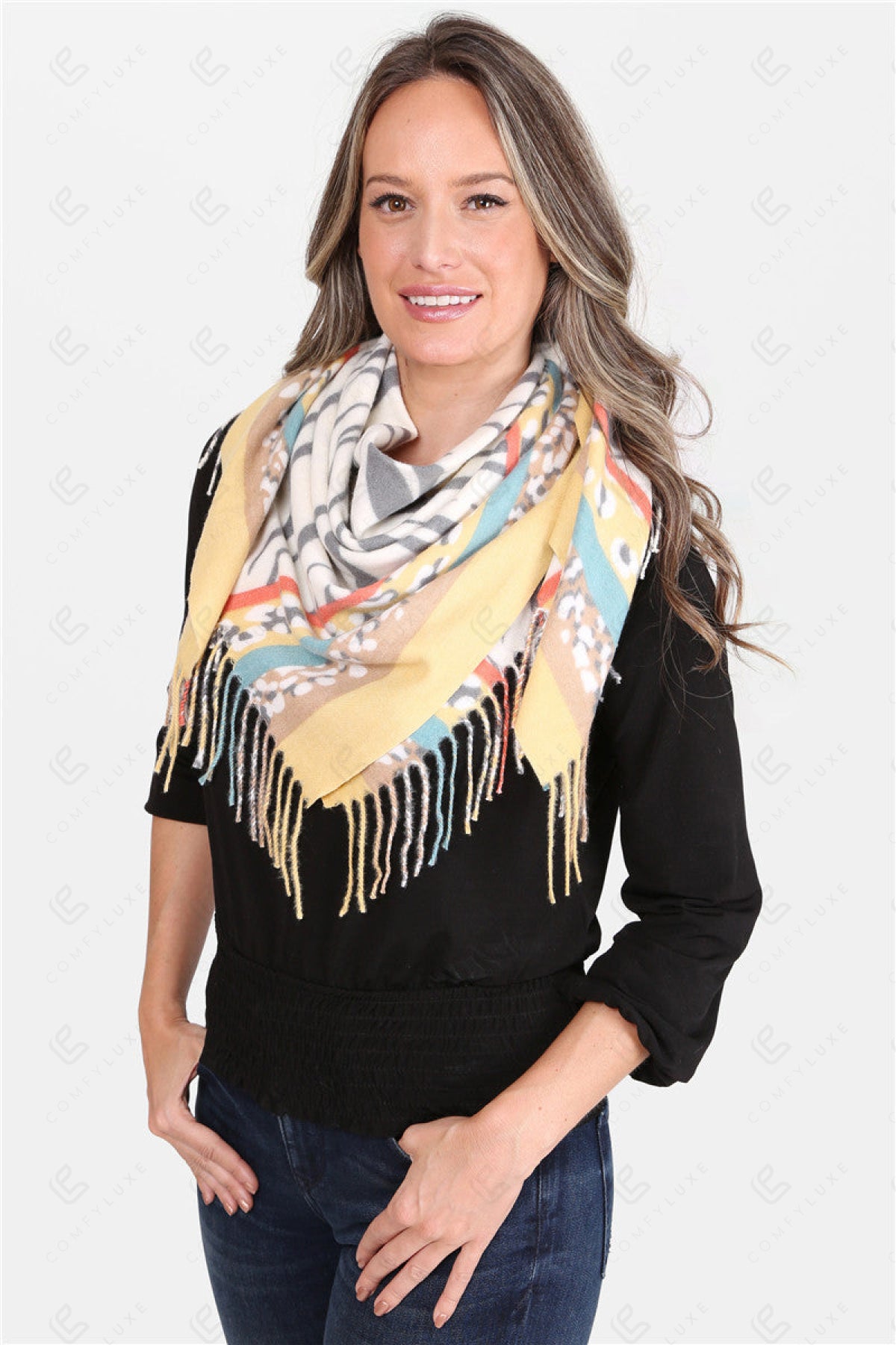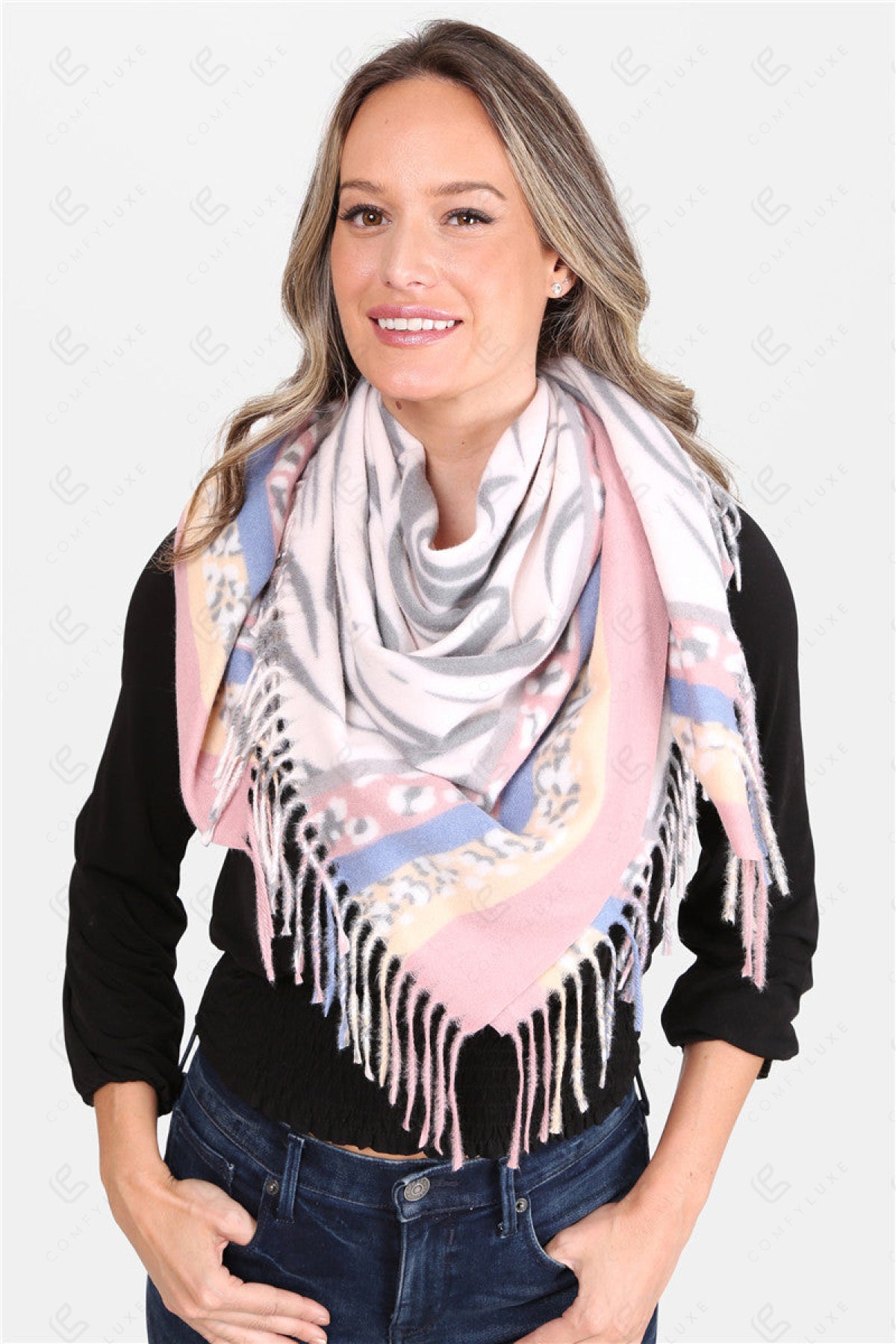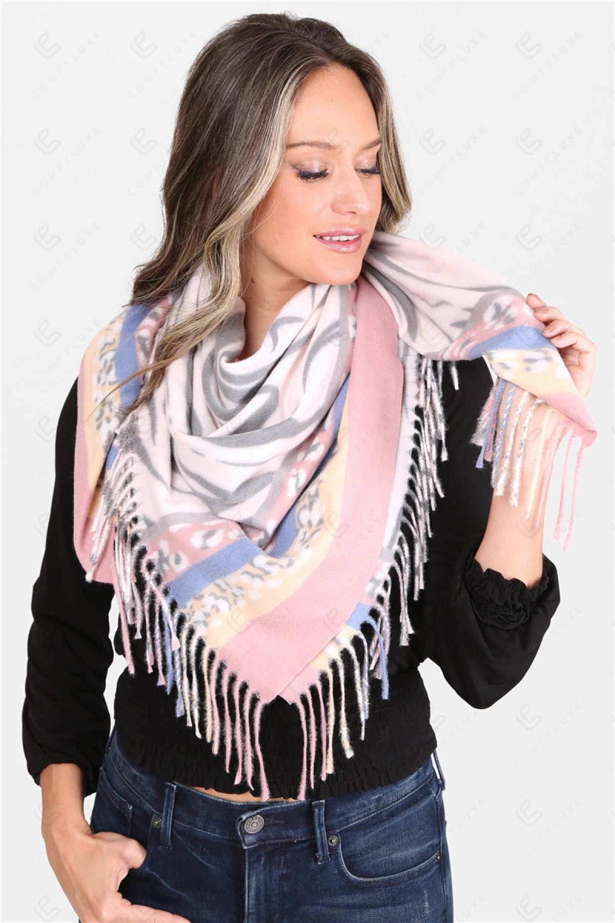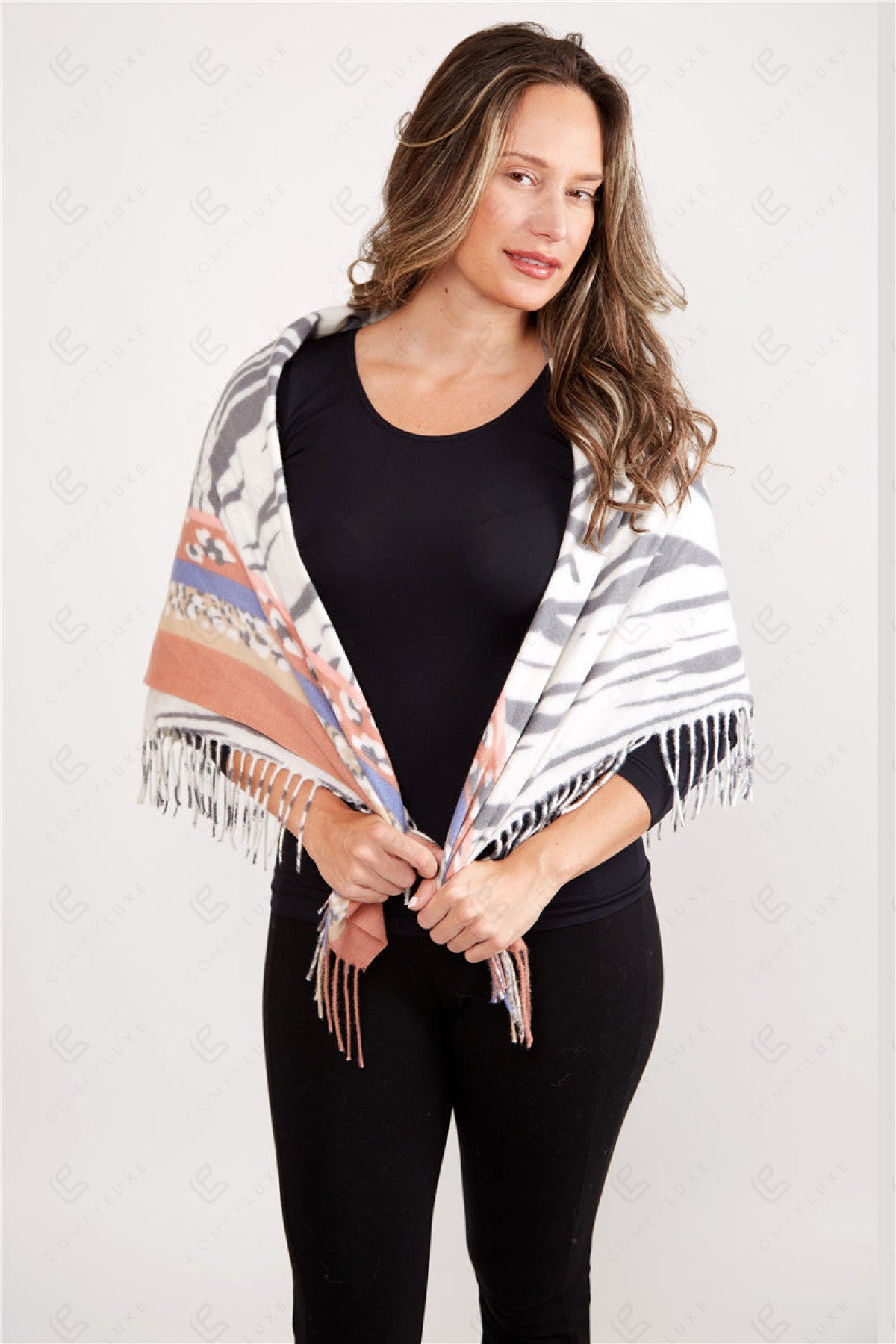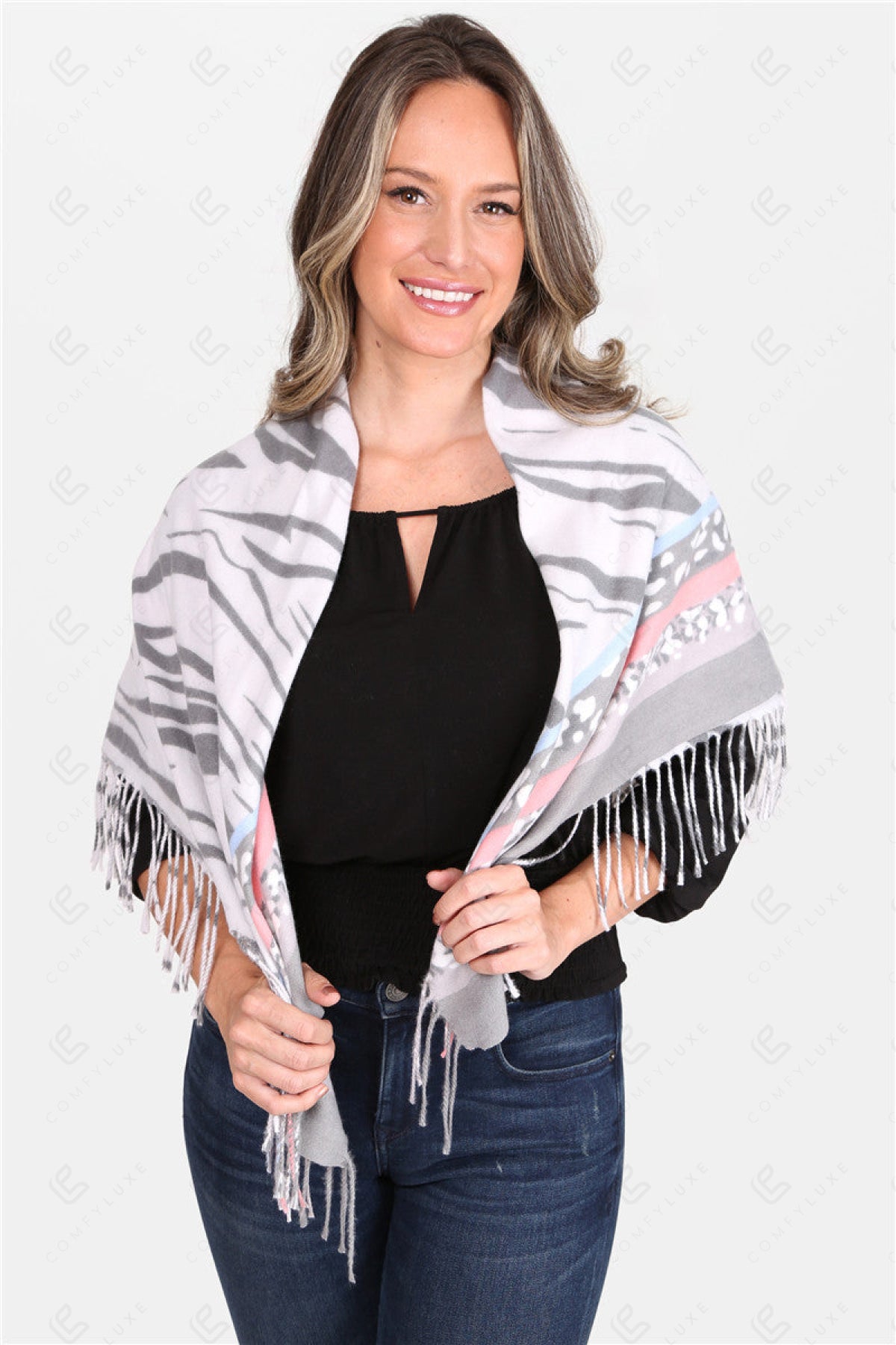 MIXED ANIMAL PATTERN BLANKET SCARF W/ FRINGE