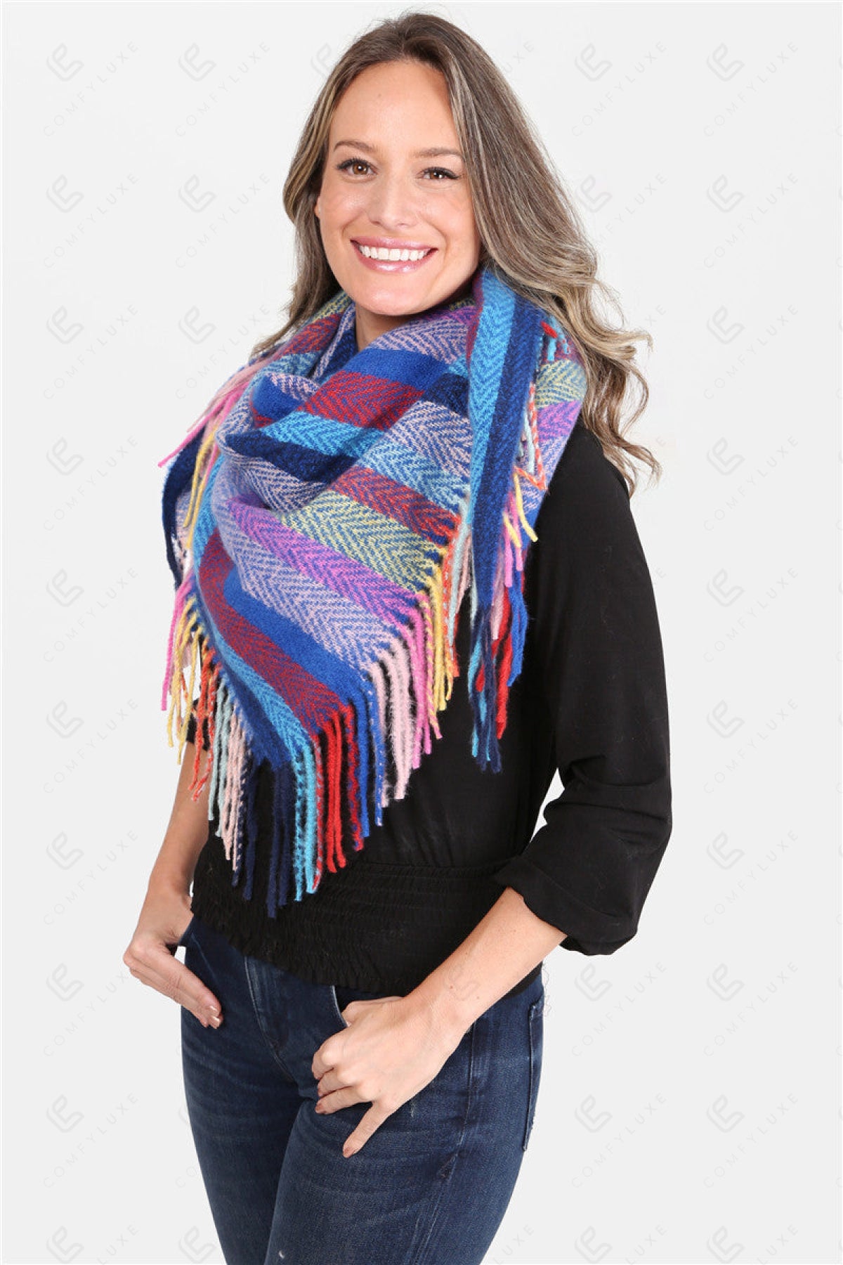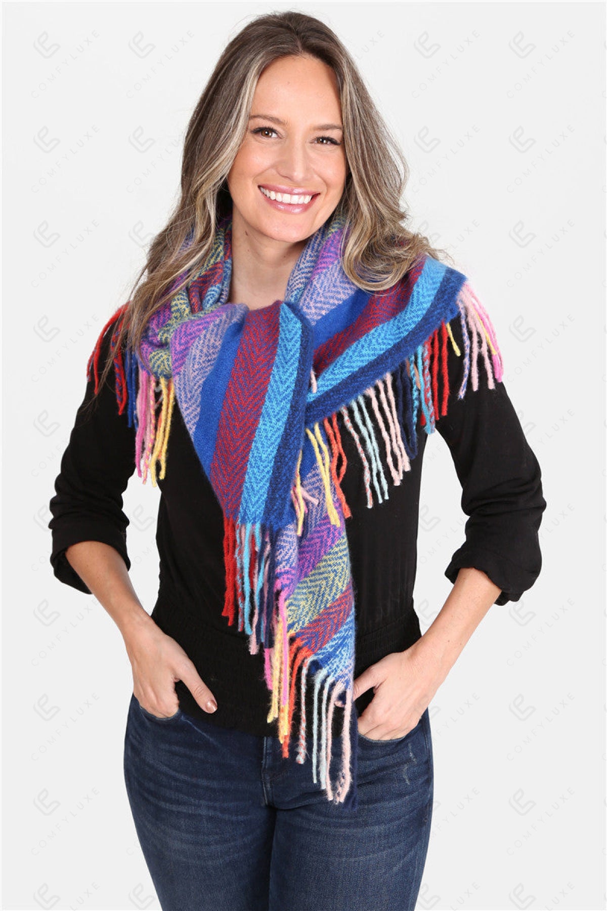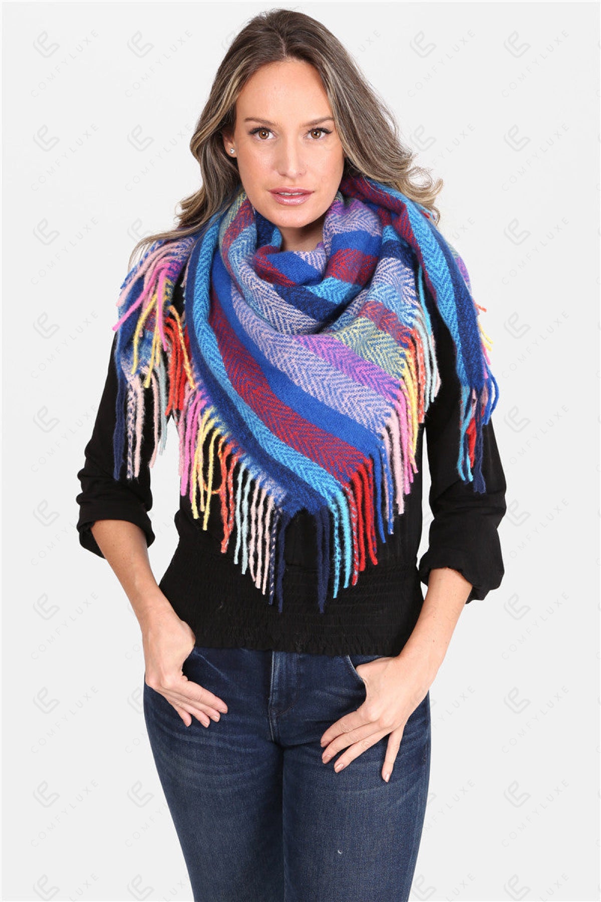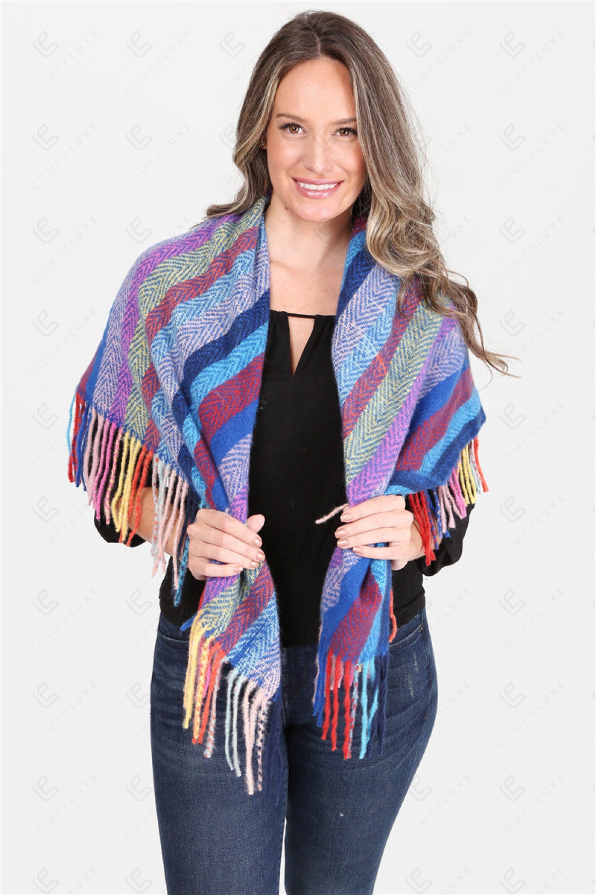 MULTI-COLORED STRIPED PATTERN KNITTED BLANKET SCARF W/ FRINGE