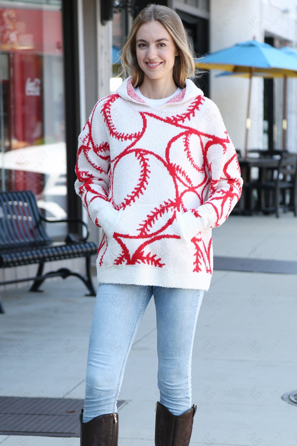 BASEBALL PATTERN LUXURY SOFT V-NECK, LONG-SLEEVED, SHORT HOODIE W/ POCKET