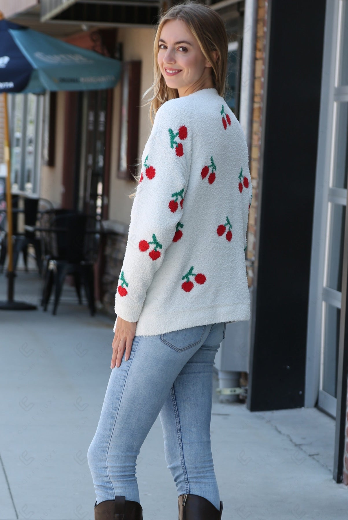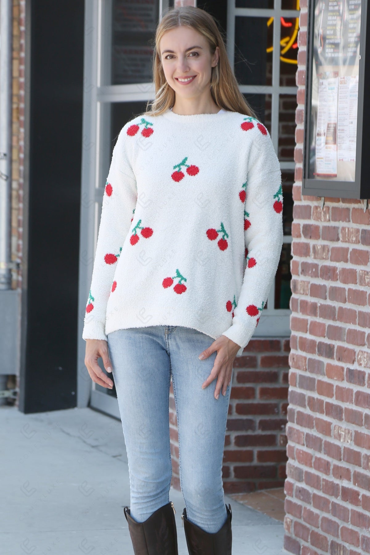CHERRY PATTERN LUXURY SOFT CREW NECK, LONG-SLEEVED, SHORT SWEATER