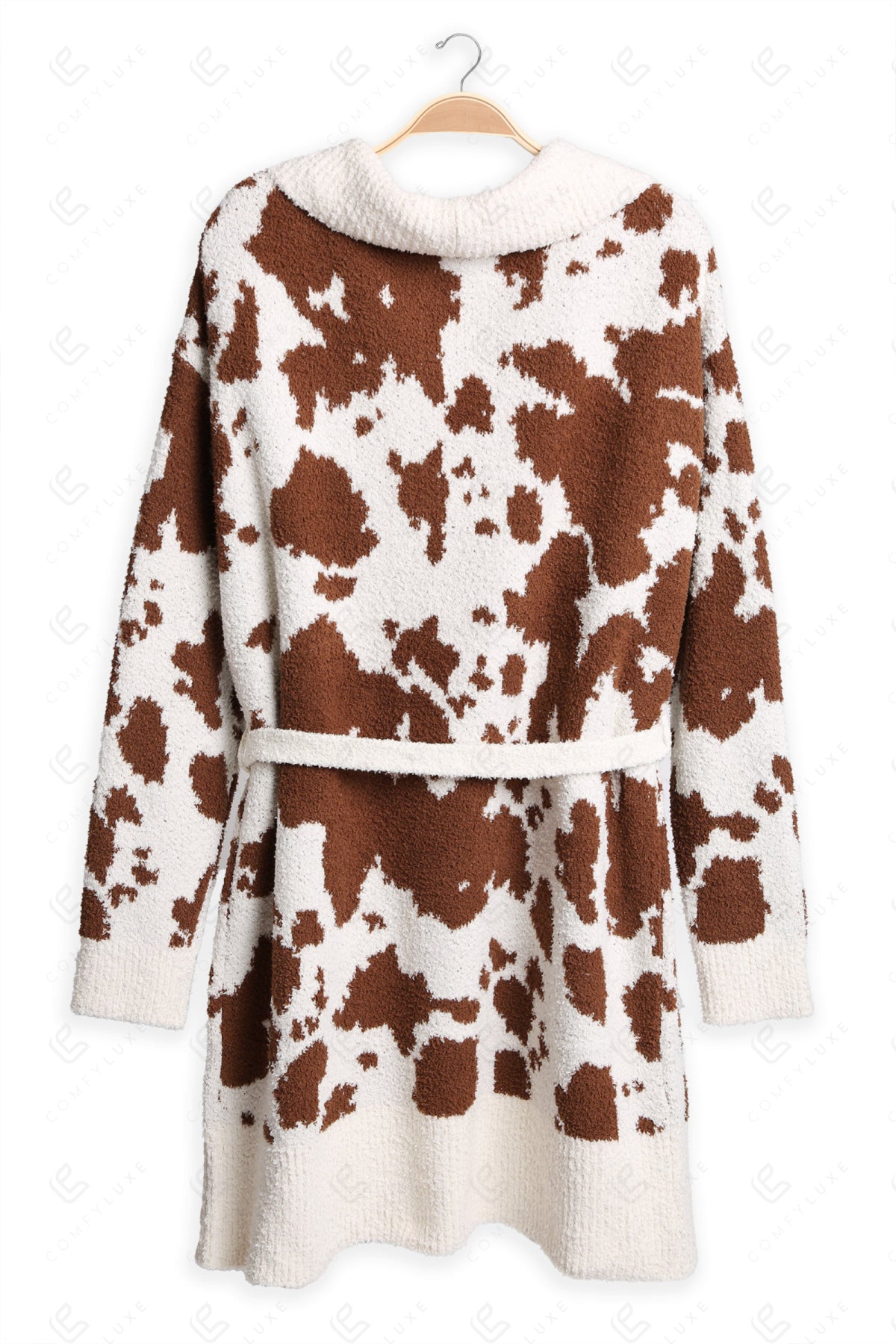 COW PATTERN LUXURY SOFT SHAWL COLLAR, LONG-SLEEVED, MID-LENGTH ROBE W/ RIBBED EDGES, BELT & POCKETS