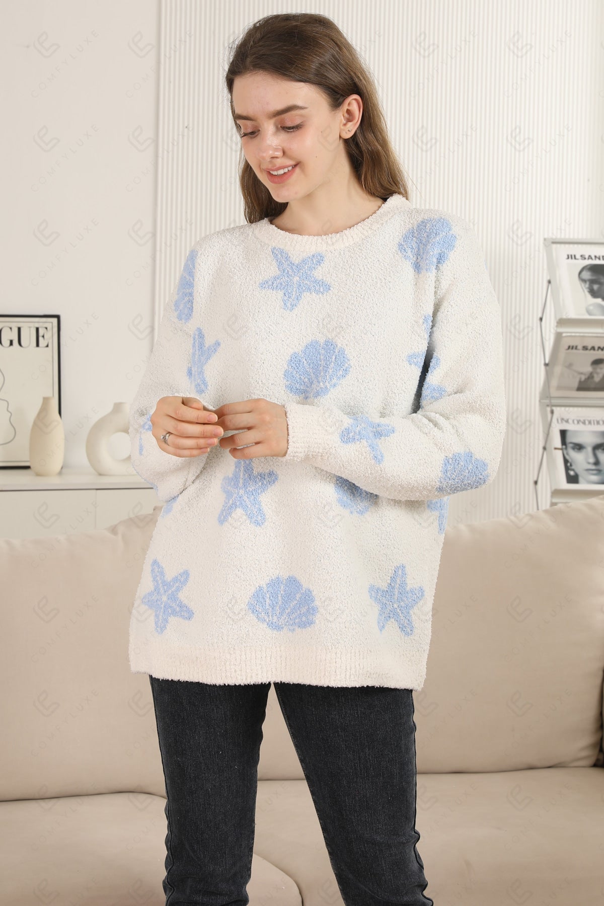 SEASHELL & STARFISH PATTERN LUXURY SOFT CREW NECK, LONG-SLEEVED, SHORT SWEATER