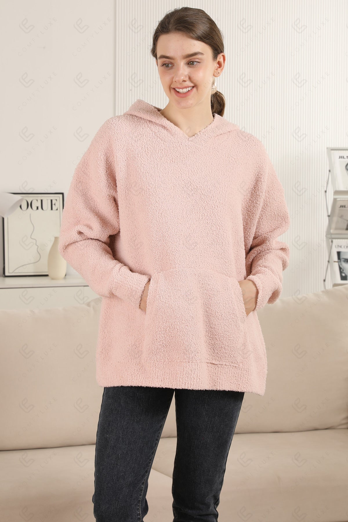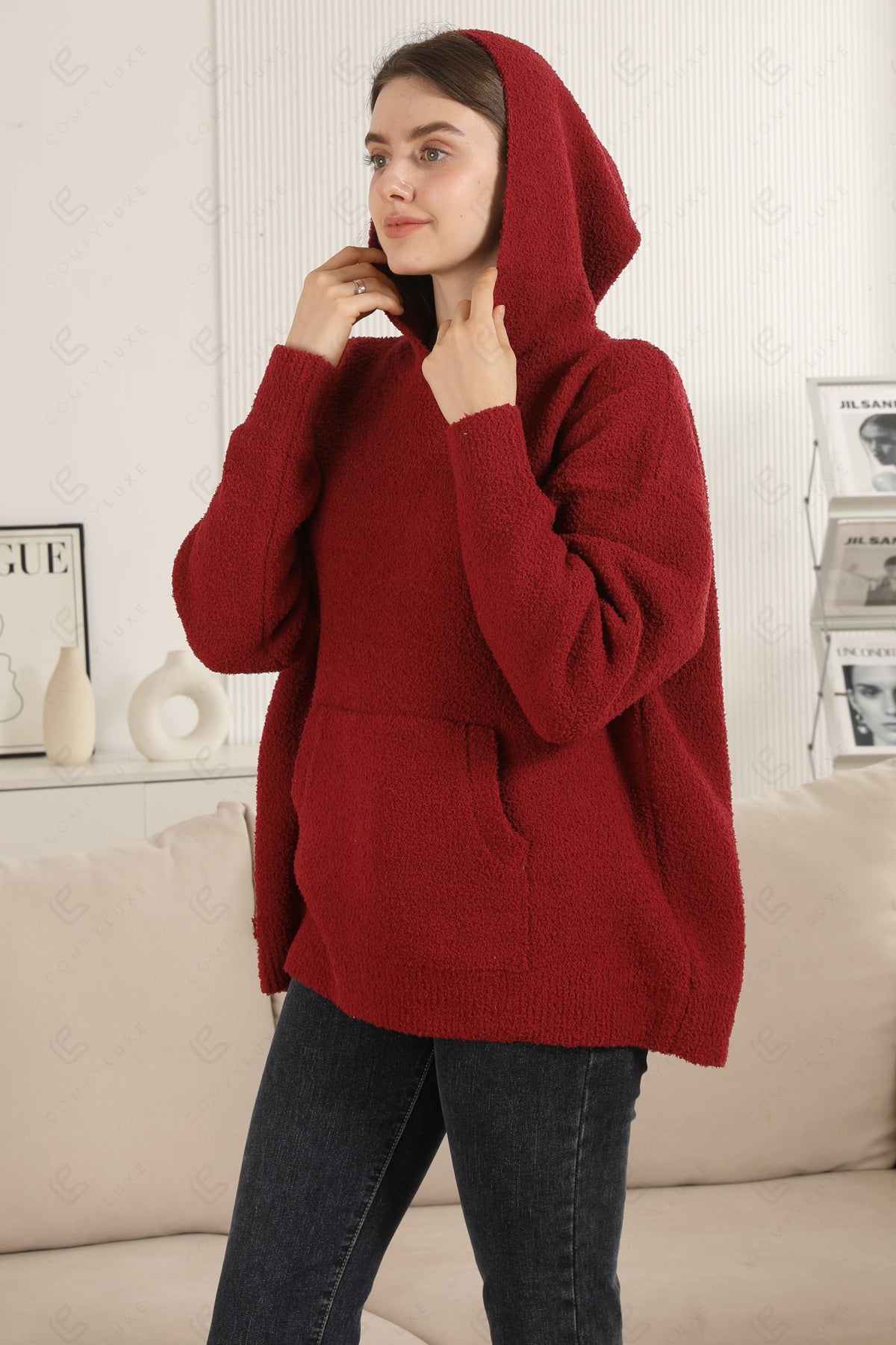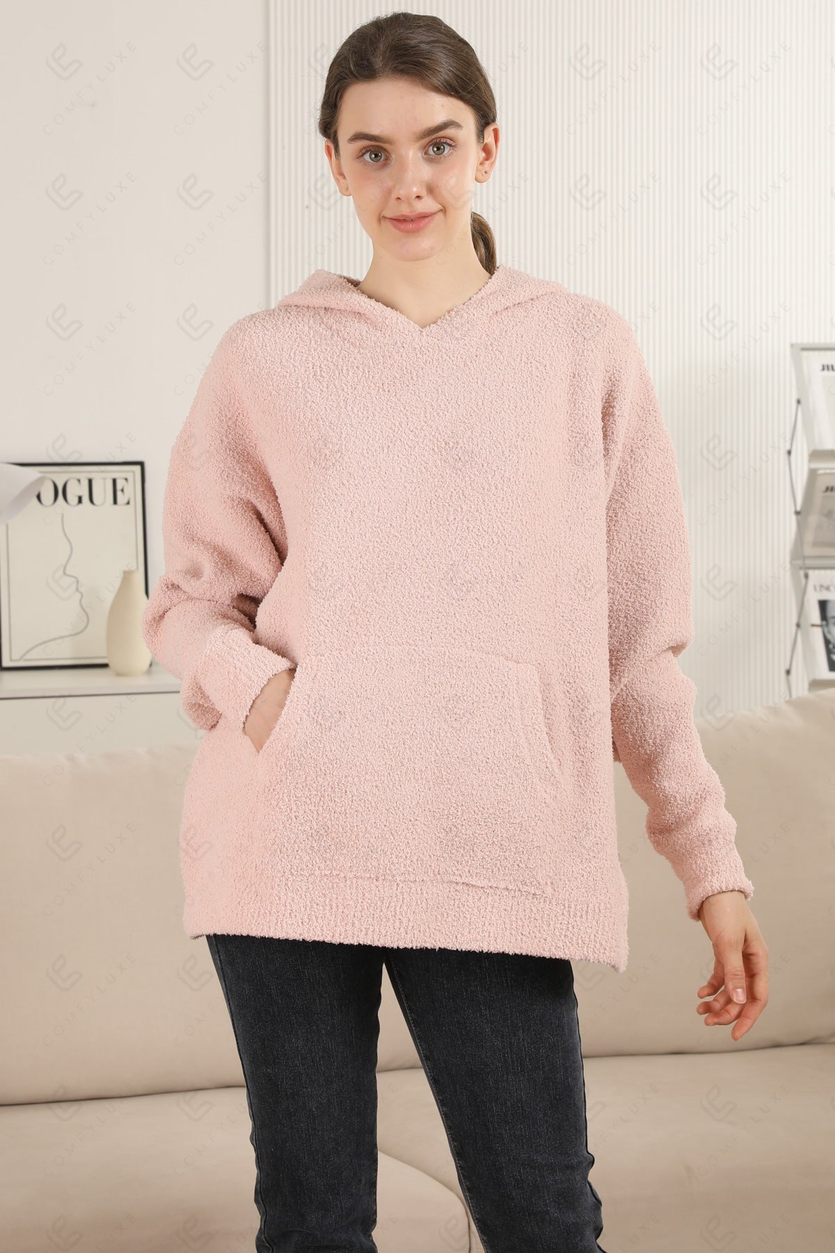 SOLID COLOR LUXURY SOFT V-NECK, LONG-SLEEVED, SHORT HOODIE W/ POCKET