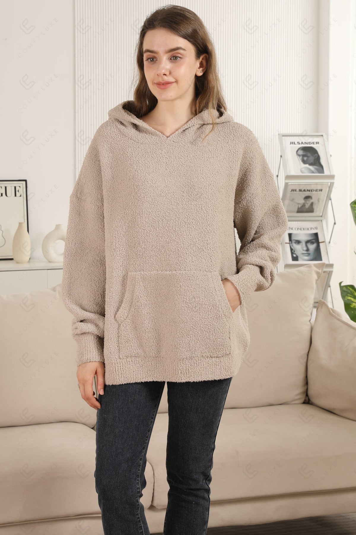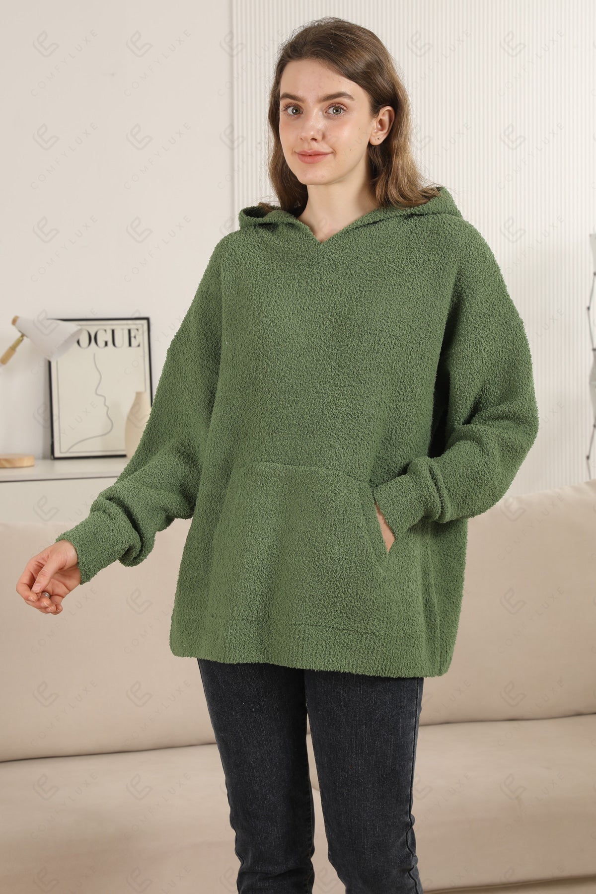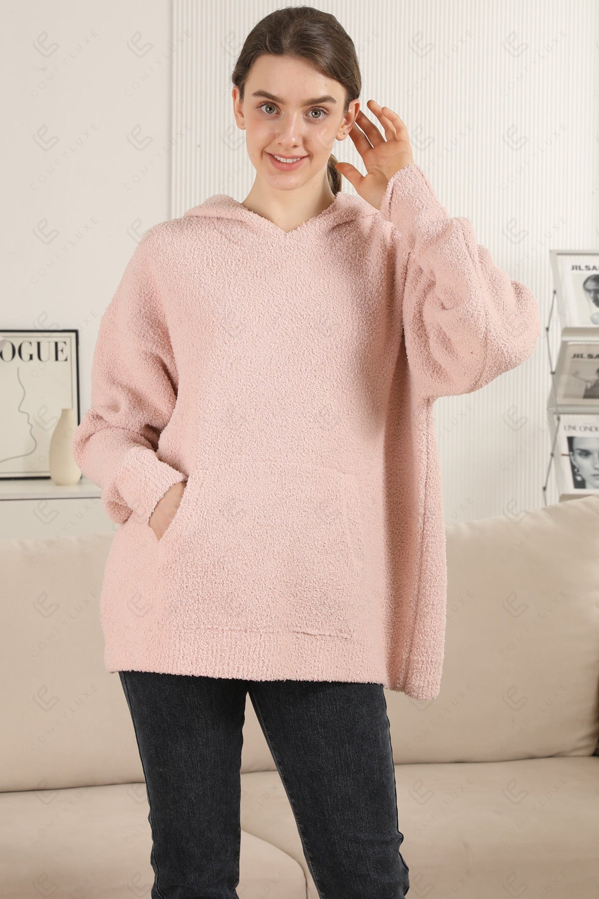 SOLID COLOR LUXURY SOFT V-NECK, LONG-SLEEVED, SHORT HOODIE W/ POCKET