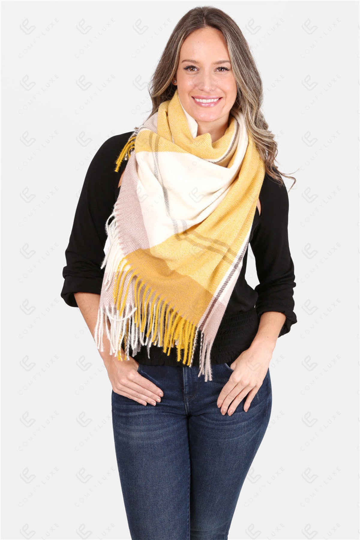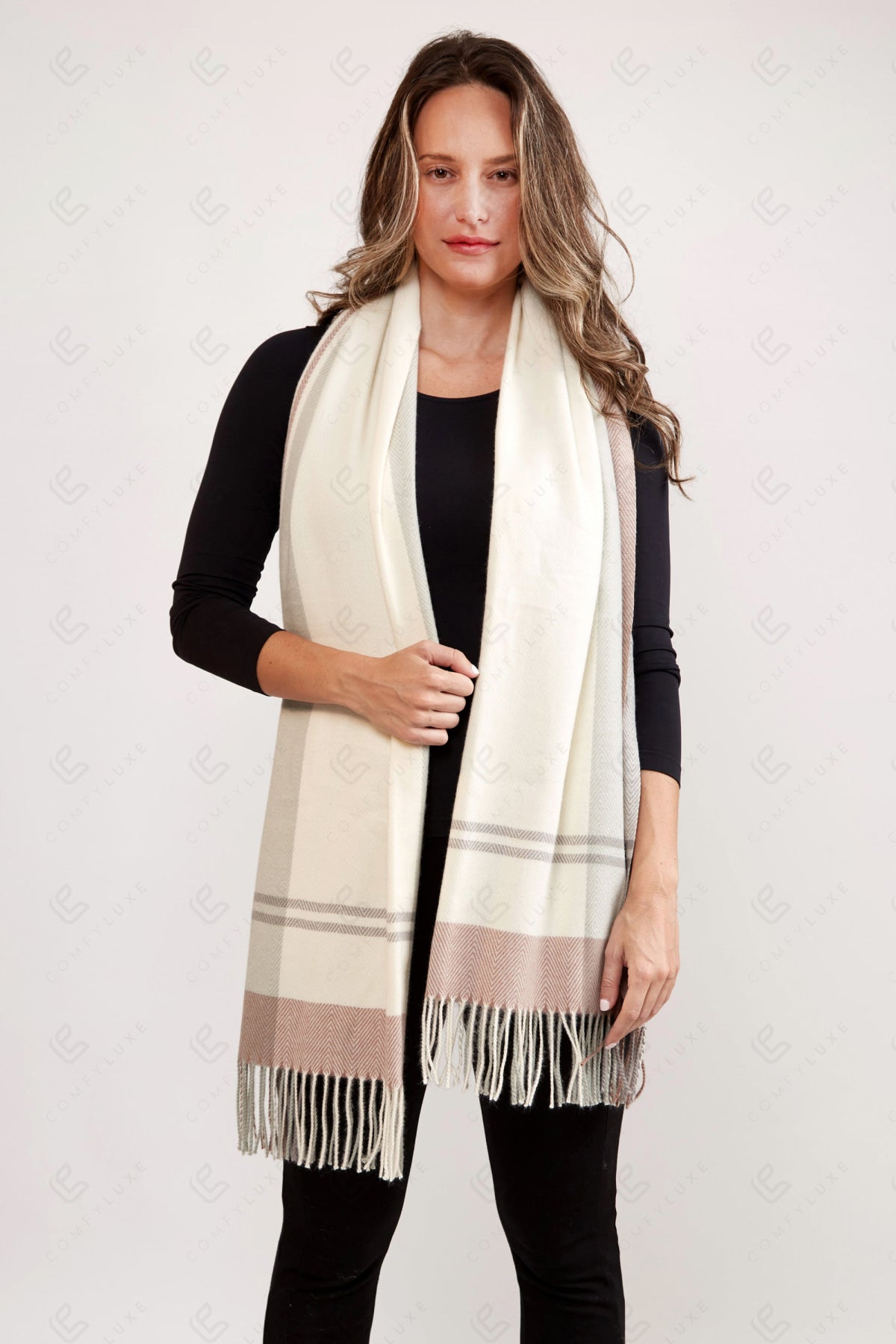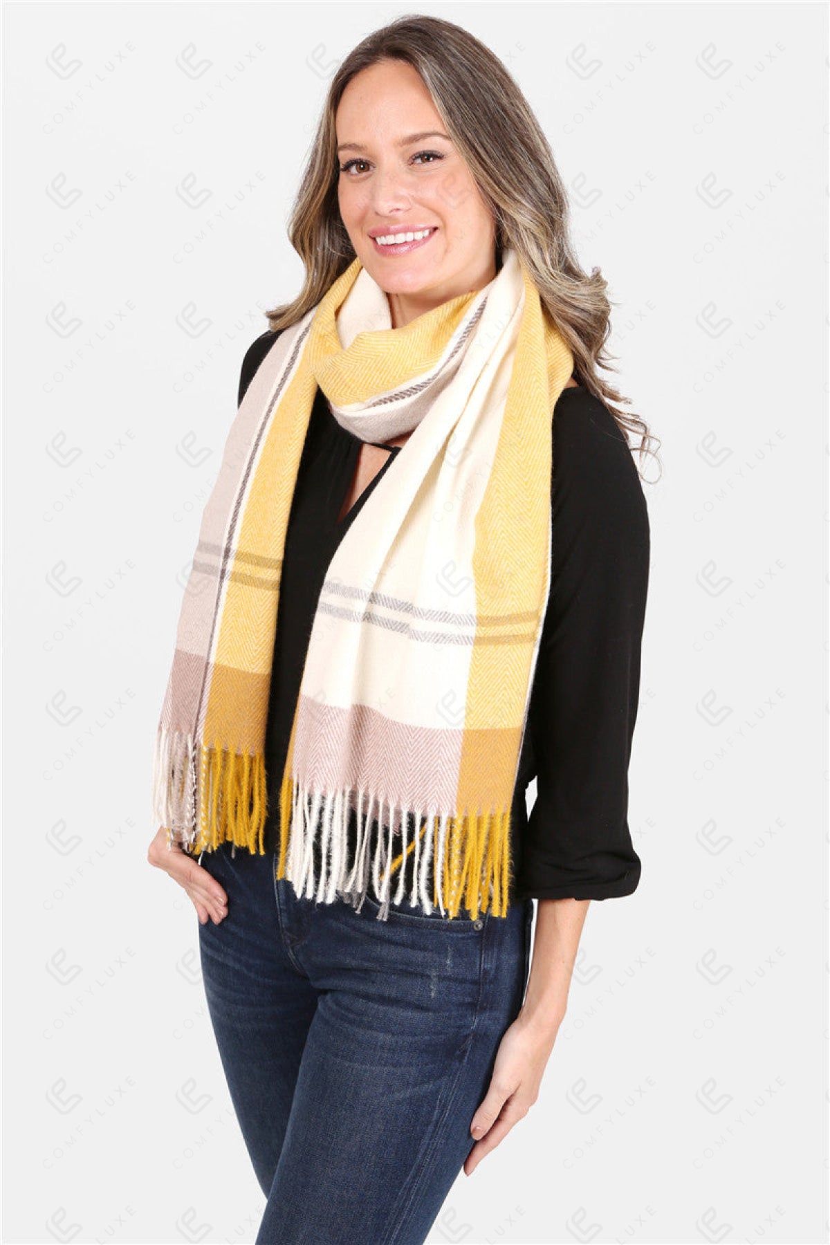 PLAID PATTERN KNITTED OBLONG SCARF W/ FRINGE
