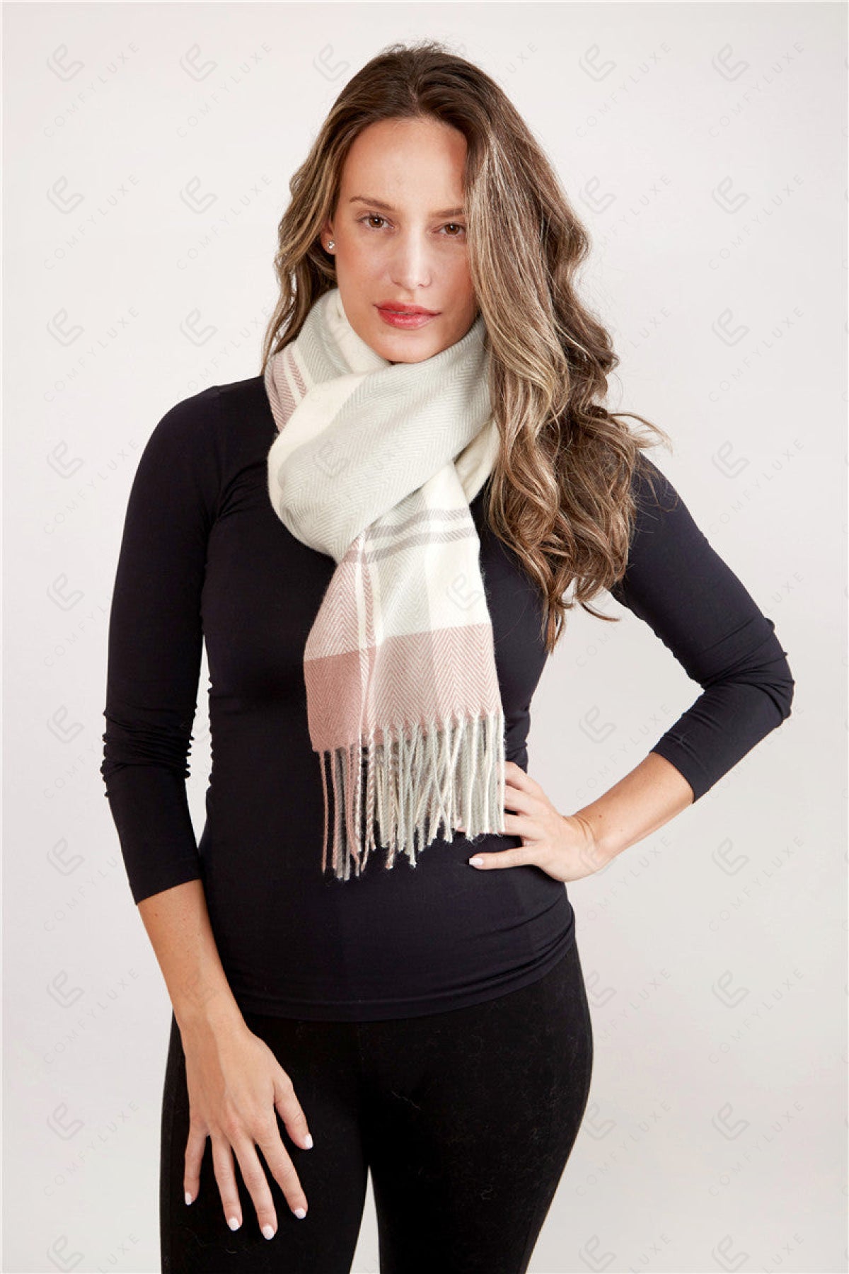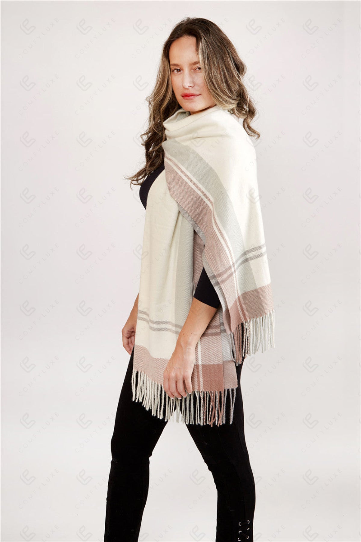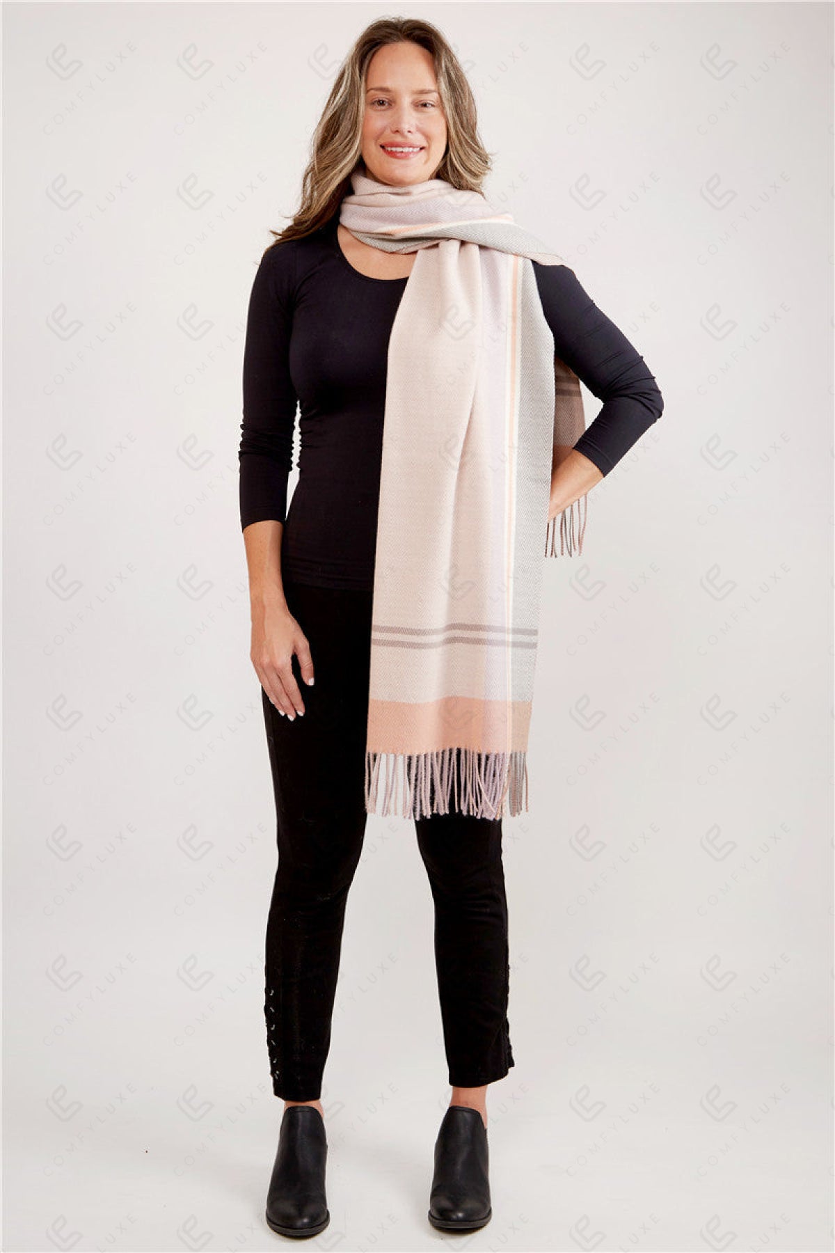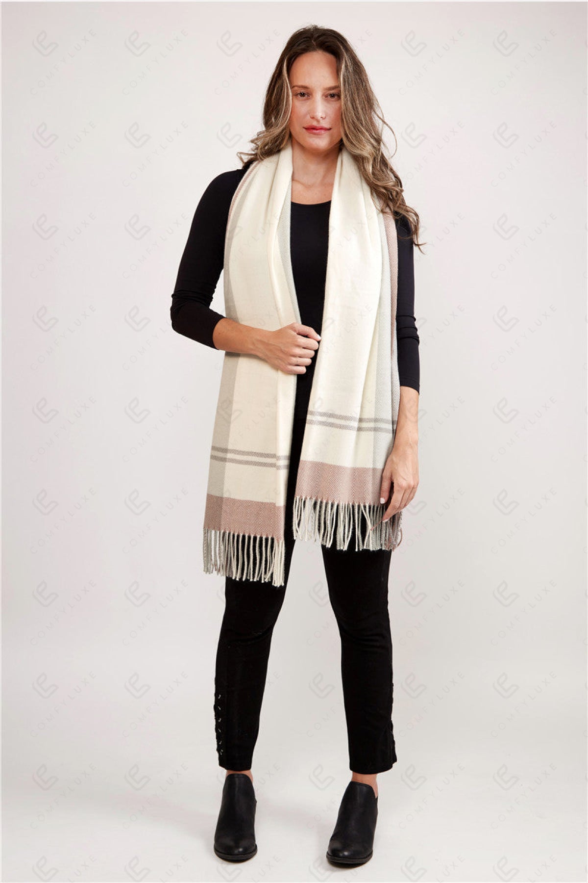 PLAID PATTERN KNITTED OBLONG SCARF W/ FRINGE
