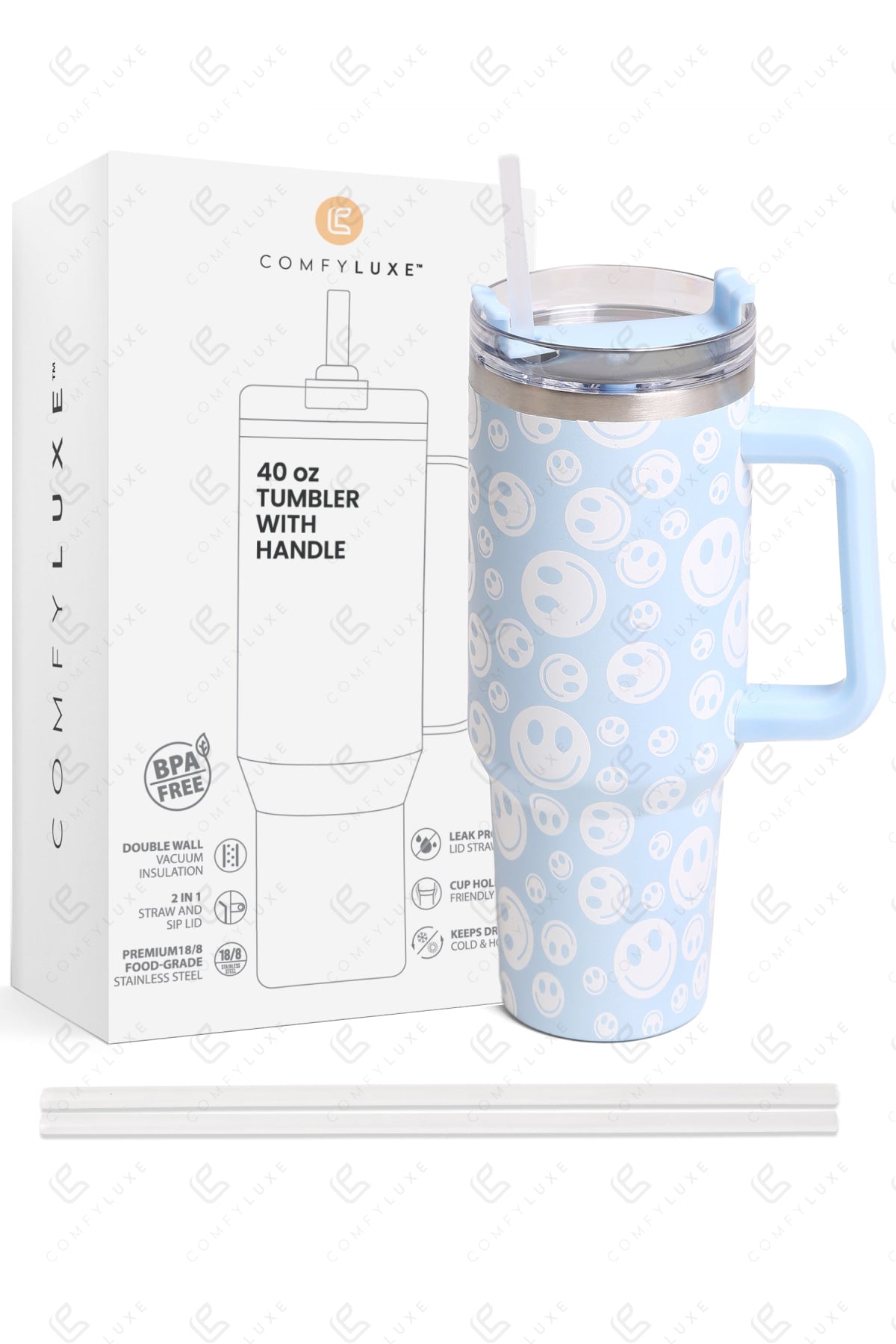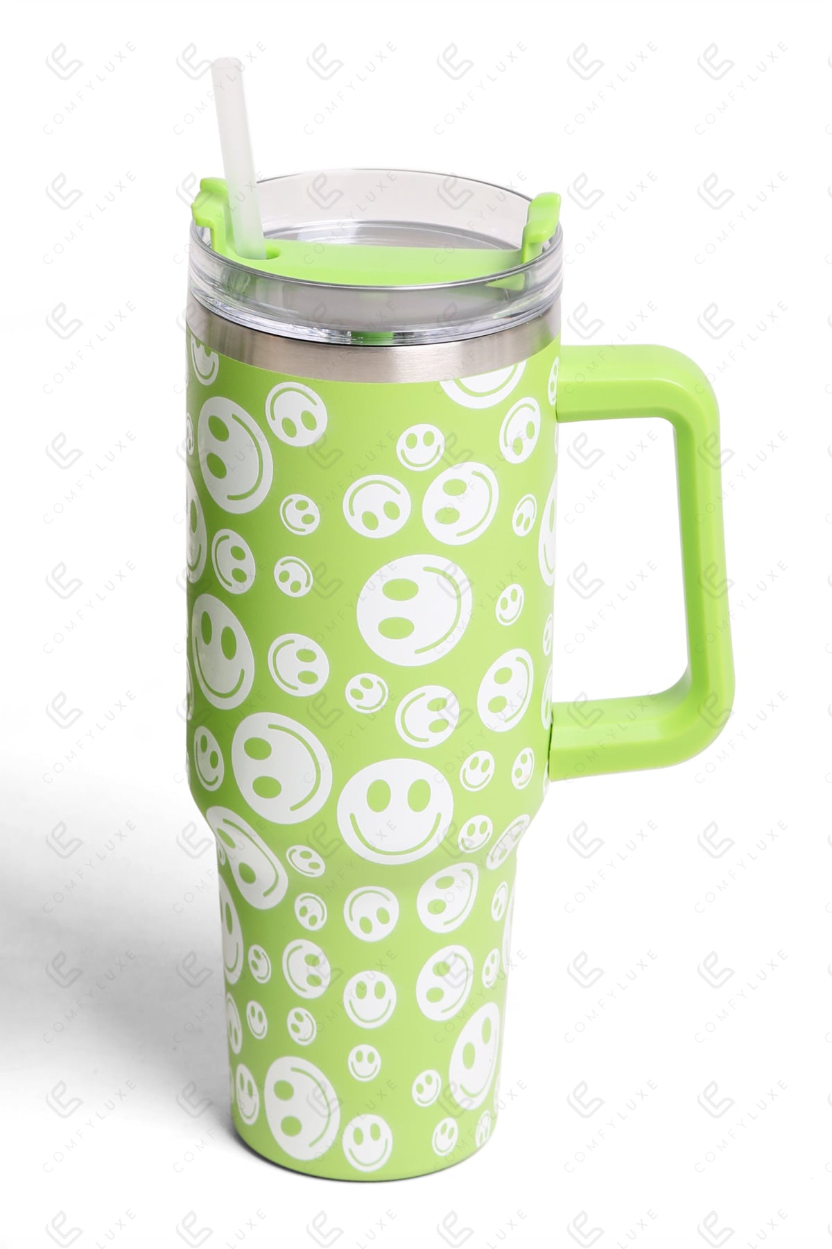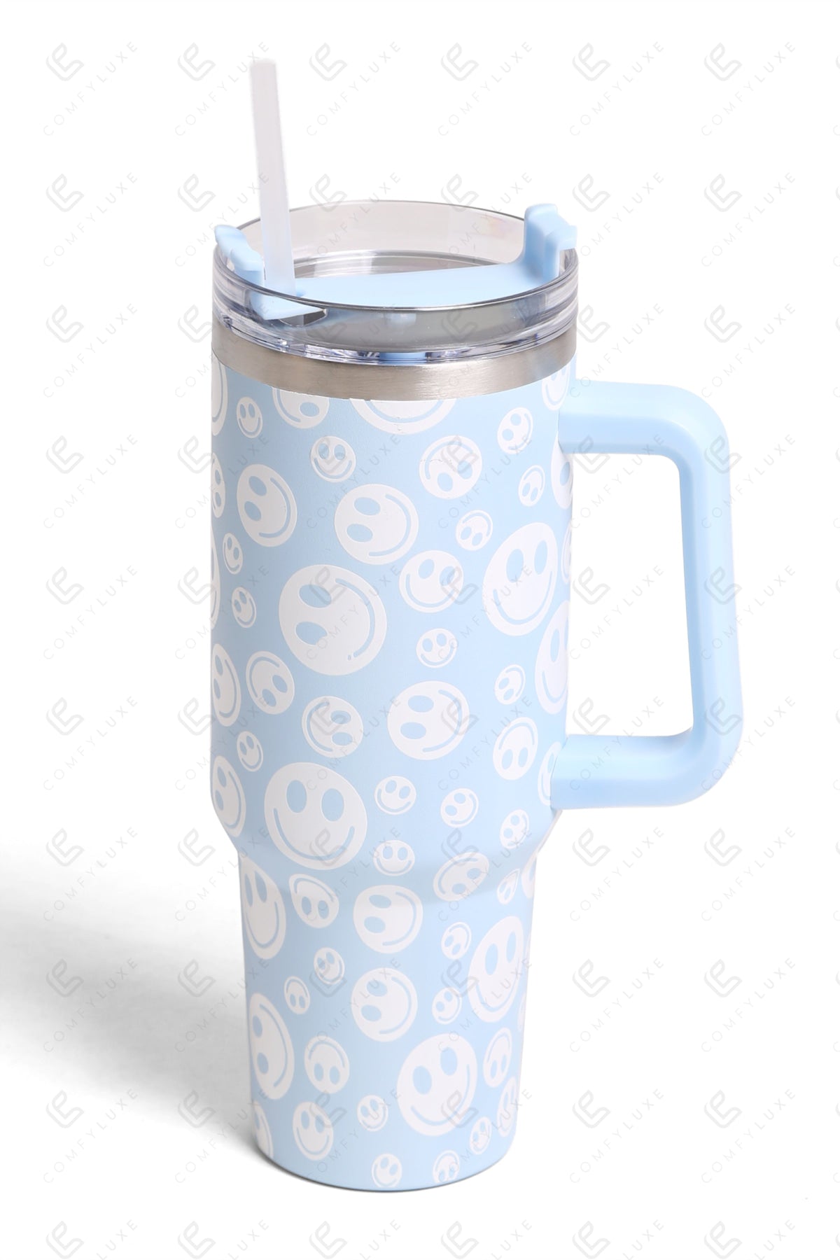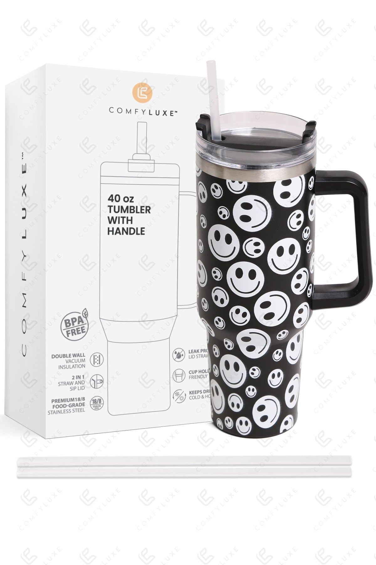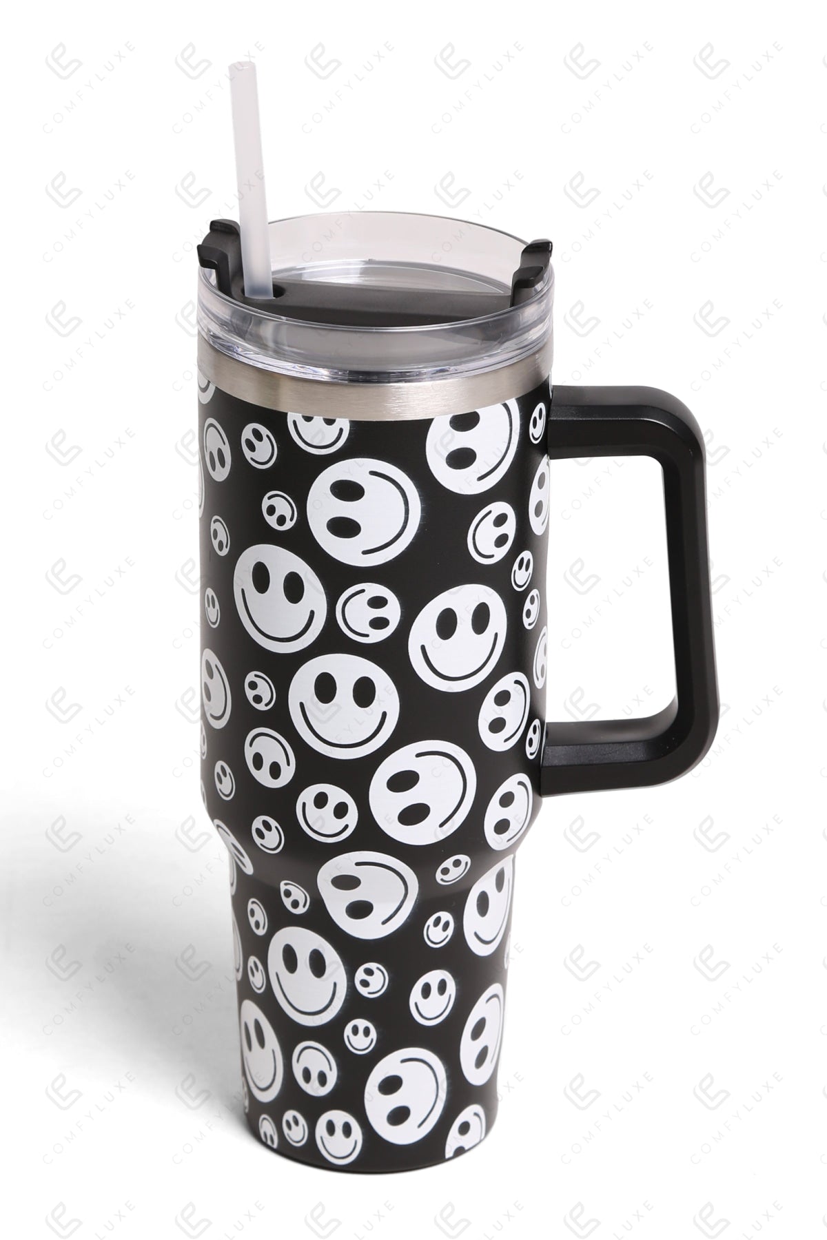 HAPPY FACE PATTERN 40 oz DOUBLE WALLED STAINLESS STEEL TUMBLER W/ HANDLE & STRAWS
