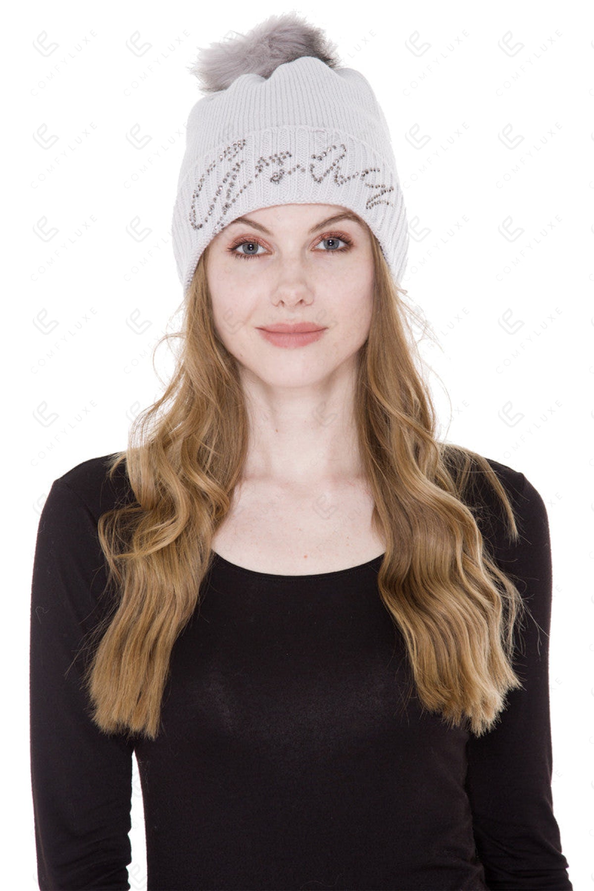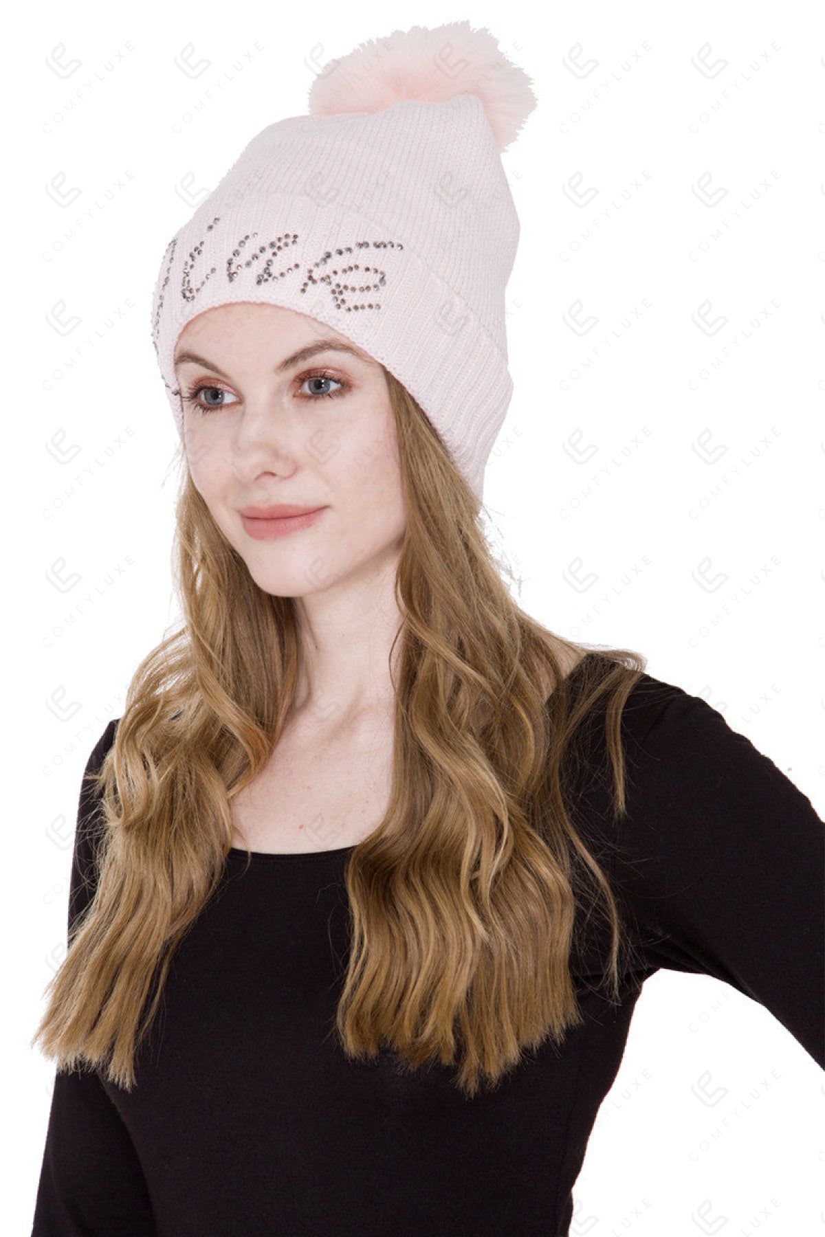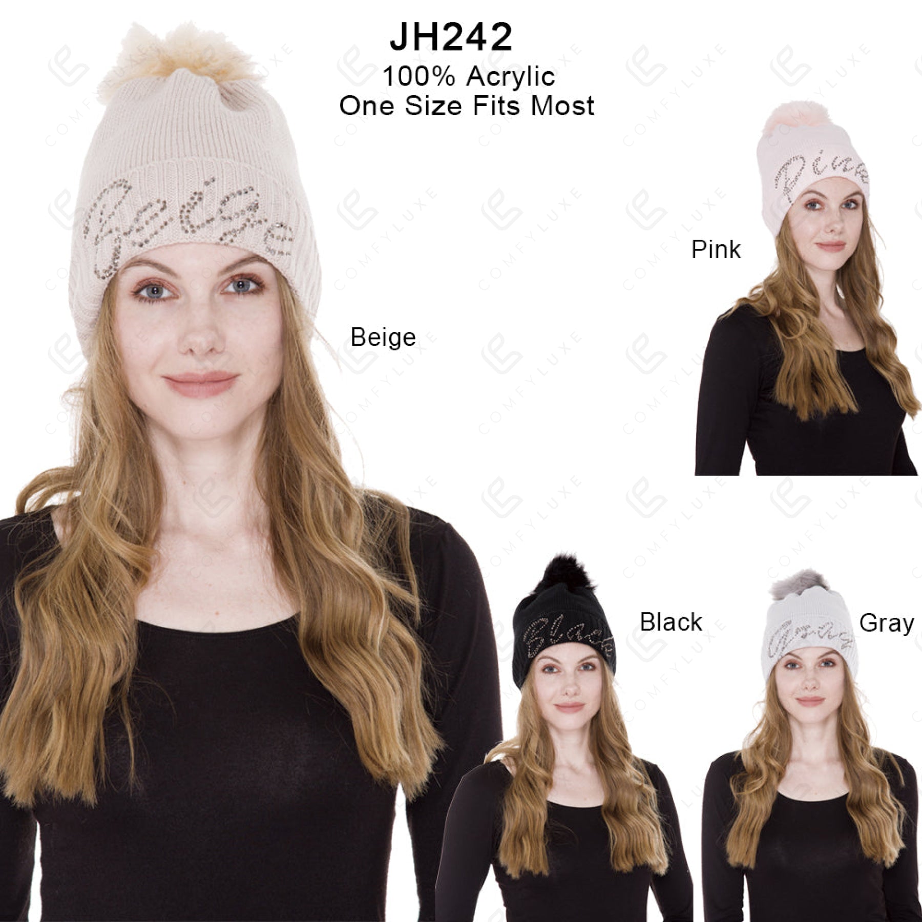 SOLID COLOR & WORDING PATTERN BEANIE W/ RHINESTONE DETAILING, POM-POM TRIM, & SHERPA LINING