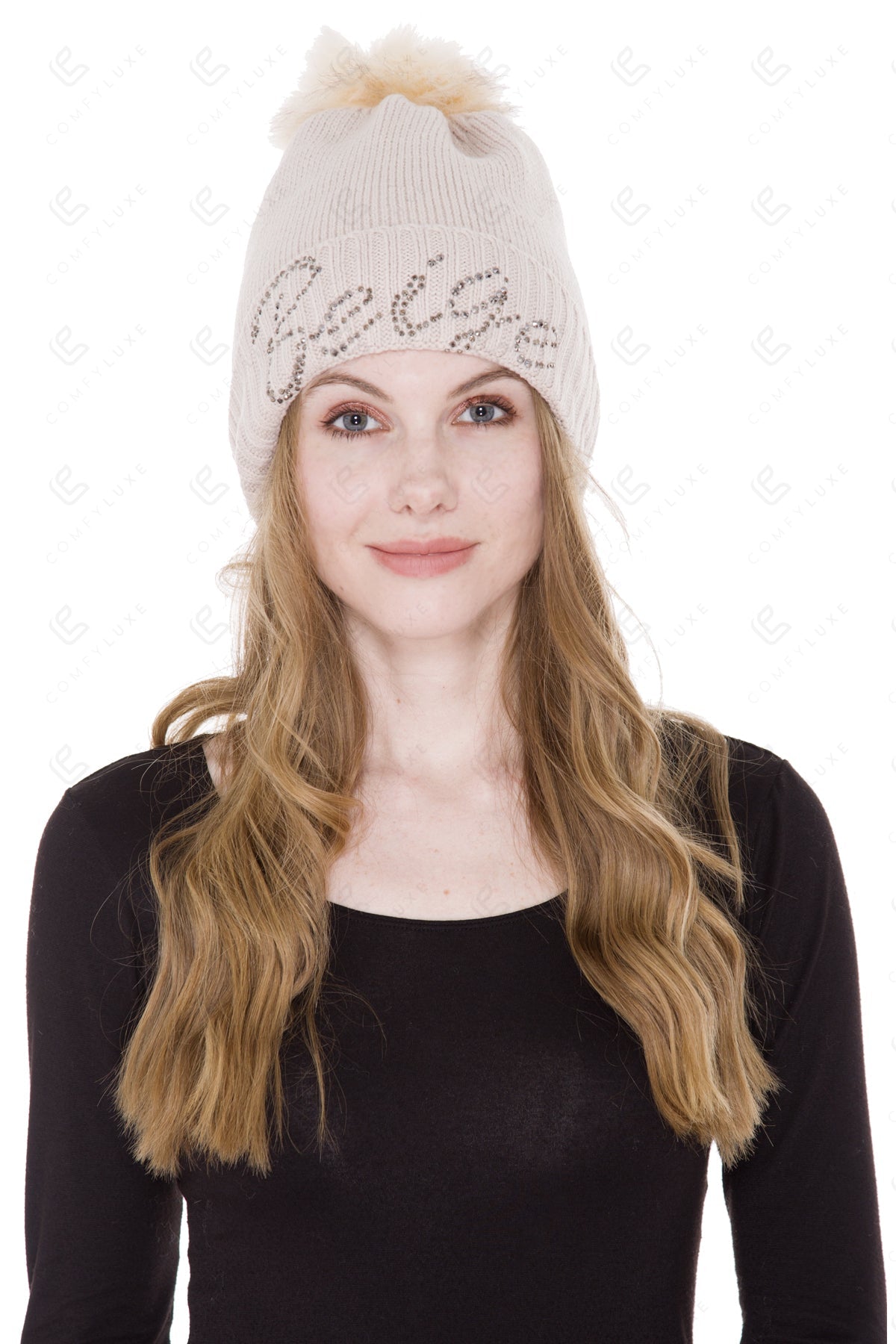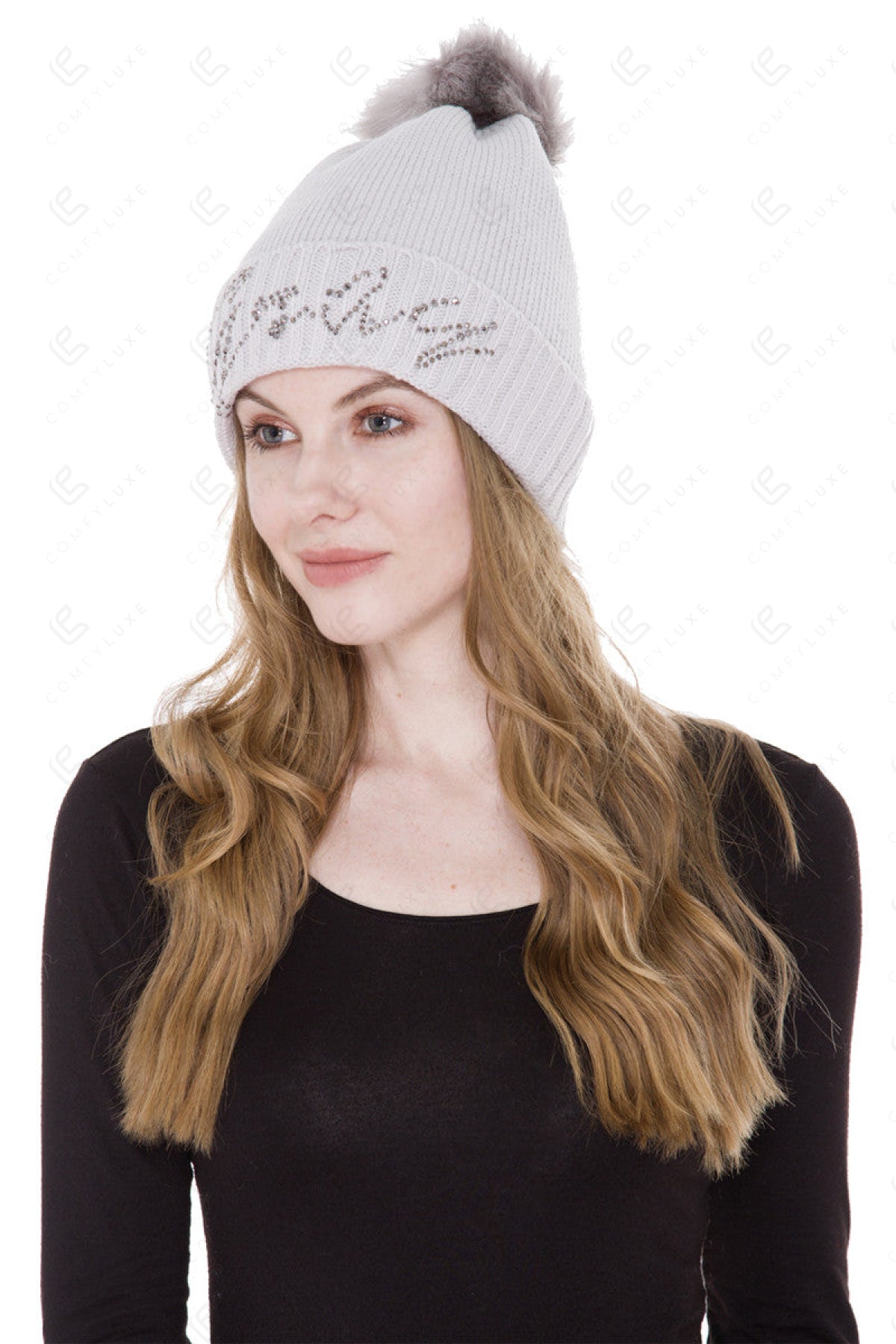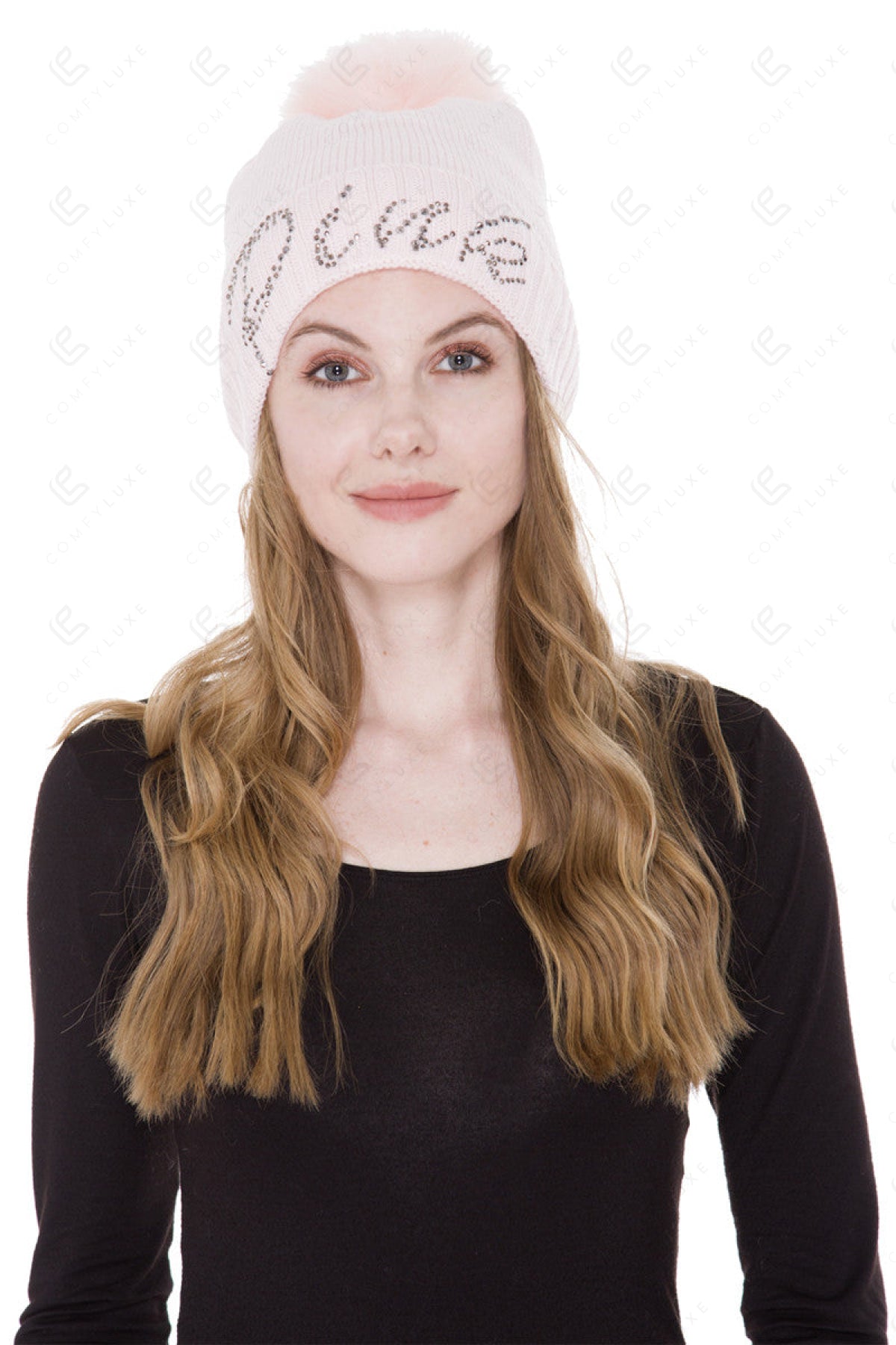 SOLID COLOR & WORDING PATTERN BEANIE W/ RHINESTONE DETAILING, POM-POM TRIM, & SHERPA LINING