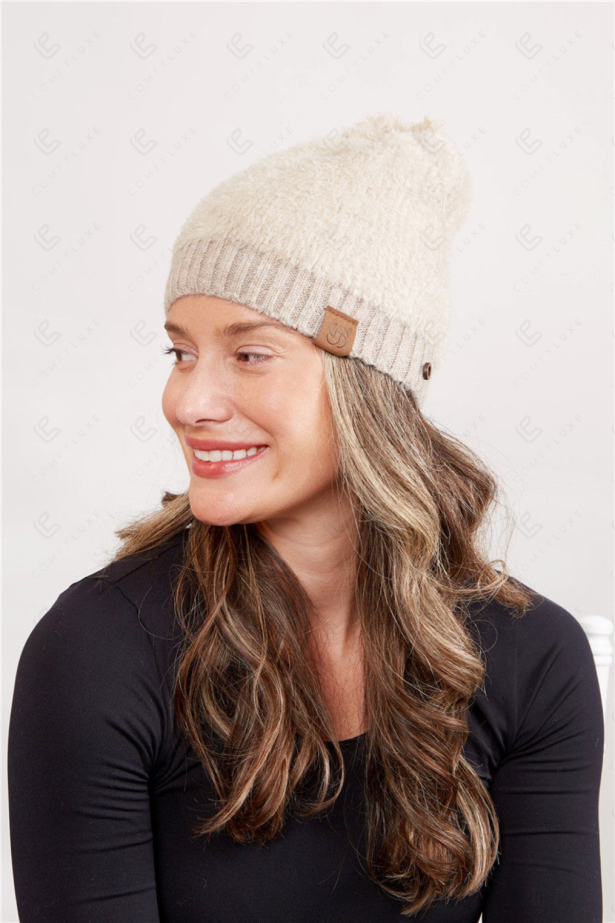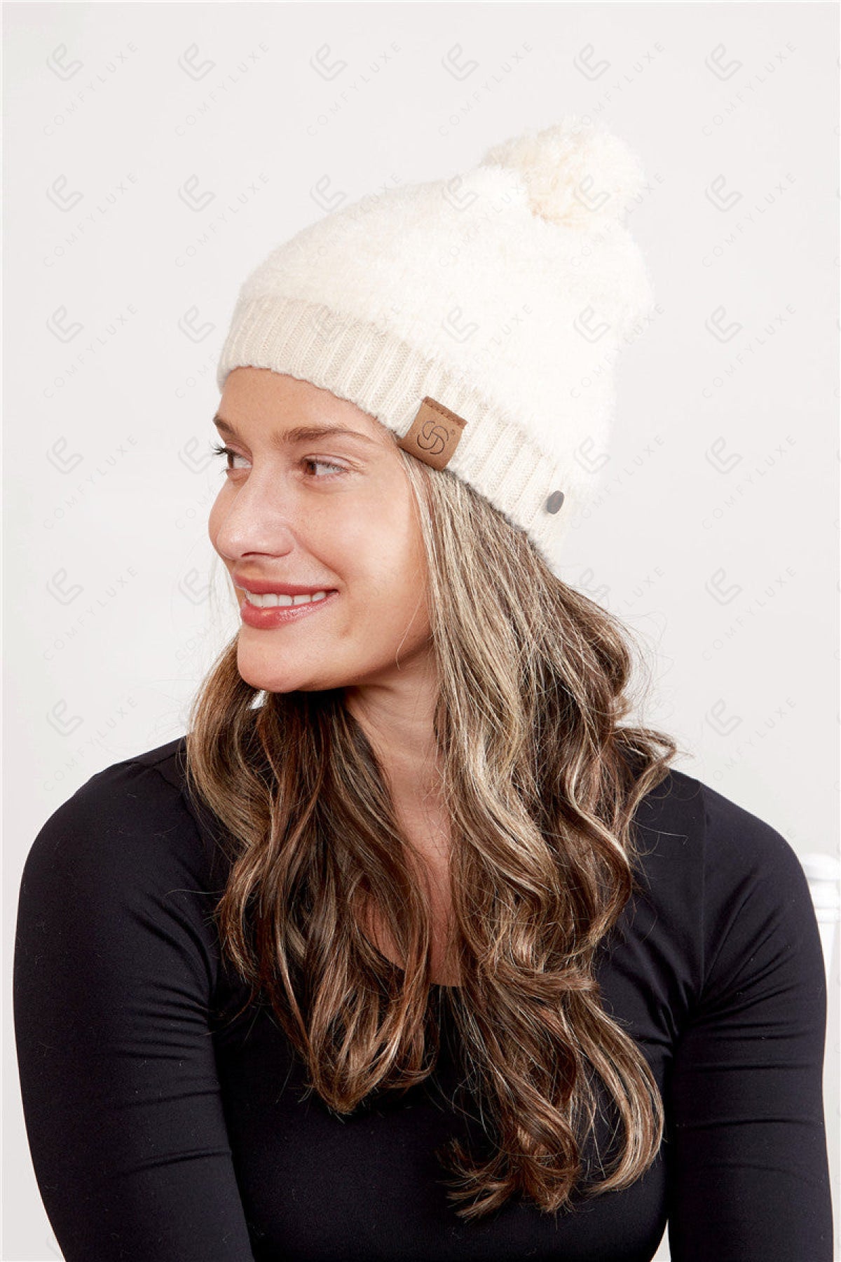 SOLID COLOR KNITTED BEANIE W/ POM-POM, RIBBED TRIM, & BUTTON DETAILING