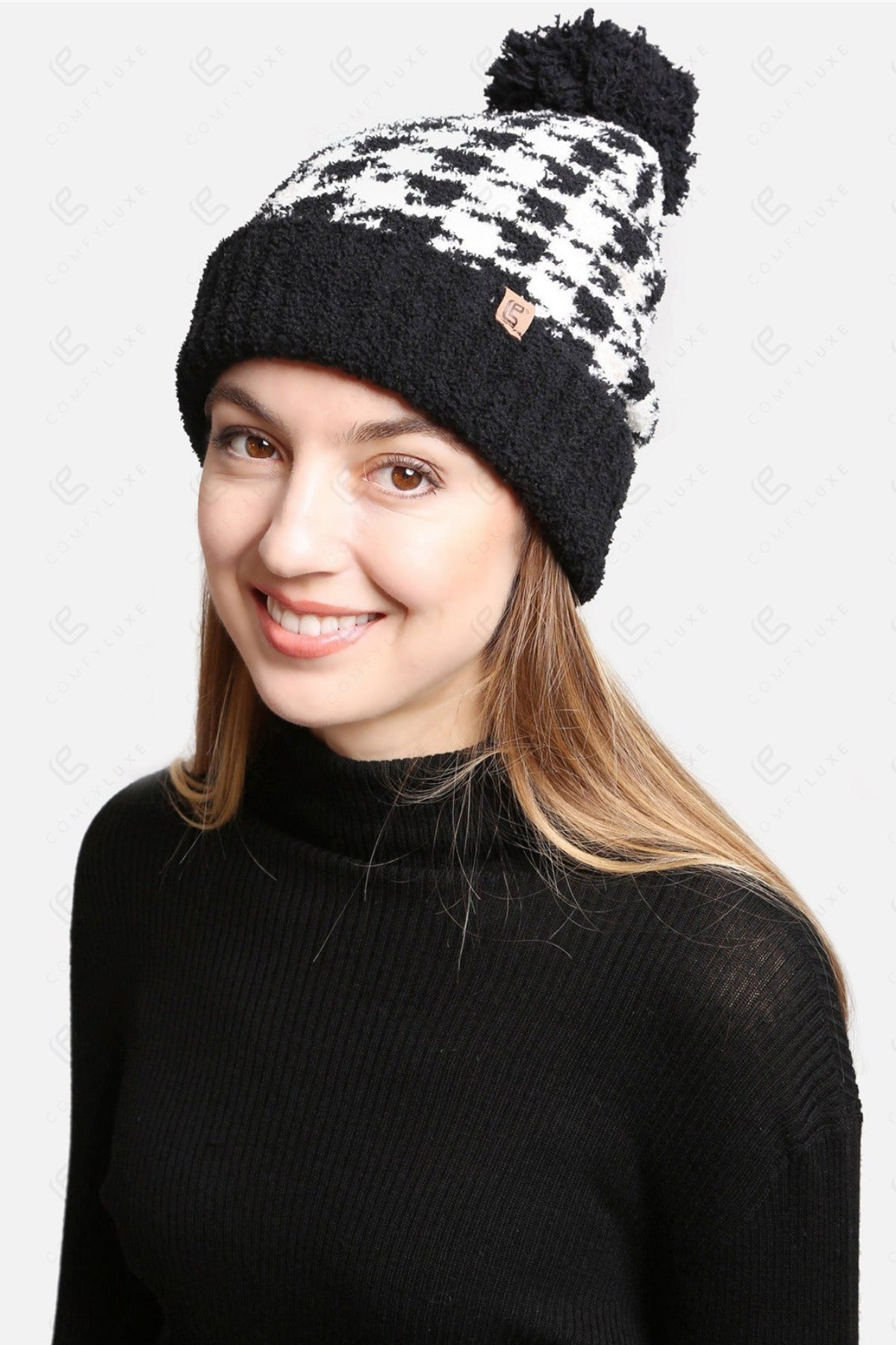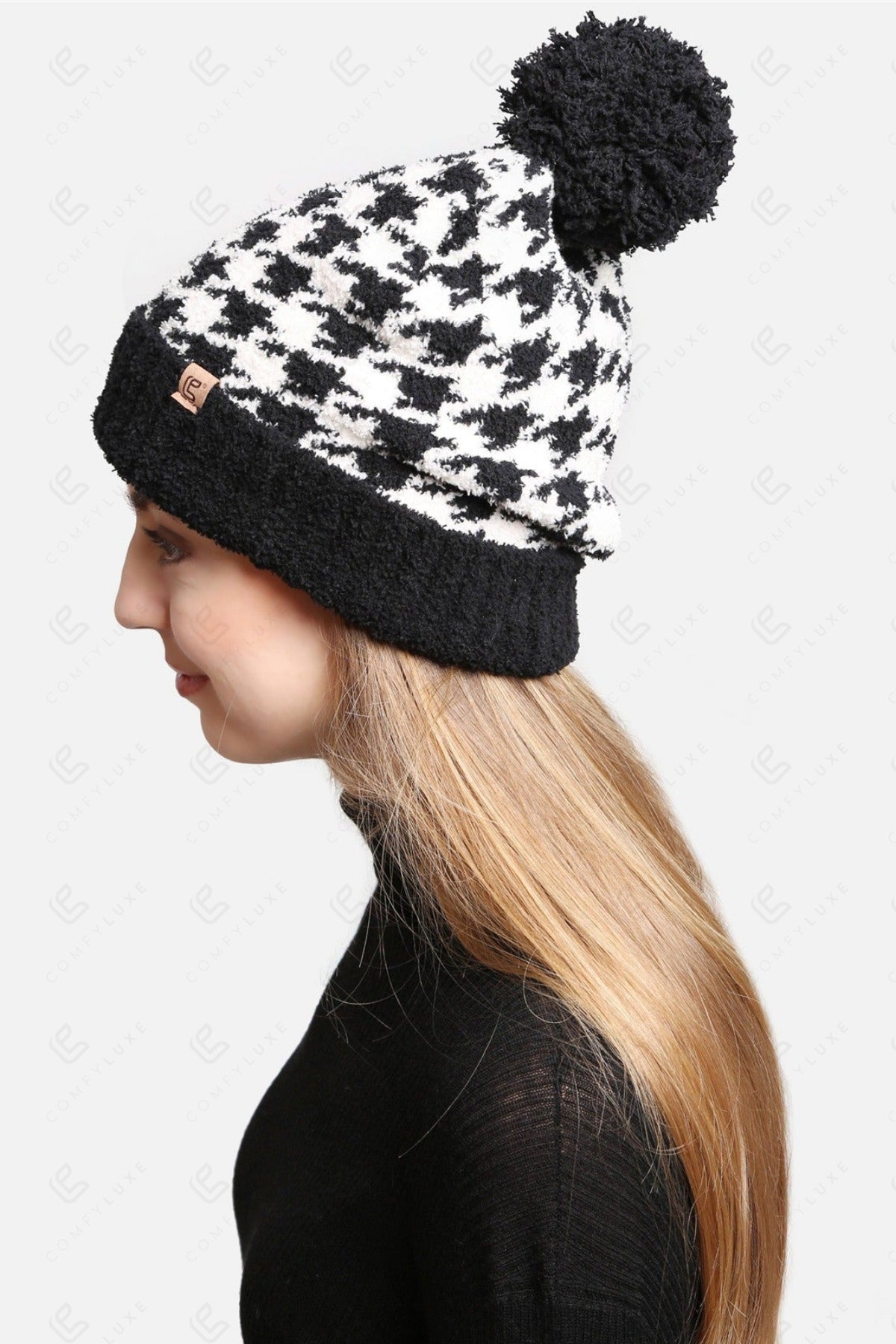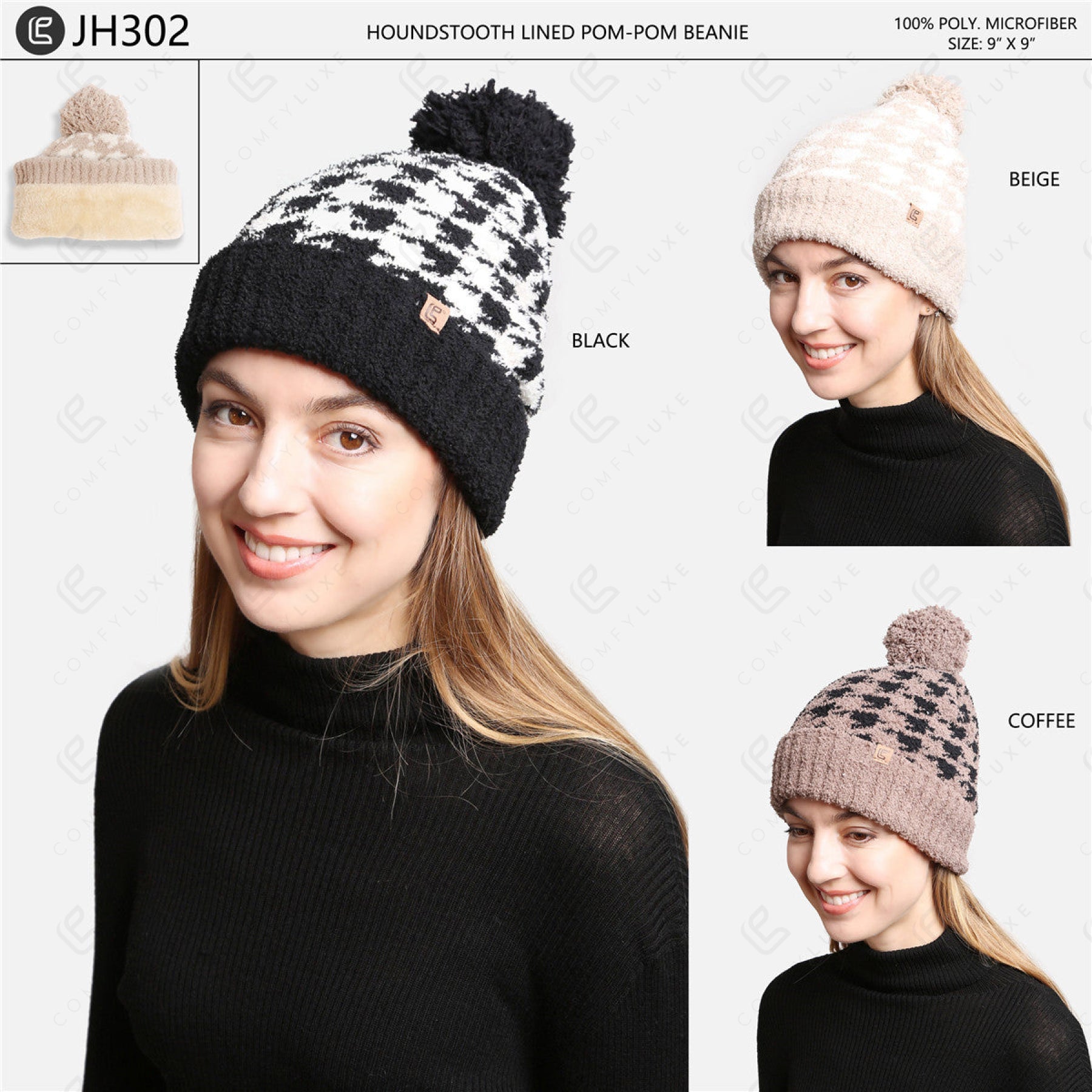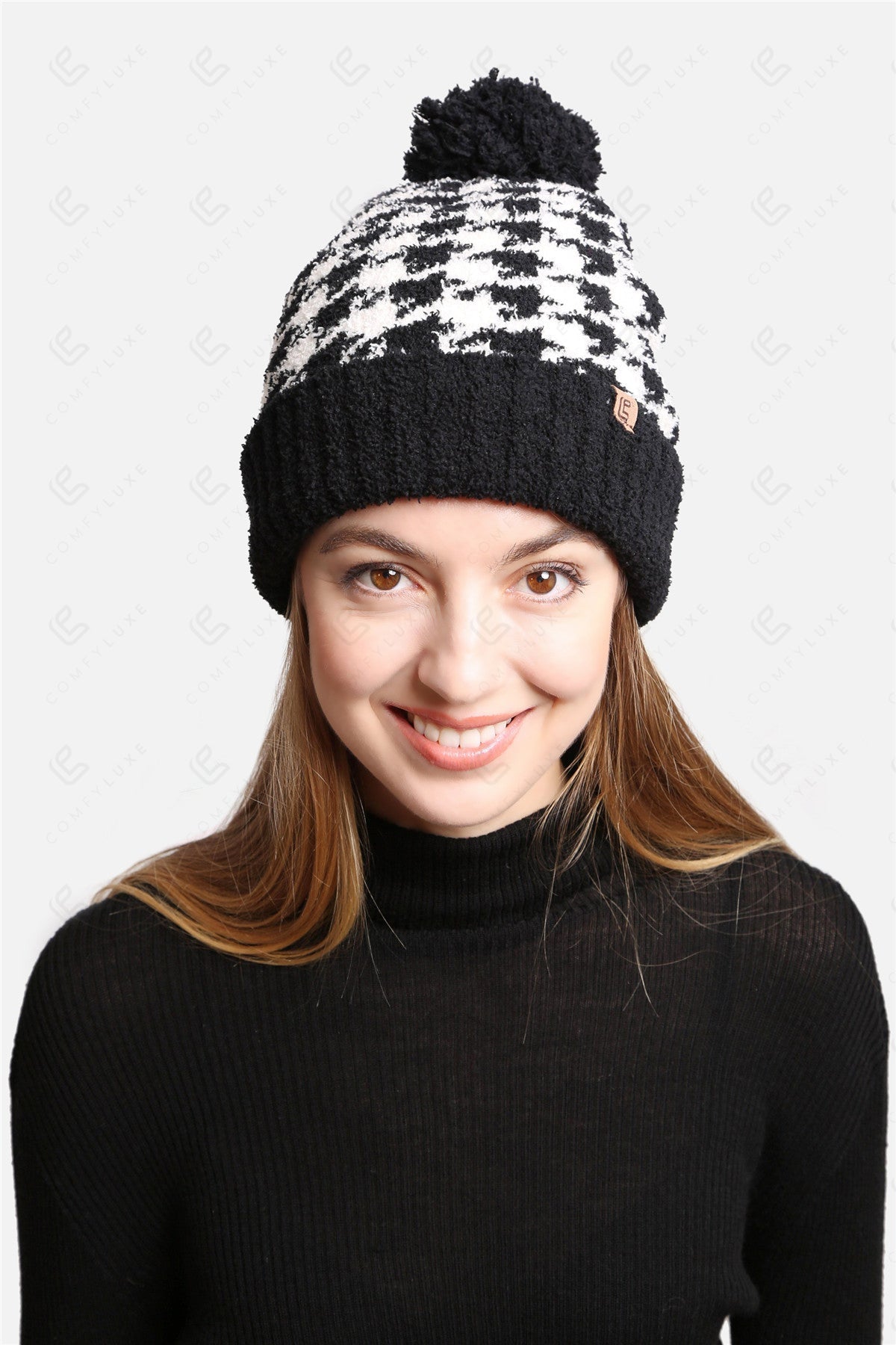 HOUNDSTOOTH PATTERN LUXURY SOFT BEANIE W/ POM-POM, RIBBED CUFFED EDGE, & SHERPA LINING