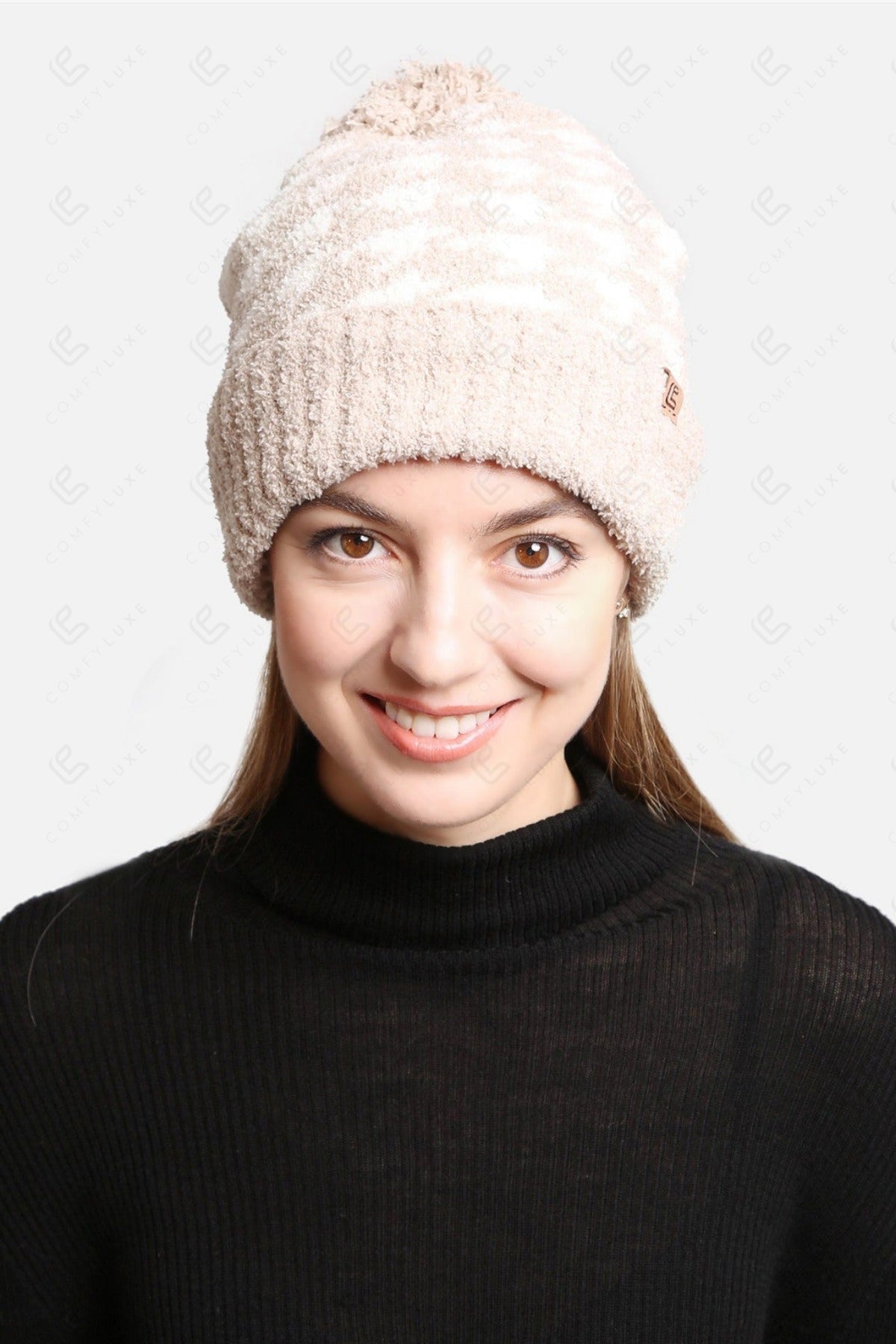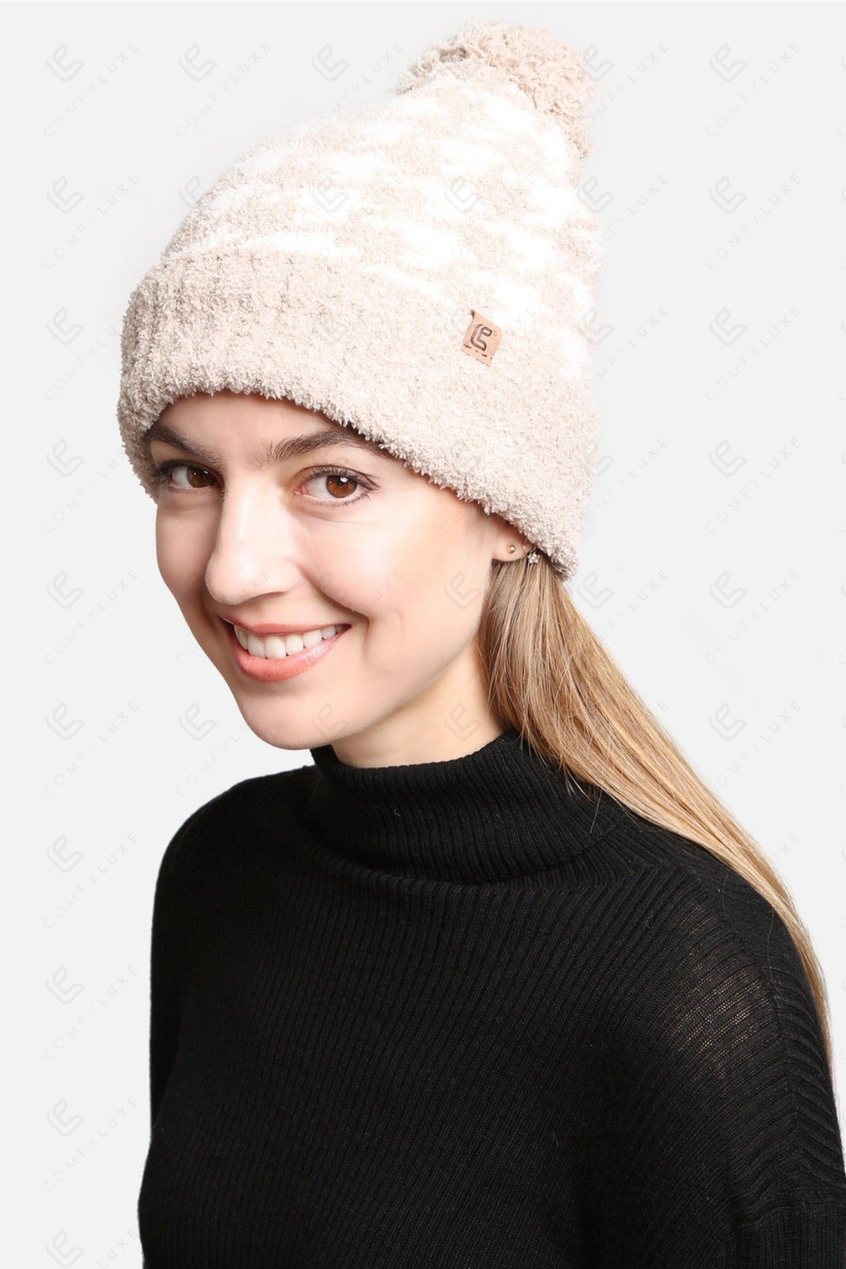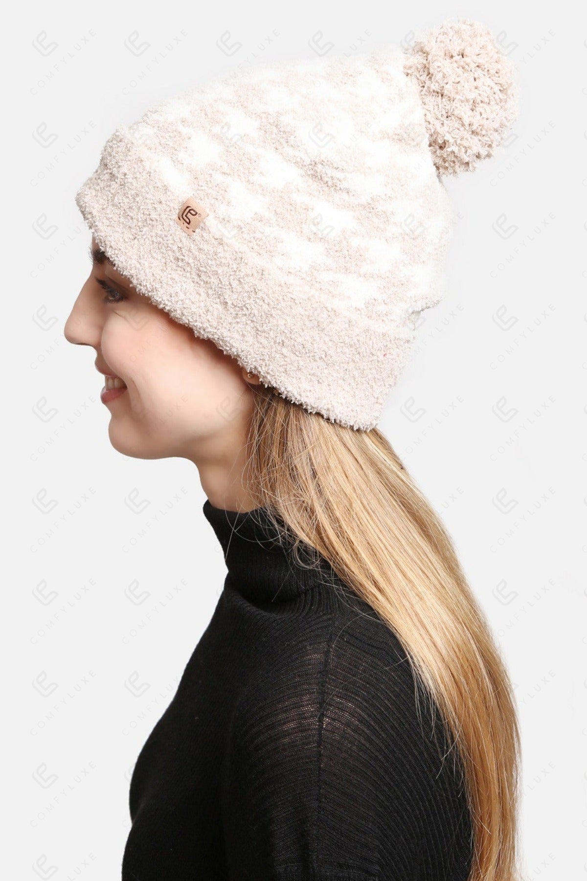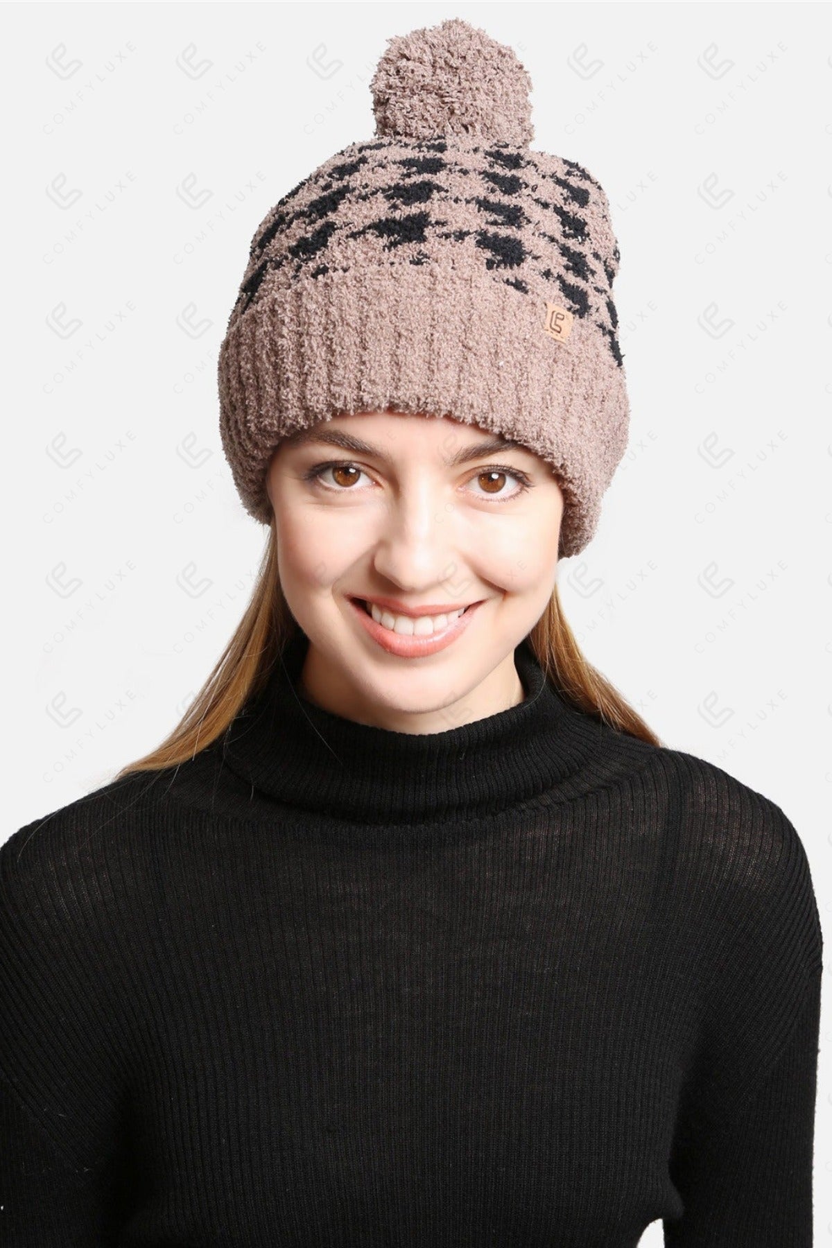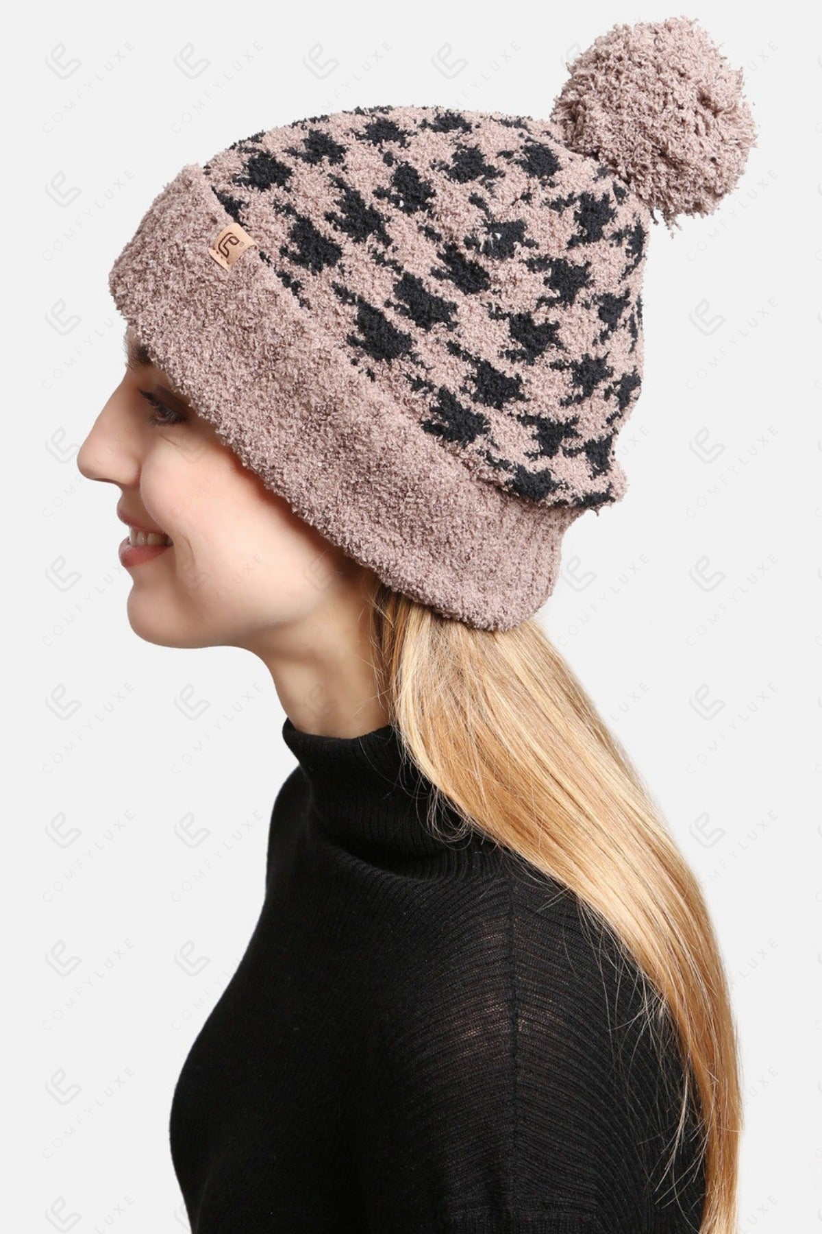 HOUNDSTOOTH PATTERN LUXURY SOFT BEANIE W/ POM-POM, RIBBED CUFFED EDGE, & SHERPA LINING