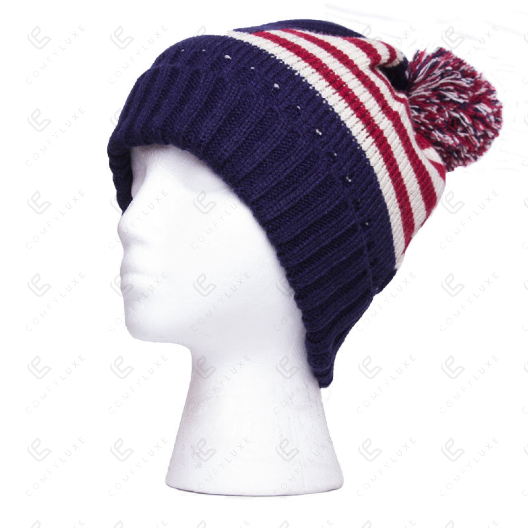 AMERICAN FLAG PATTERN KNITTED BEANIE W/ POM-POM & RIBBED CUFFED EDGE