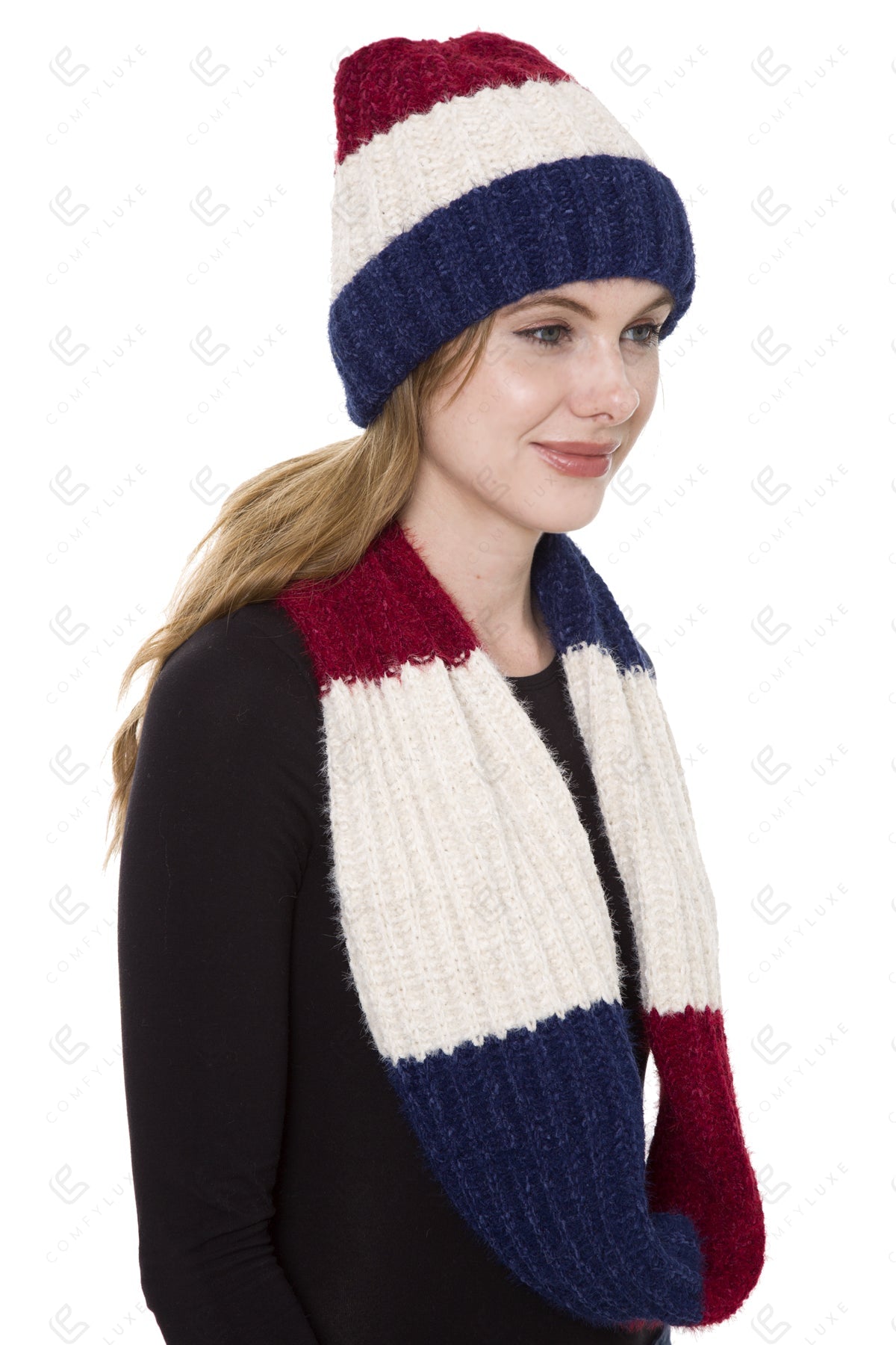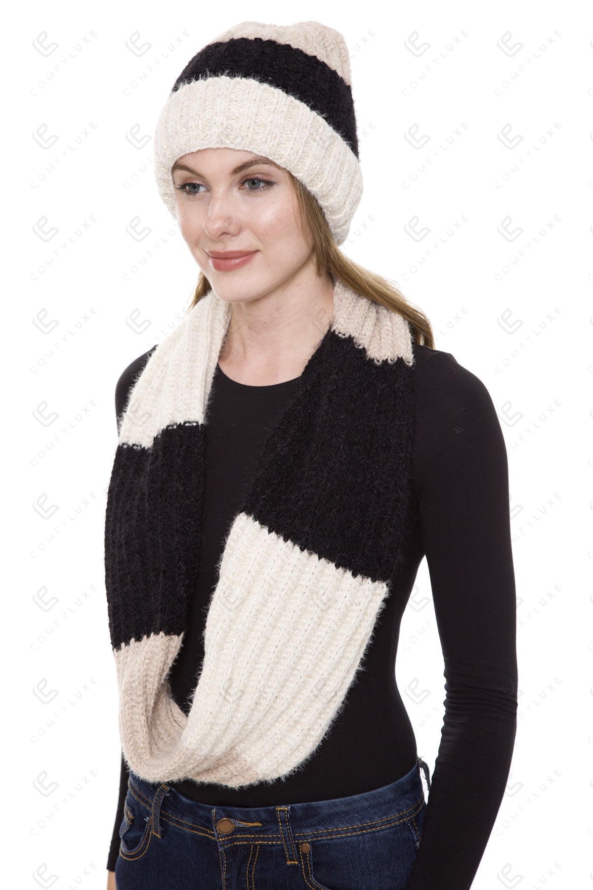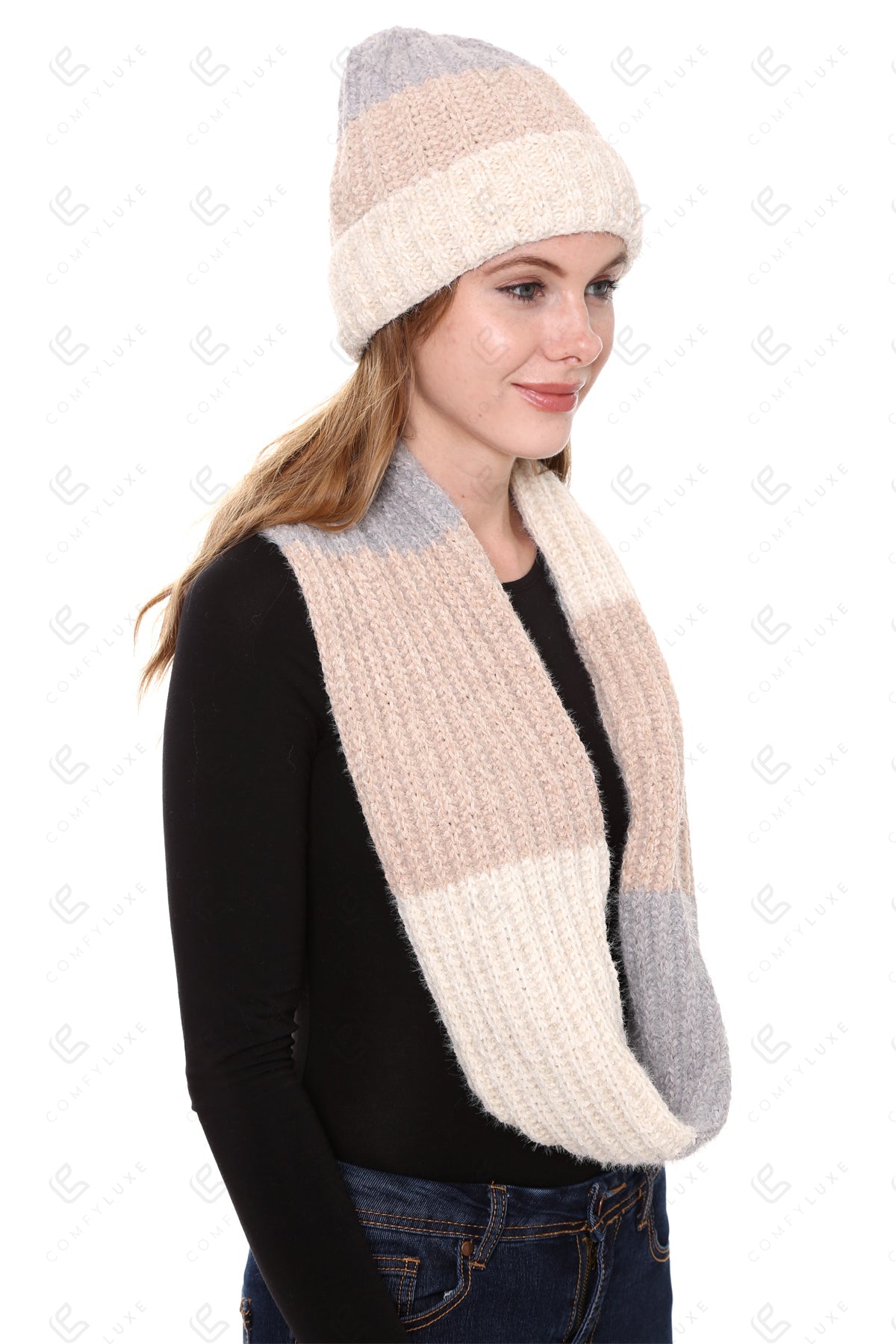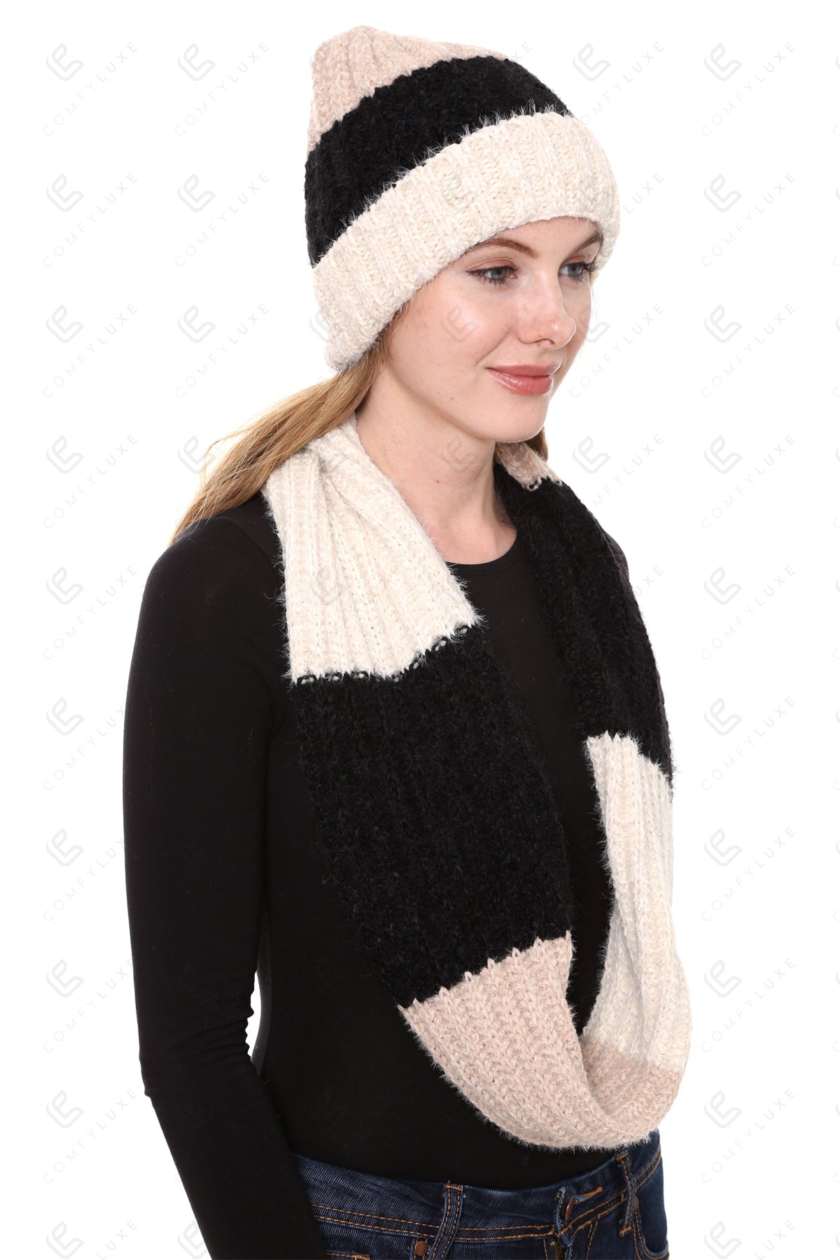 COLOR-BLOCKED PATTERN KNITTED BEANIE & INFINITY SCARF SET