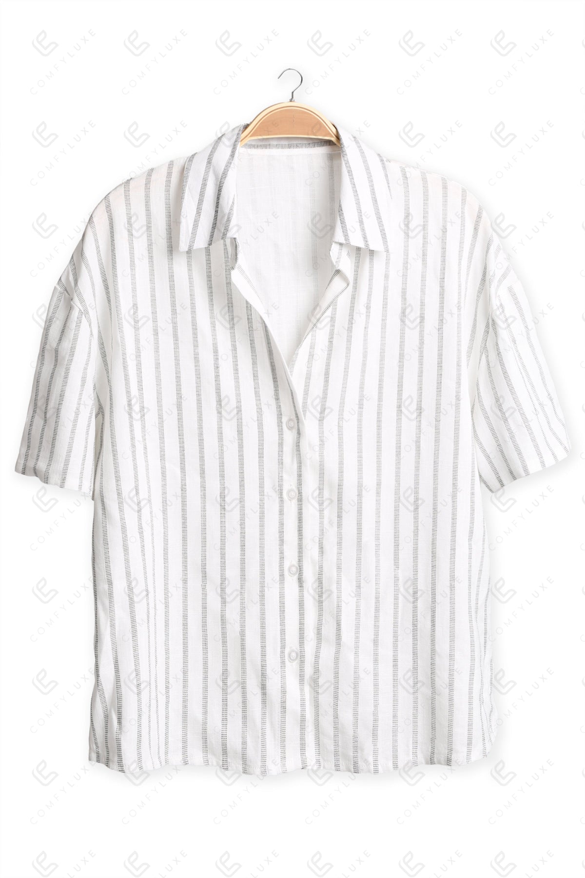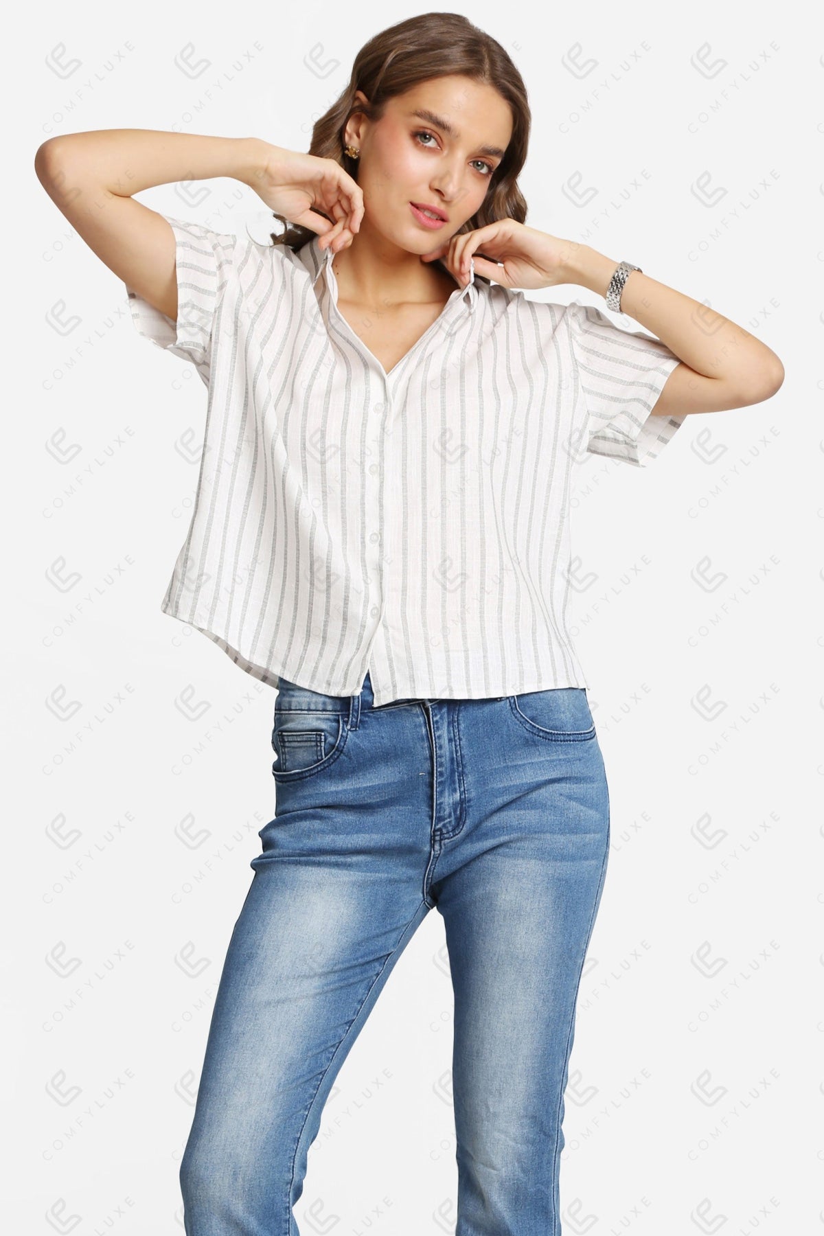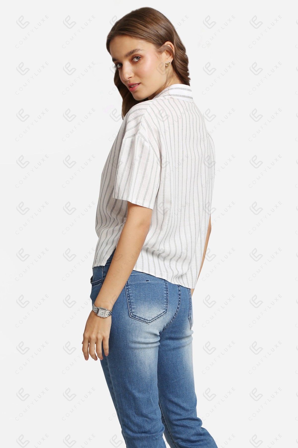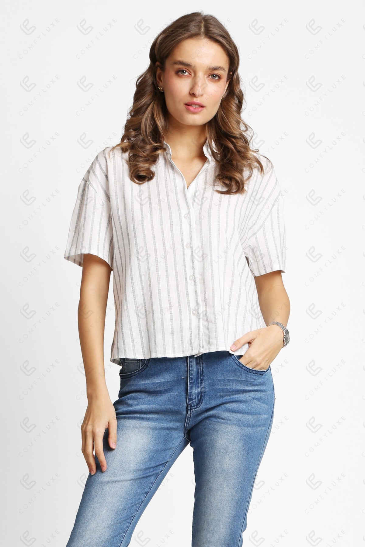 SOLID COLOR & STRIPED PATTERN COLLARED, SHORT-SLEEVED, CROP LINEN SHIRT W/ BUTTON CLOSURE
