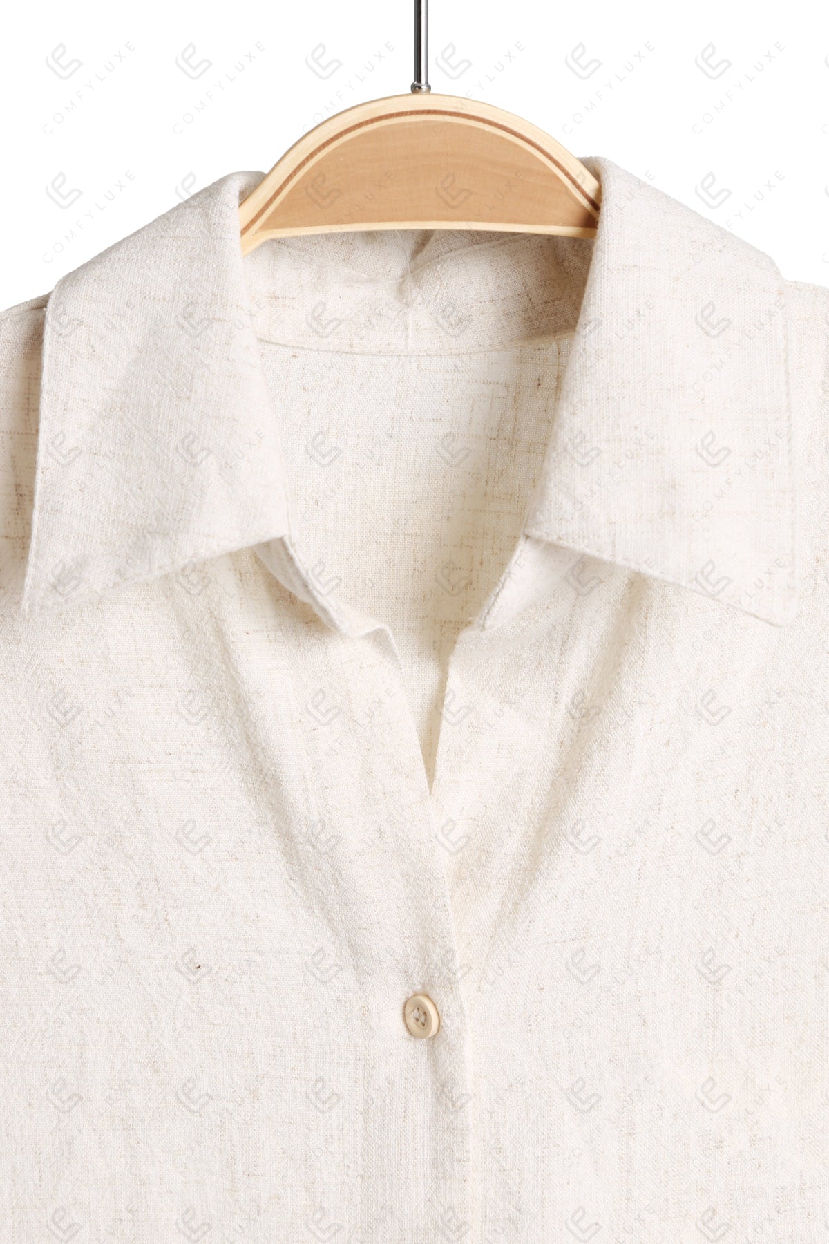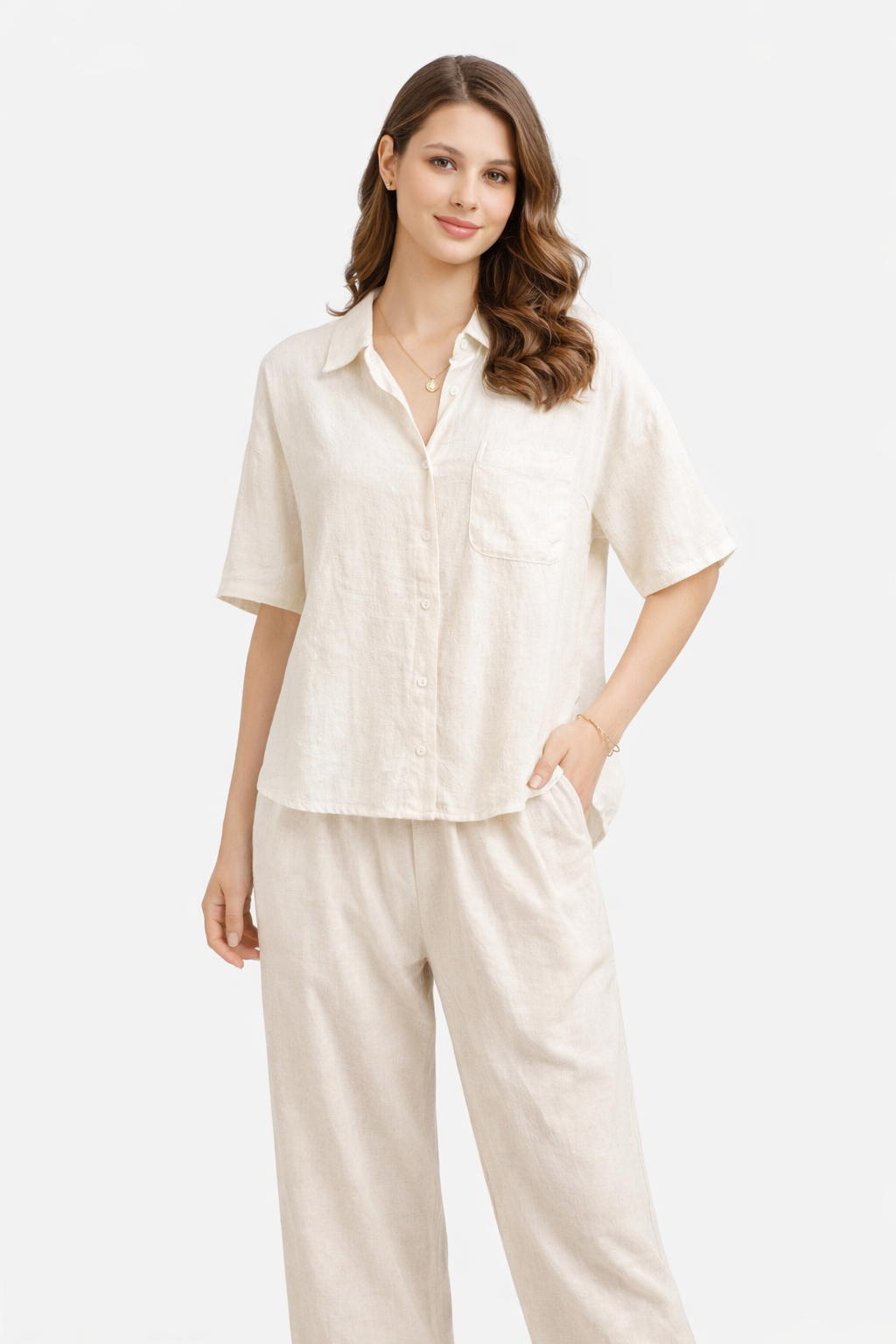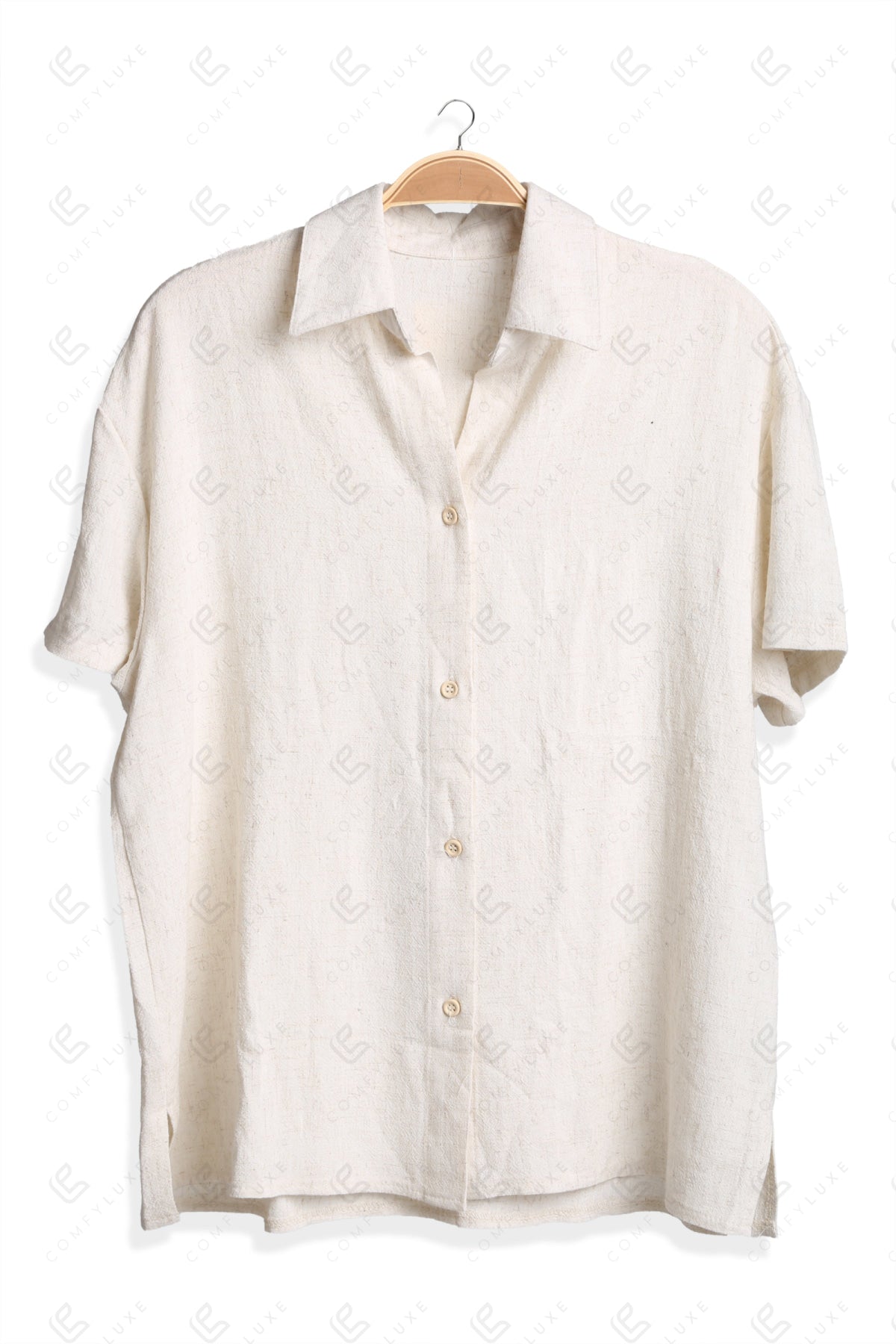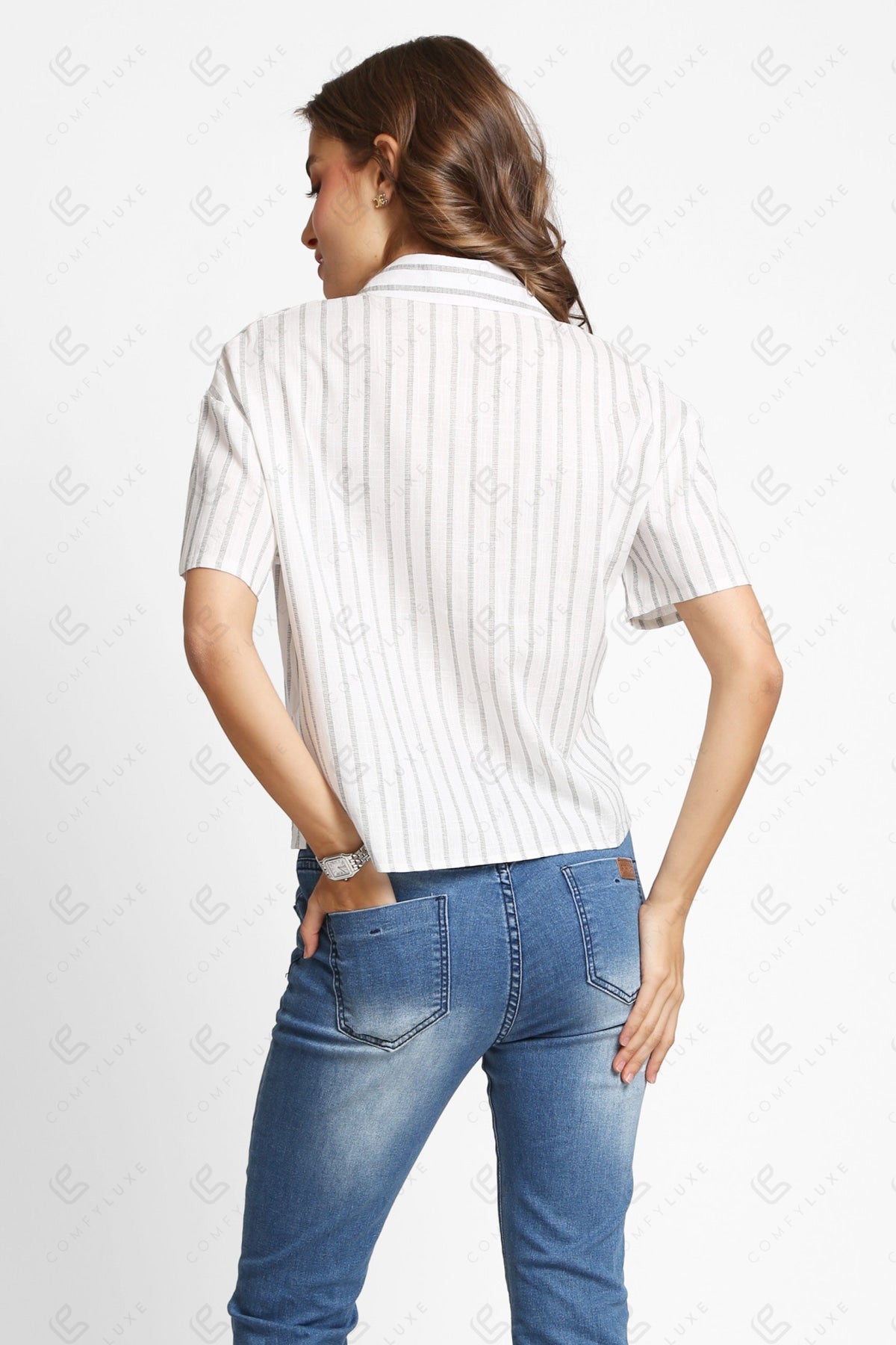 SOLID COLOR & STRIPED PATTERN COLLARED, SHORT-SLEEVED, CROP LINEN SHIRT W/ BUTTON CLOSURE
