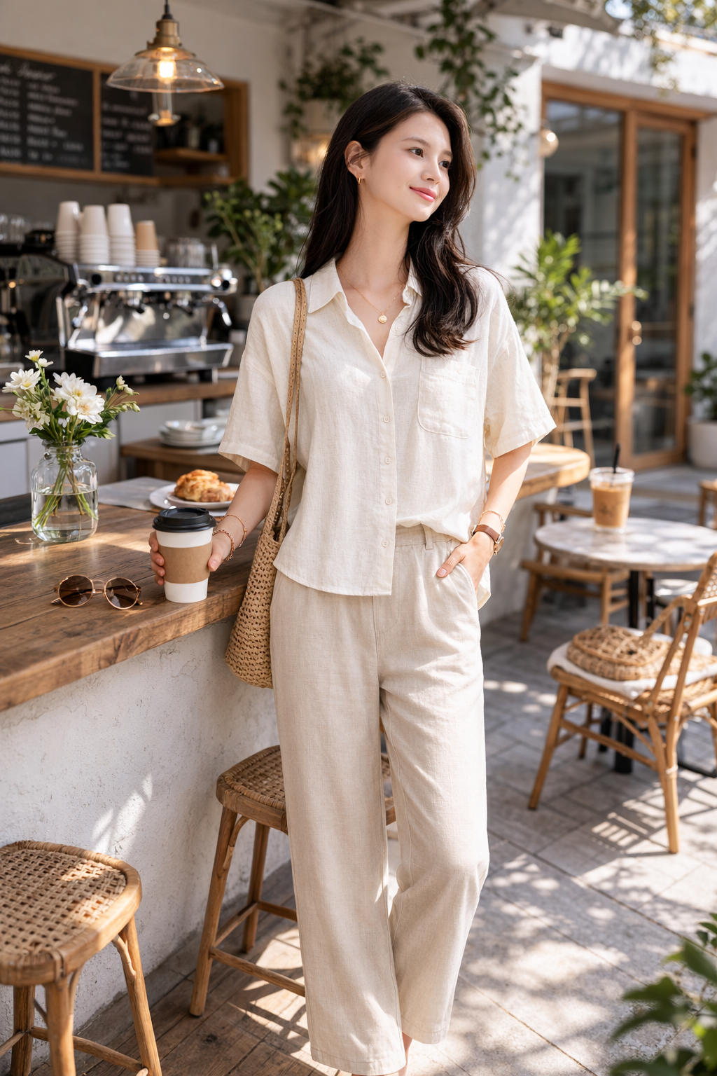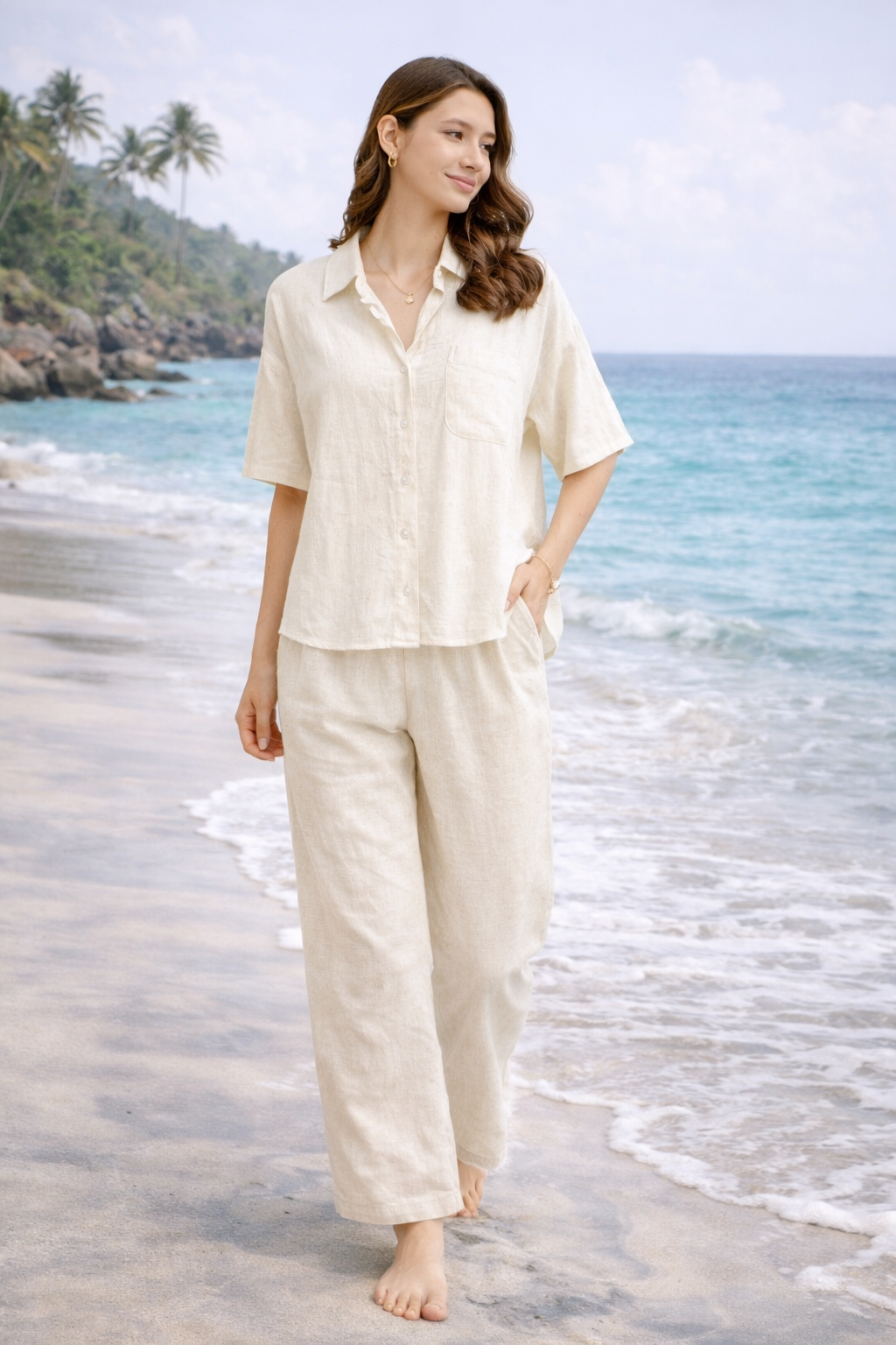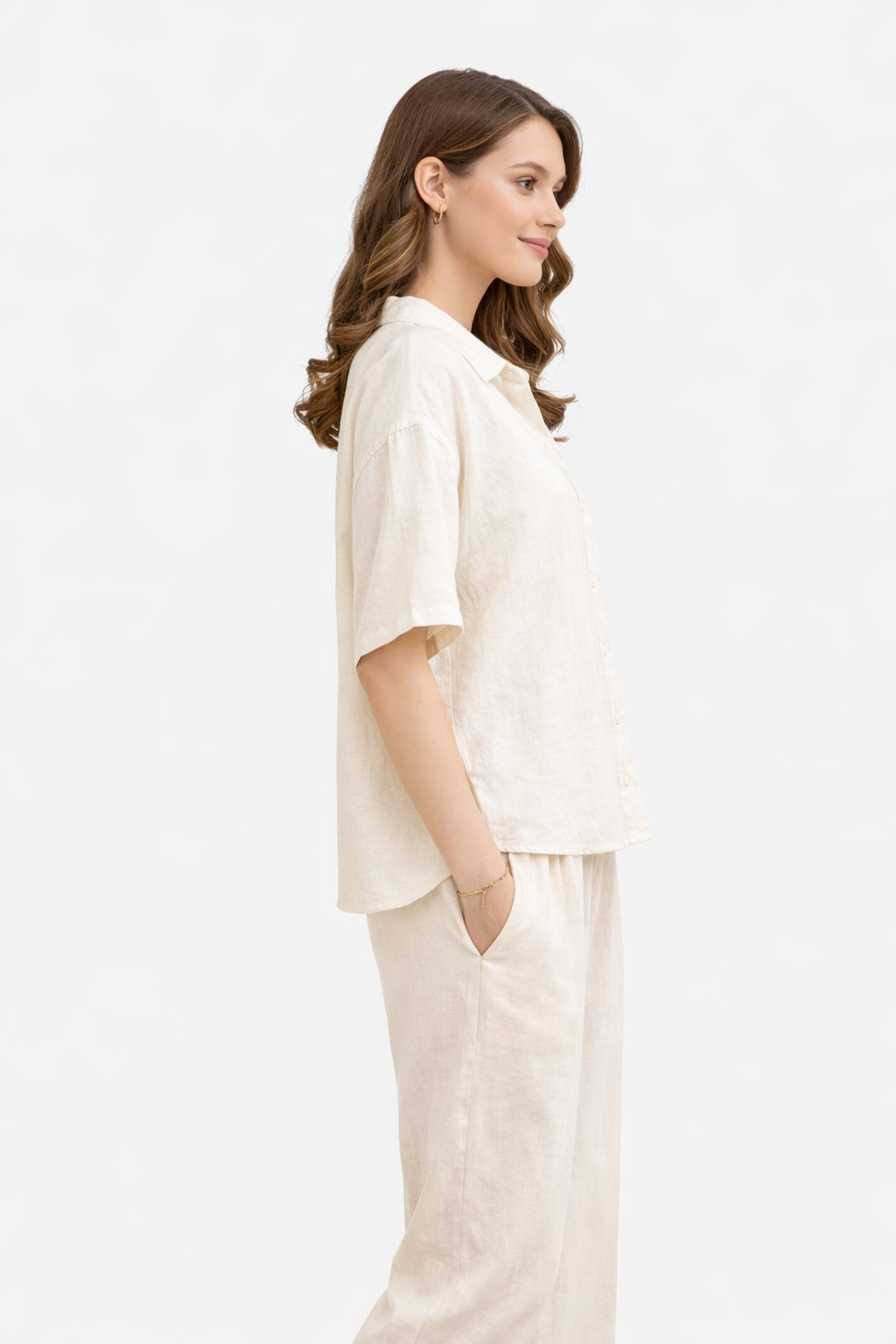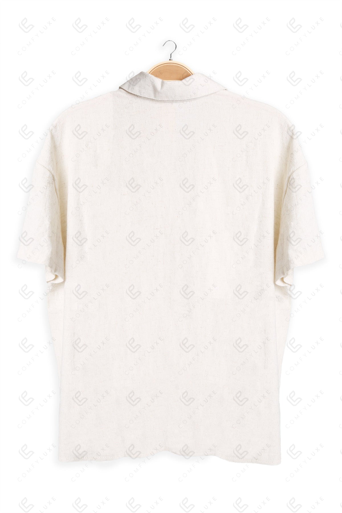 SOLID COLOR & STRIPED PATTERN COLLARED, SHORT-SLEEVED, CROP LINEN SHIRT W/ BUTTON CLOSURE