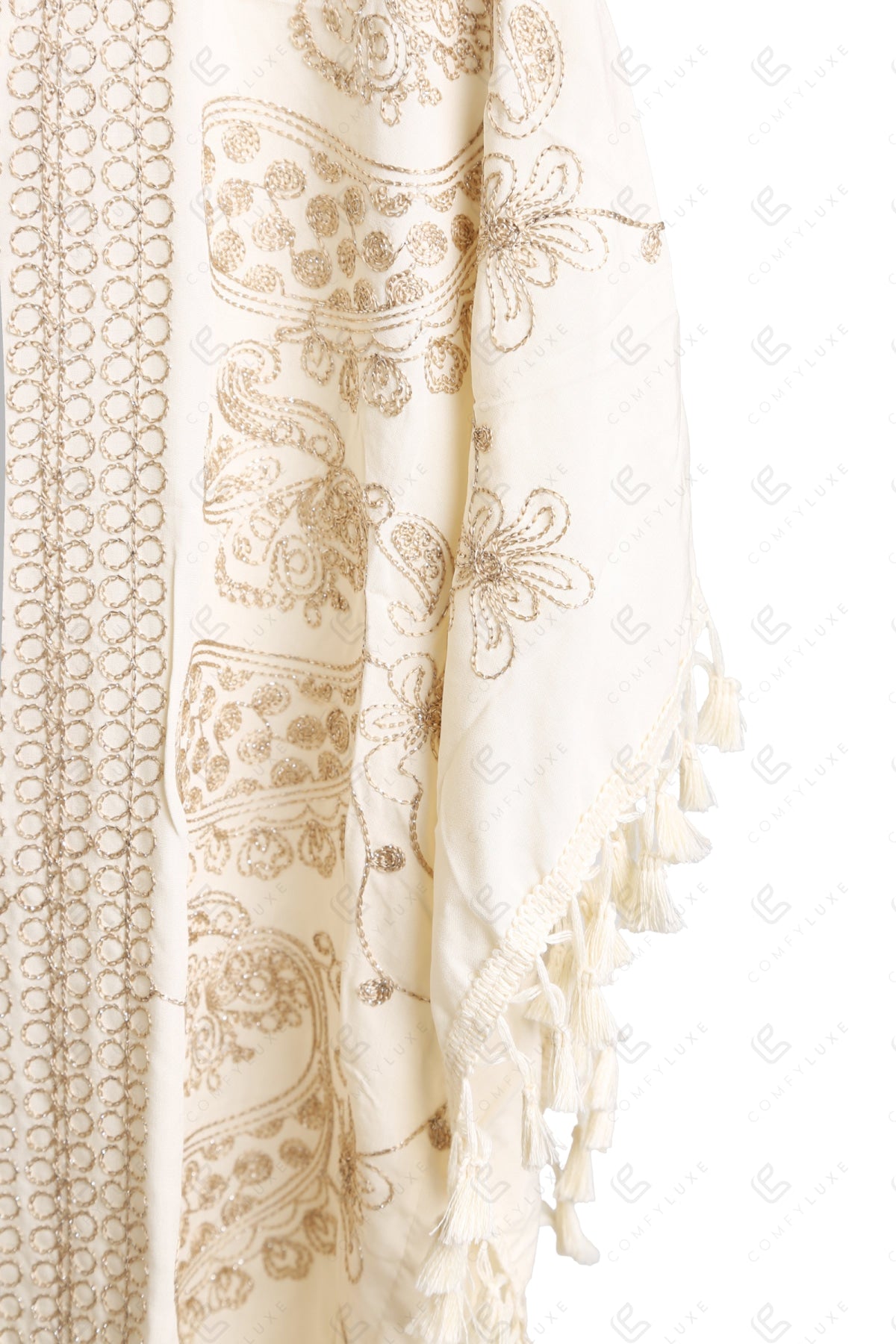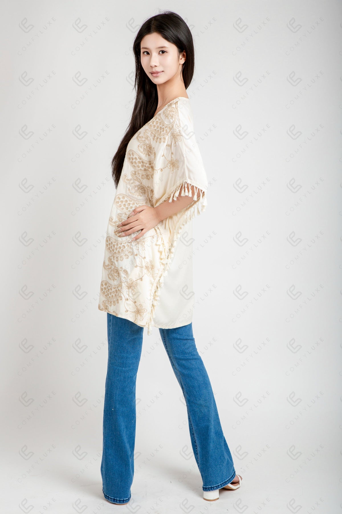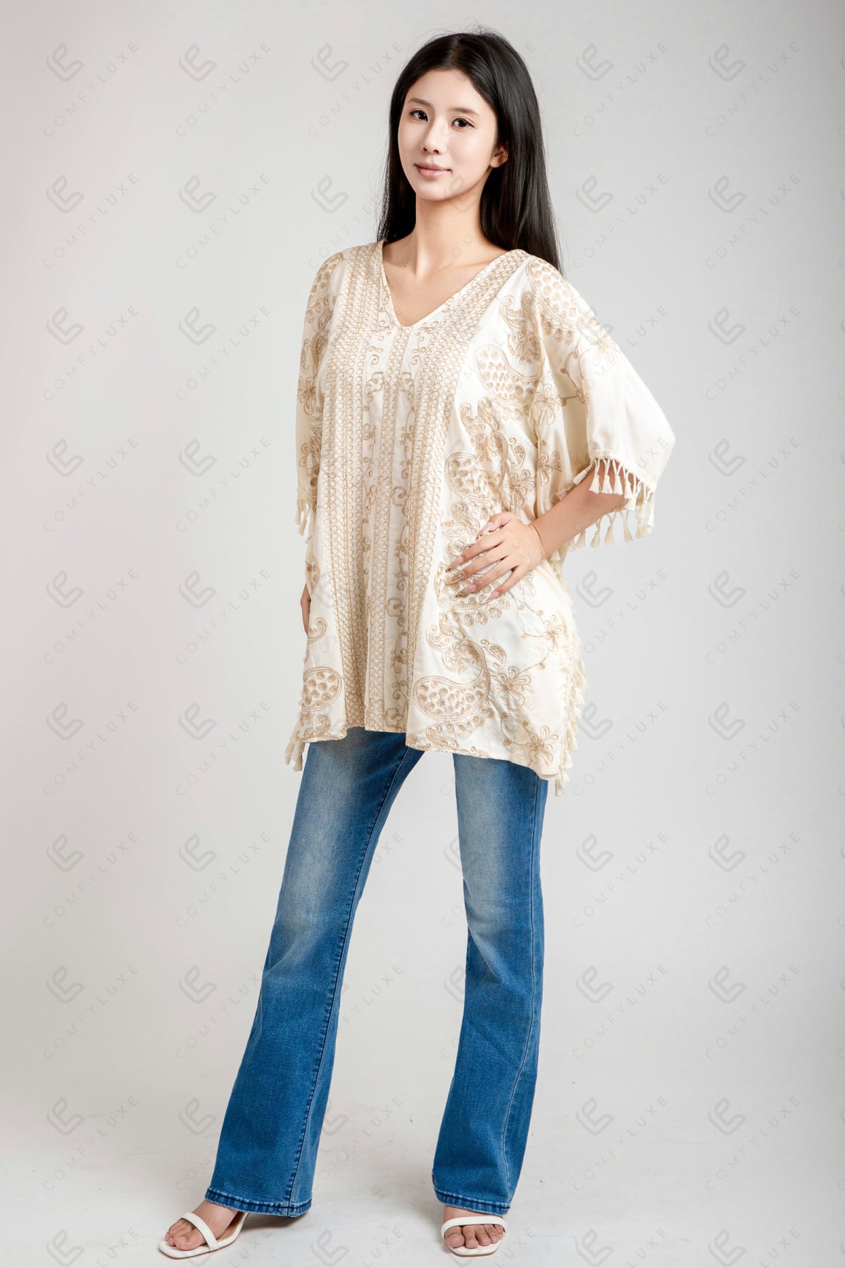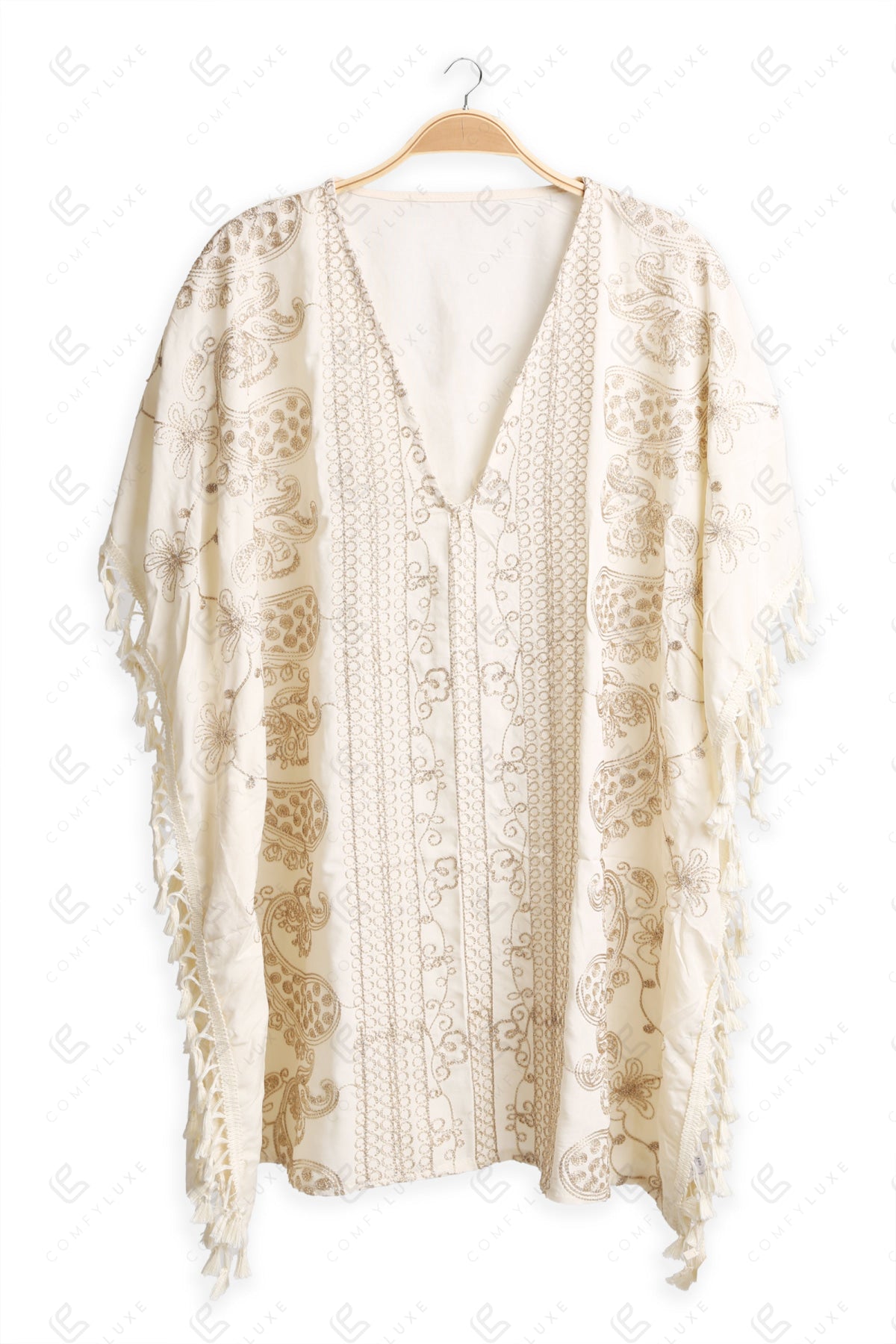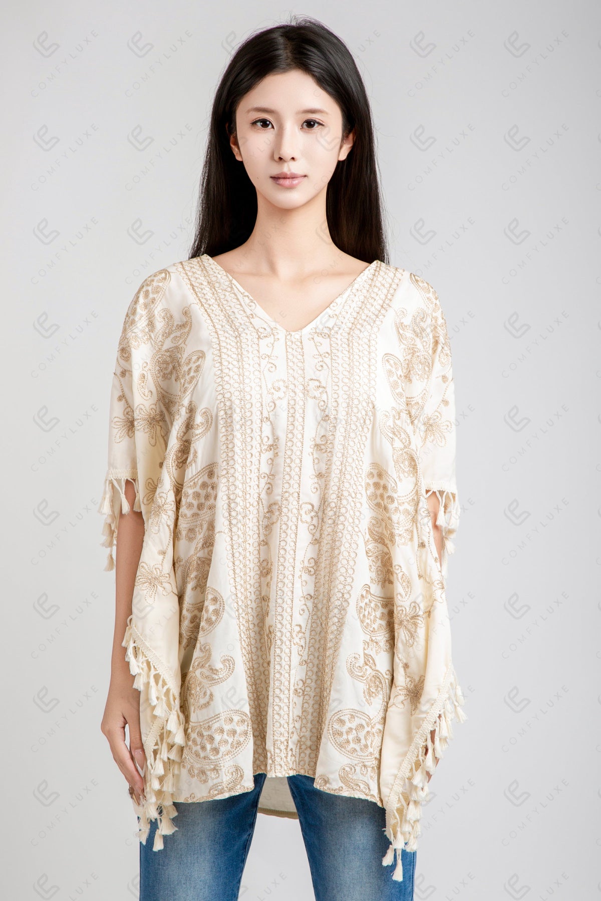 FLORAL & PAISLEY PATTERN V-NECK, HALF-SLEEVED, SHORT COVER-UP PONCHO W/ EMBROIDERED & TASSELED DETAILING