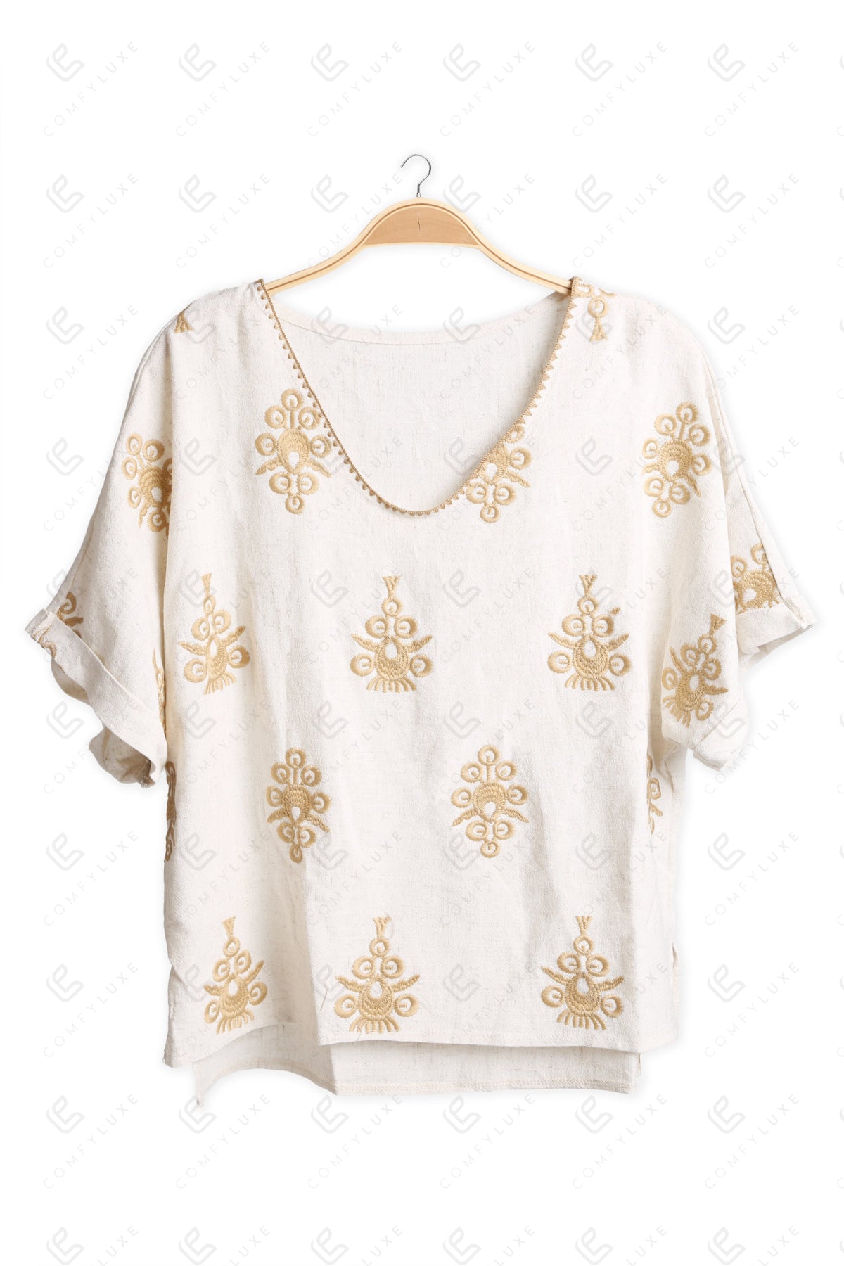 BOHO PATTERN SCOOP NECK, SHORT-SLEEVED, CROP LINEN SHIRT W/ EMBROIDERED DETAILING