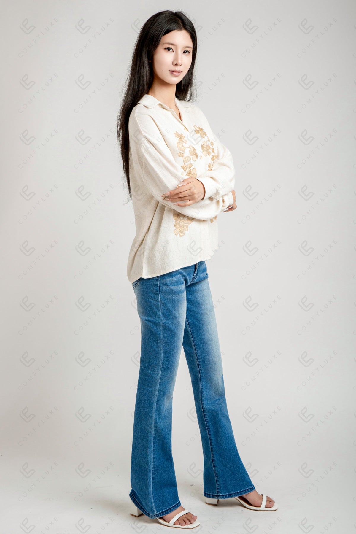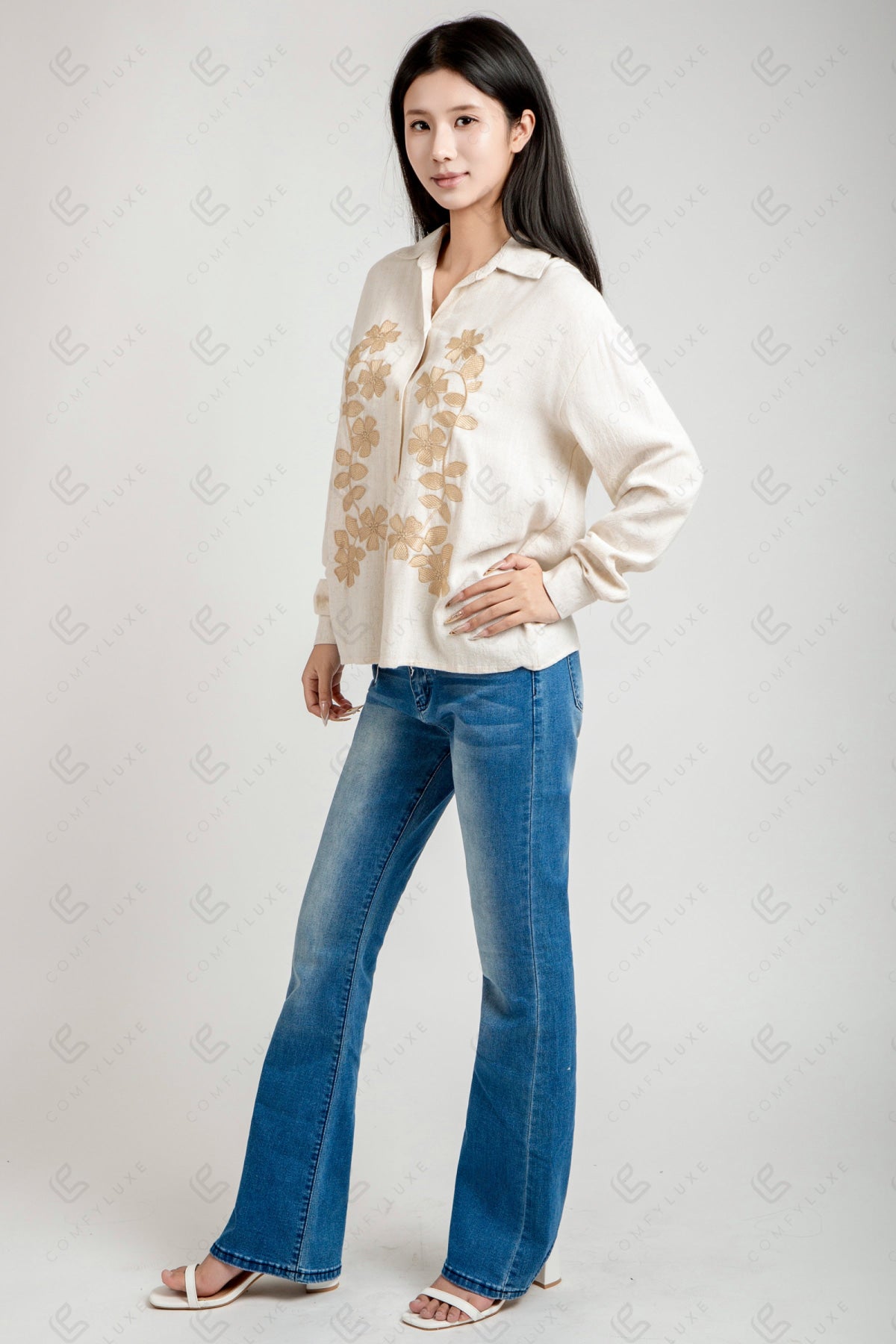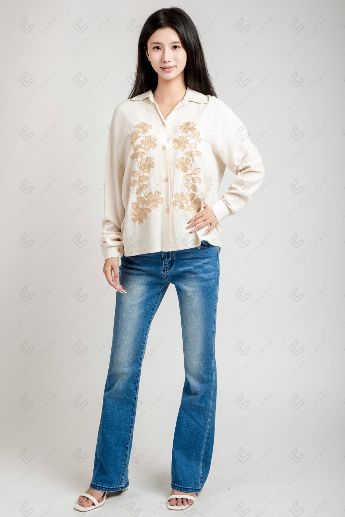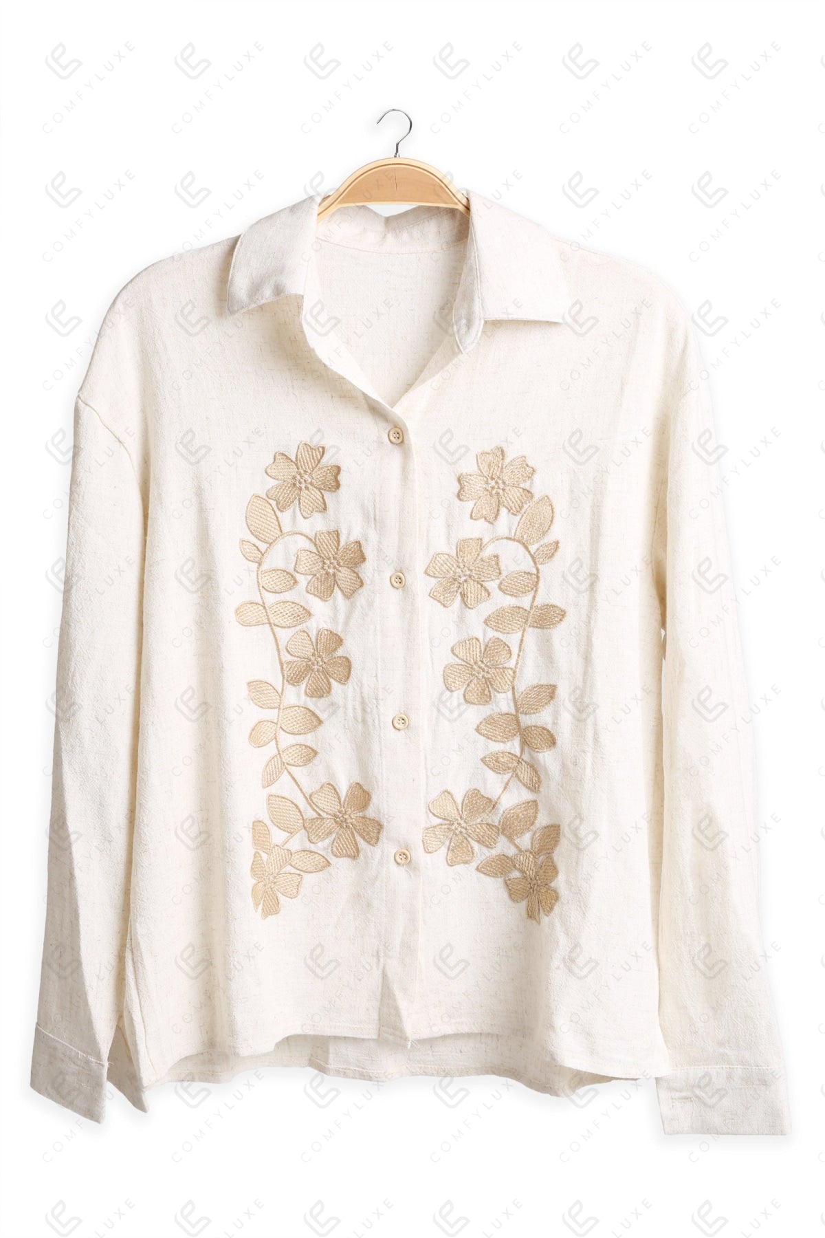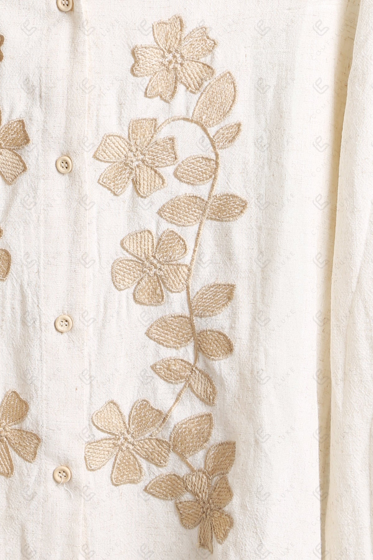 FLORAL PATTERN COLLARED, LONG-SLEEVED, SHORT LINEN SHIRT W/ EMBROIDERED DETAILING & BUTTON CLOSURE