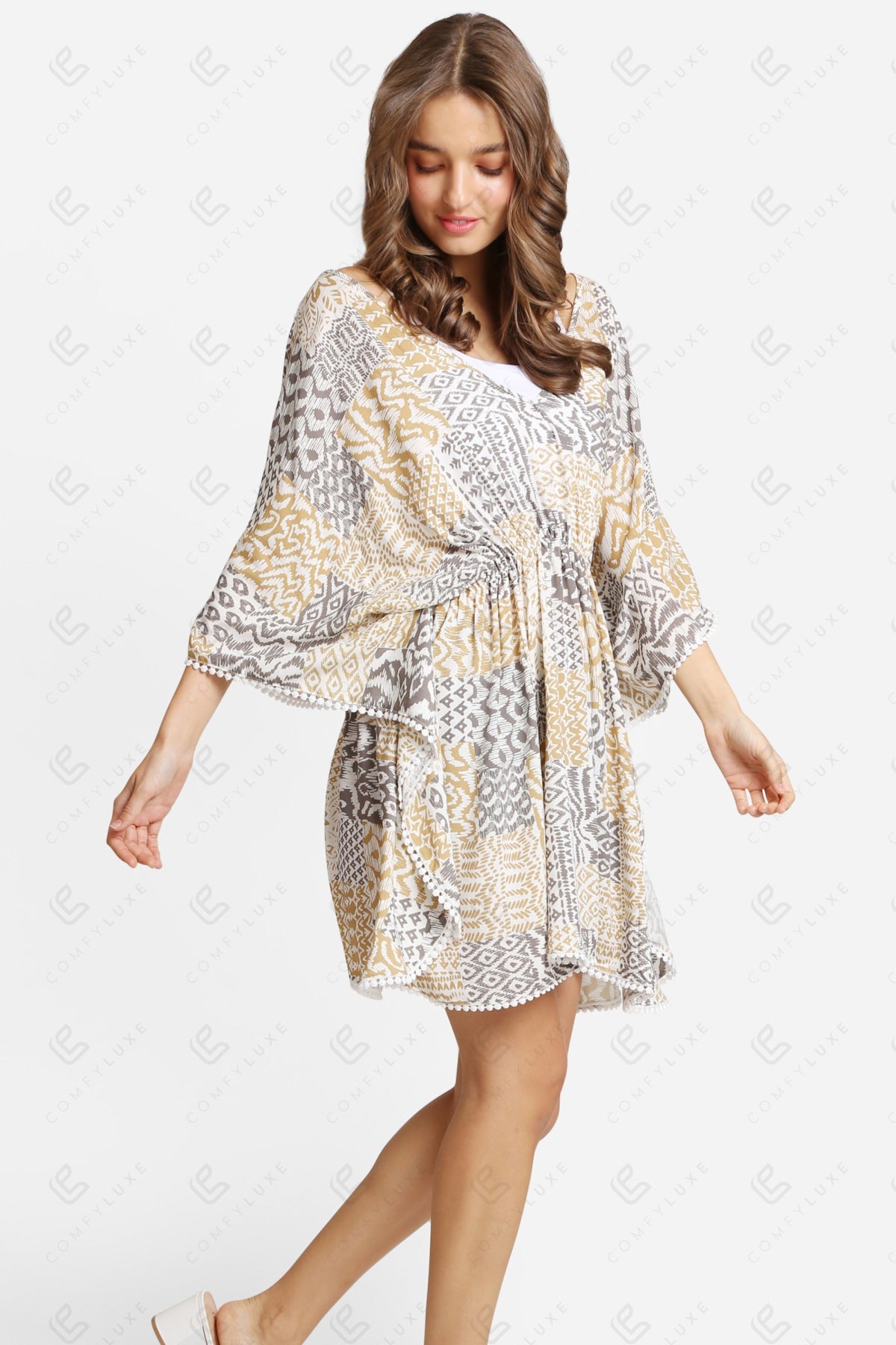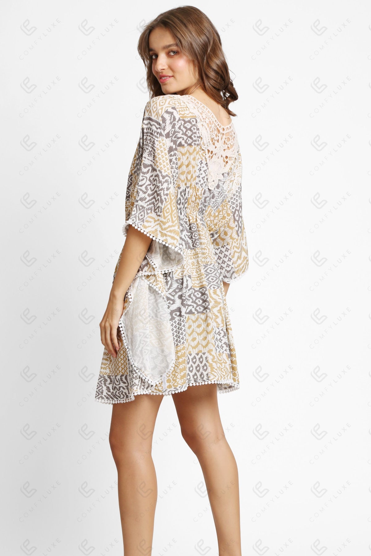 MIXED PATTERN V-NECK, HALF-SLEEVED, MID-LENGTH COVER-UP DRESS W/ CROCHETED DETAILING