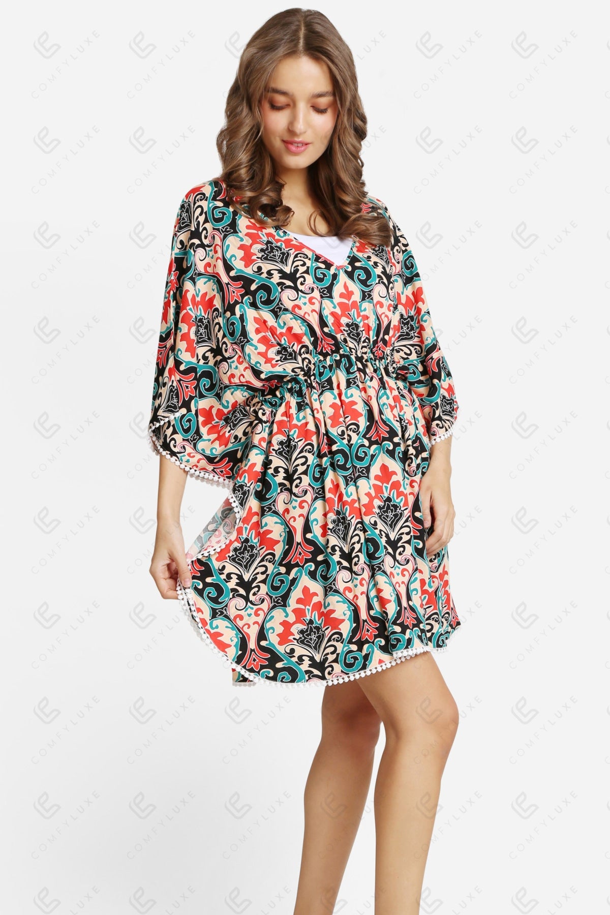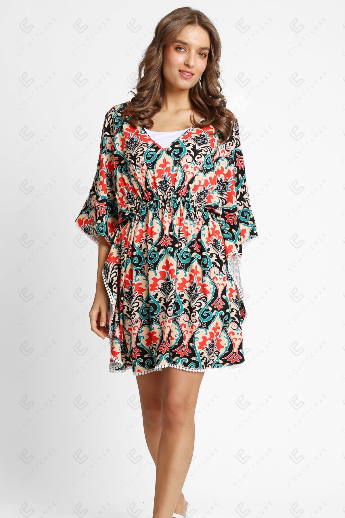 ABSTRACT PATTERN V-NECK, HALF-SLEEVED, MID-LENGTH COVER-UP DRESS W/ CROCHETED DETAILING
