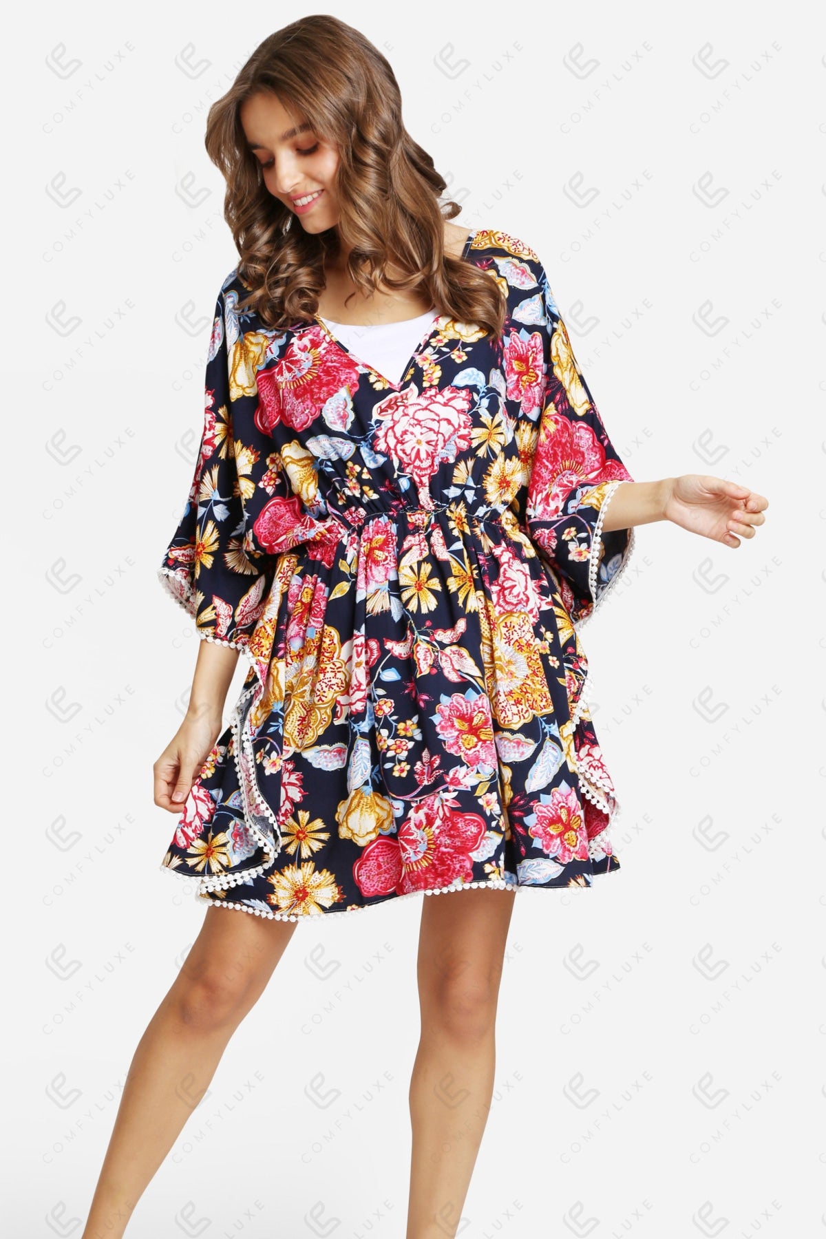 MIXED FLORAL PATTERN V-NECK, HALF-SLEEVED, MID-LENGTH COVER-UP DRESS W/ CROCHETED DETAILING