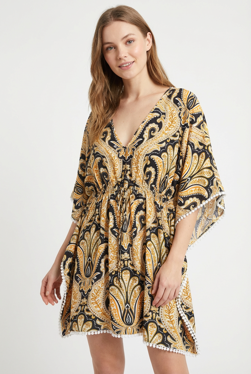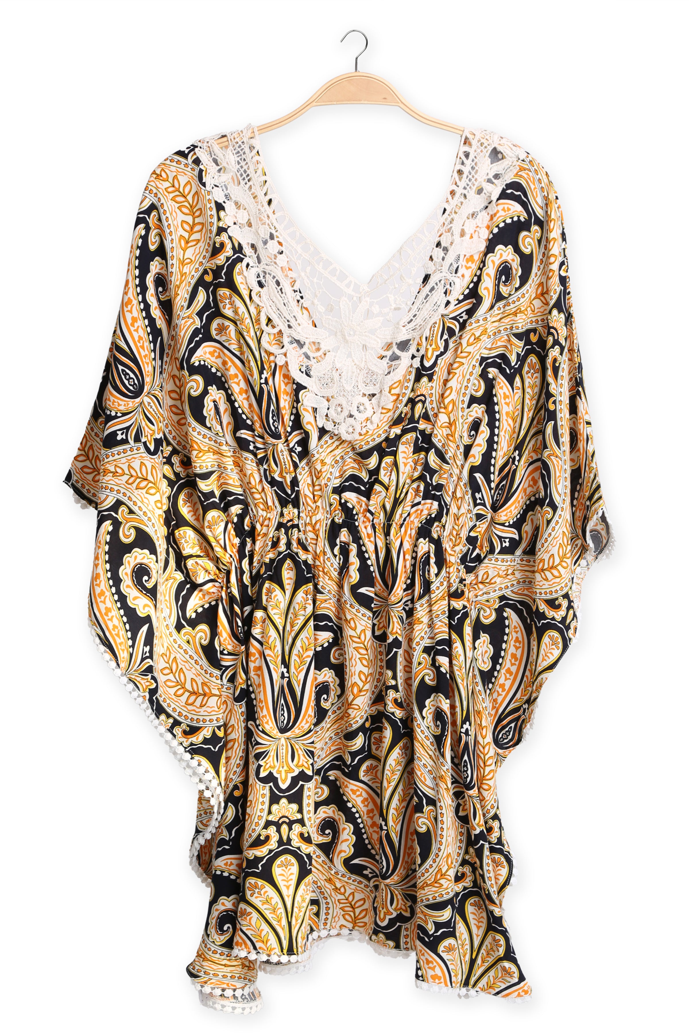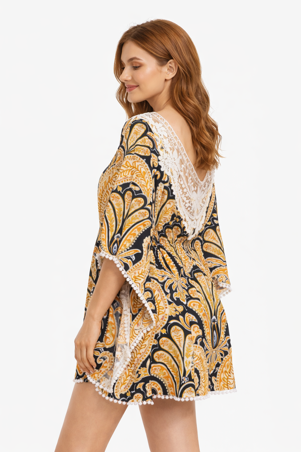 MIXED PATTERN V-NECK, HALF-SLEEVED, MID-LENGTH COVER-UP DRESS W/ CROCHETED DETAILING