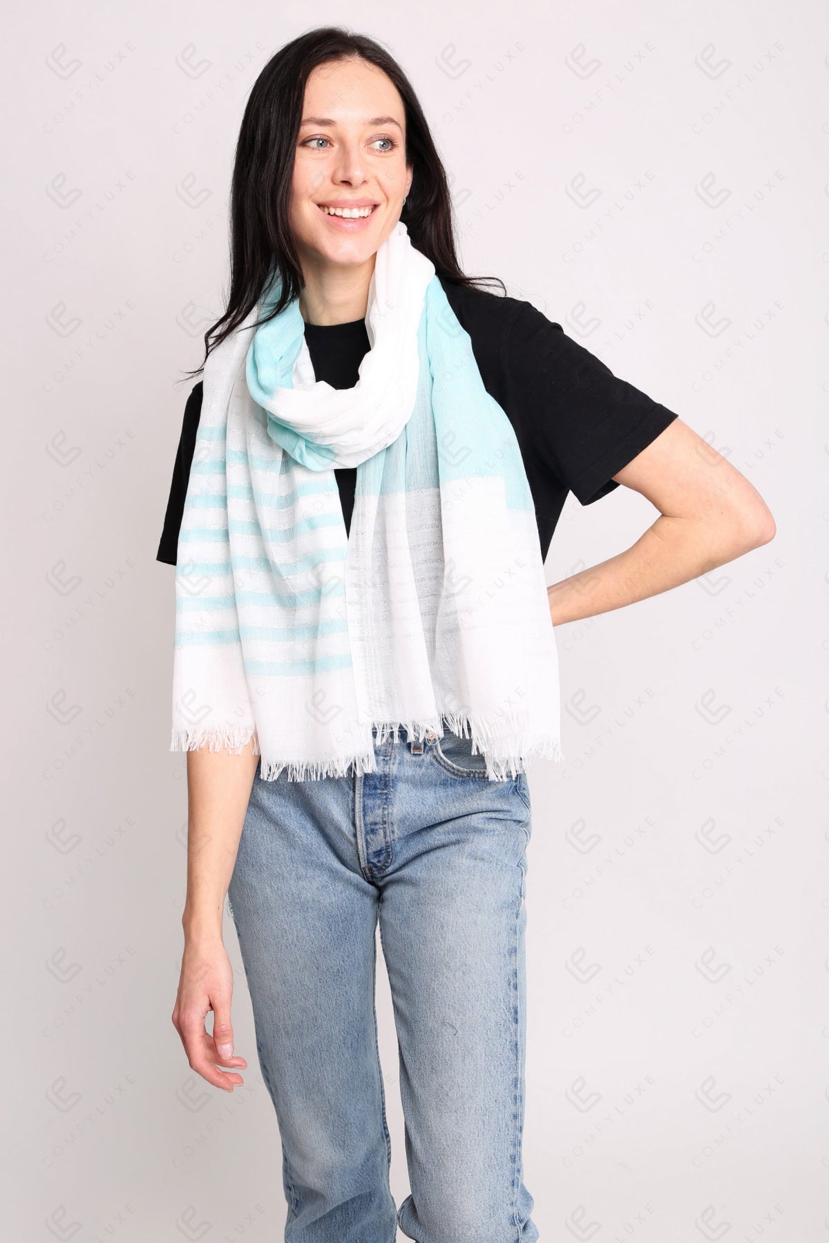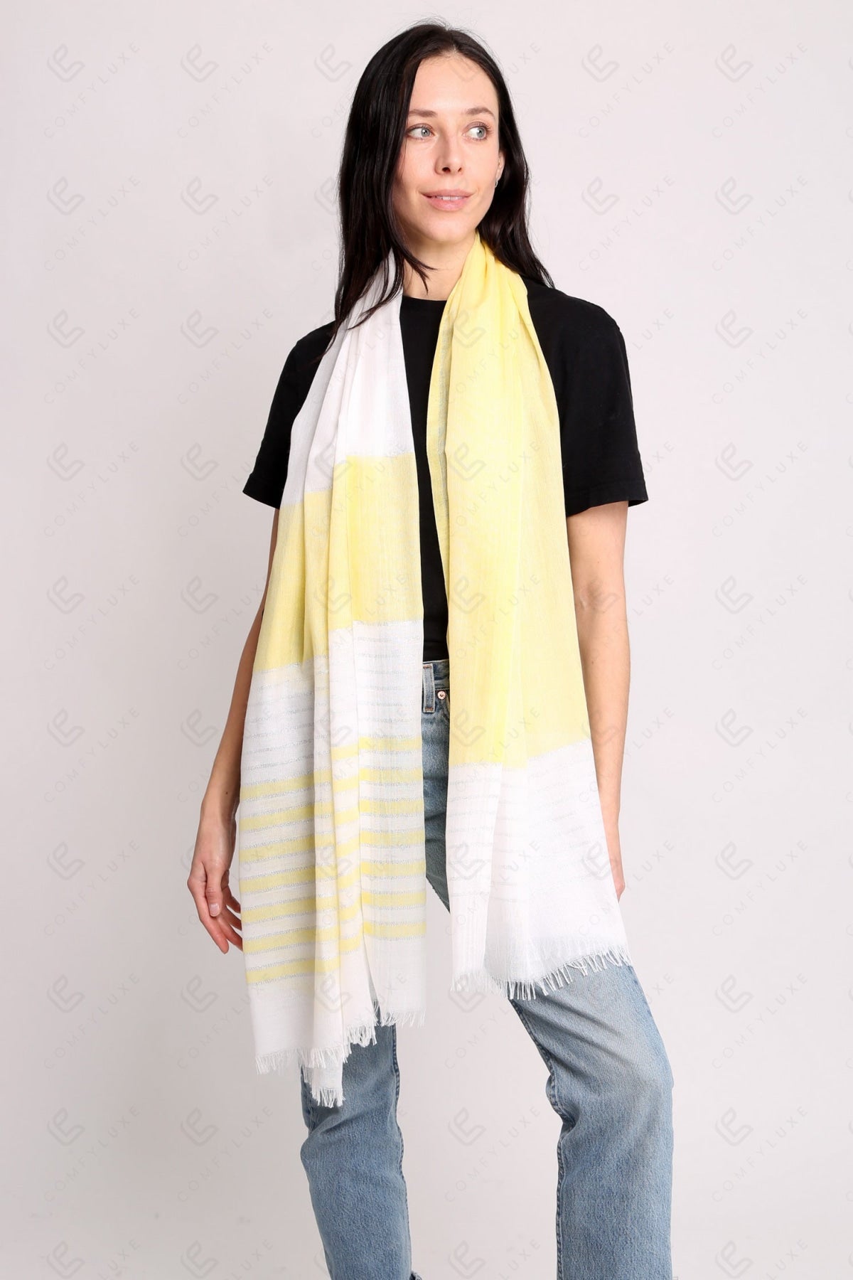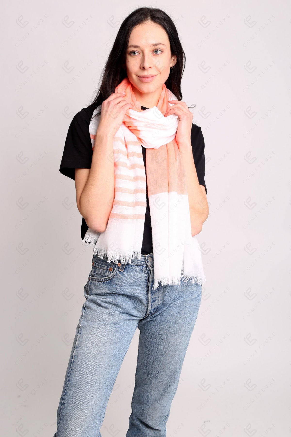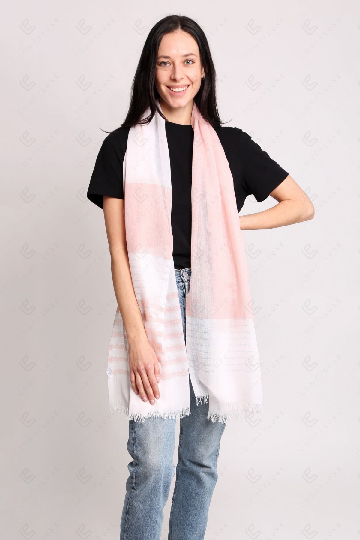 STRIPED PATTERN OBLONG SCARF W/ LUREX DETAILING & SHORT TRIM