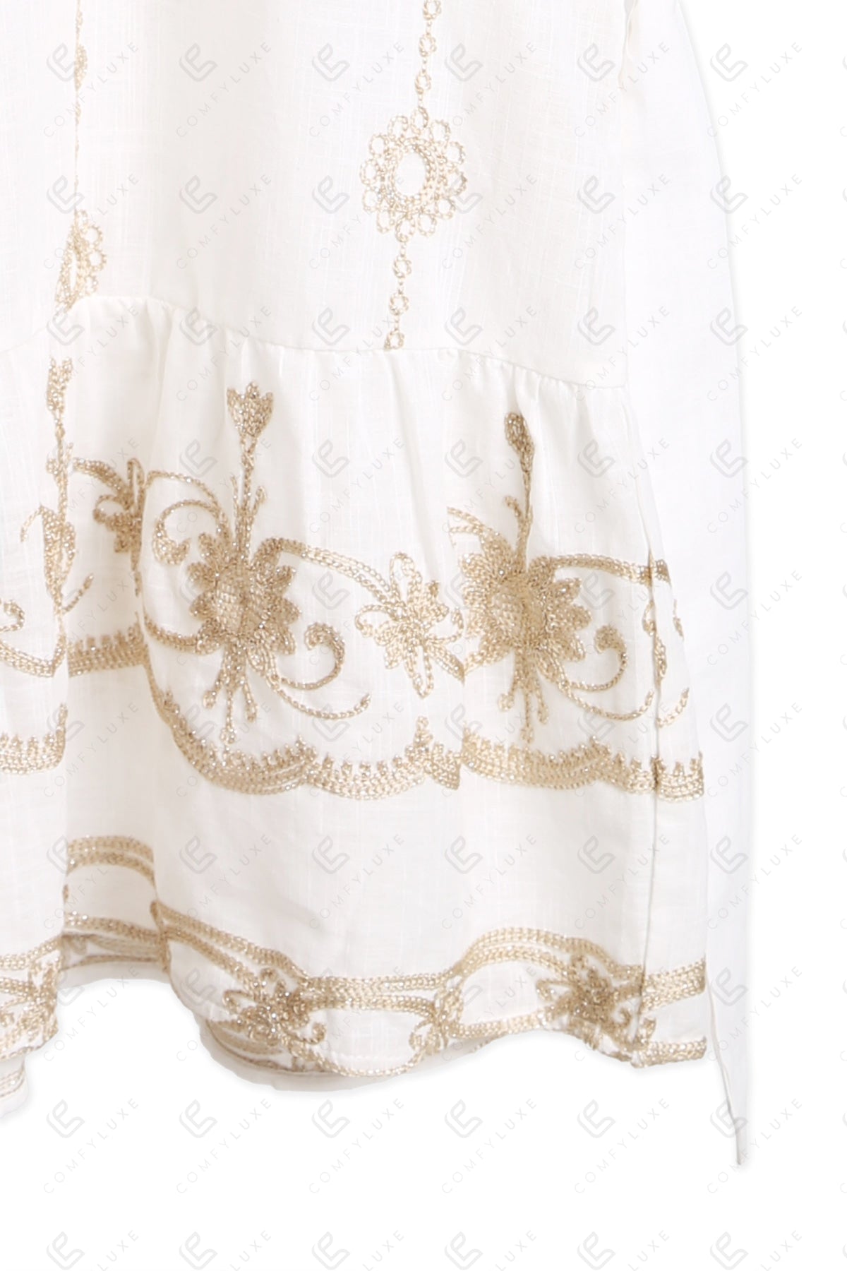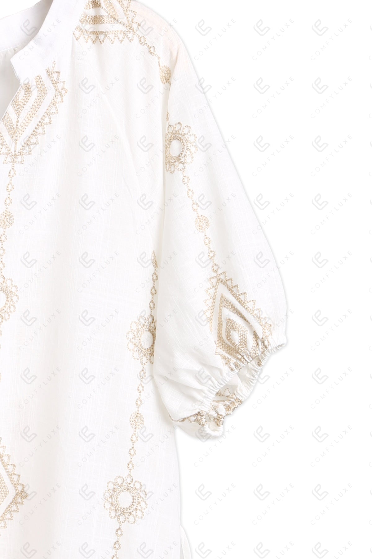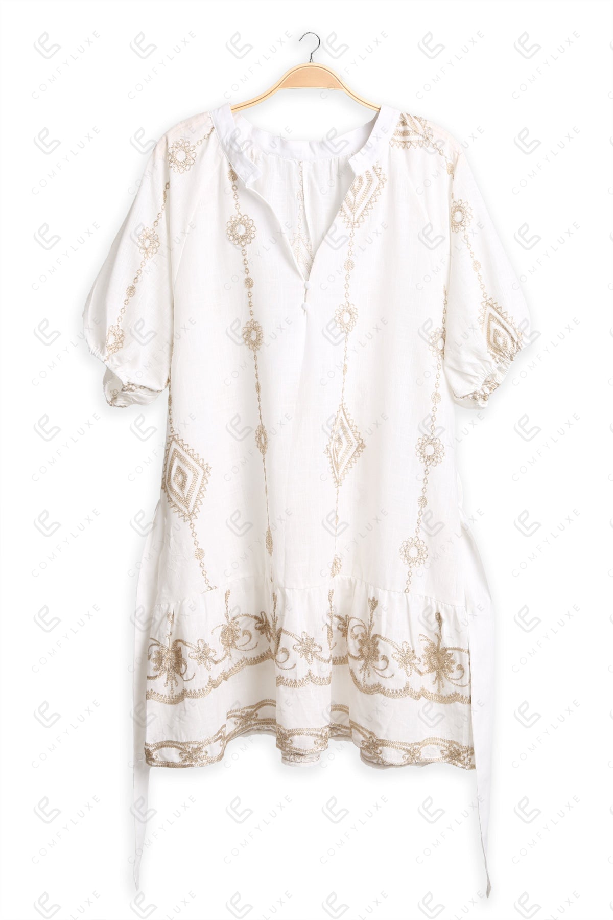 FLORAL PATTERN V-NECK, PUFF HALF-SLEEVED, SHORT COVER-UP DRESS W/ BELT, EMBROIDERED, & BUTTON DETAILING