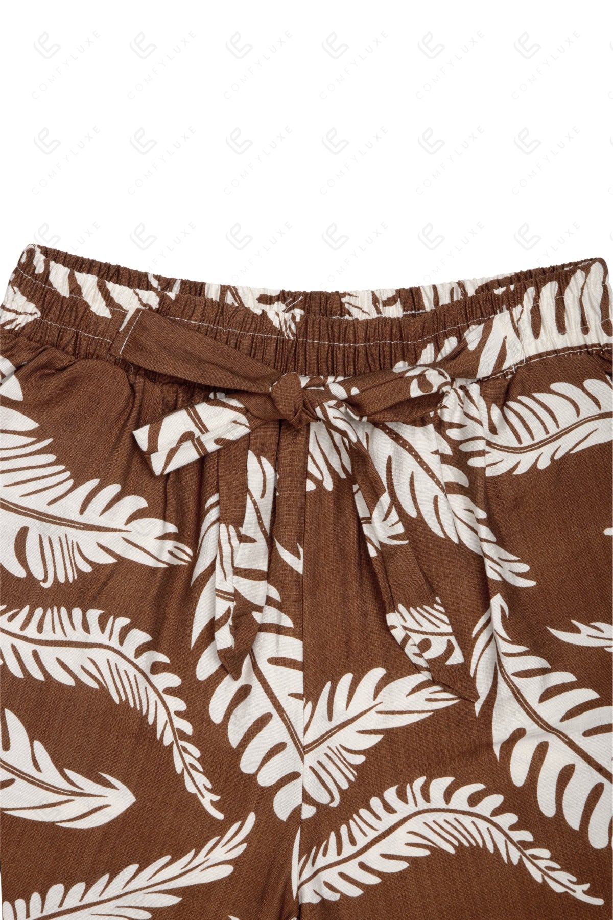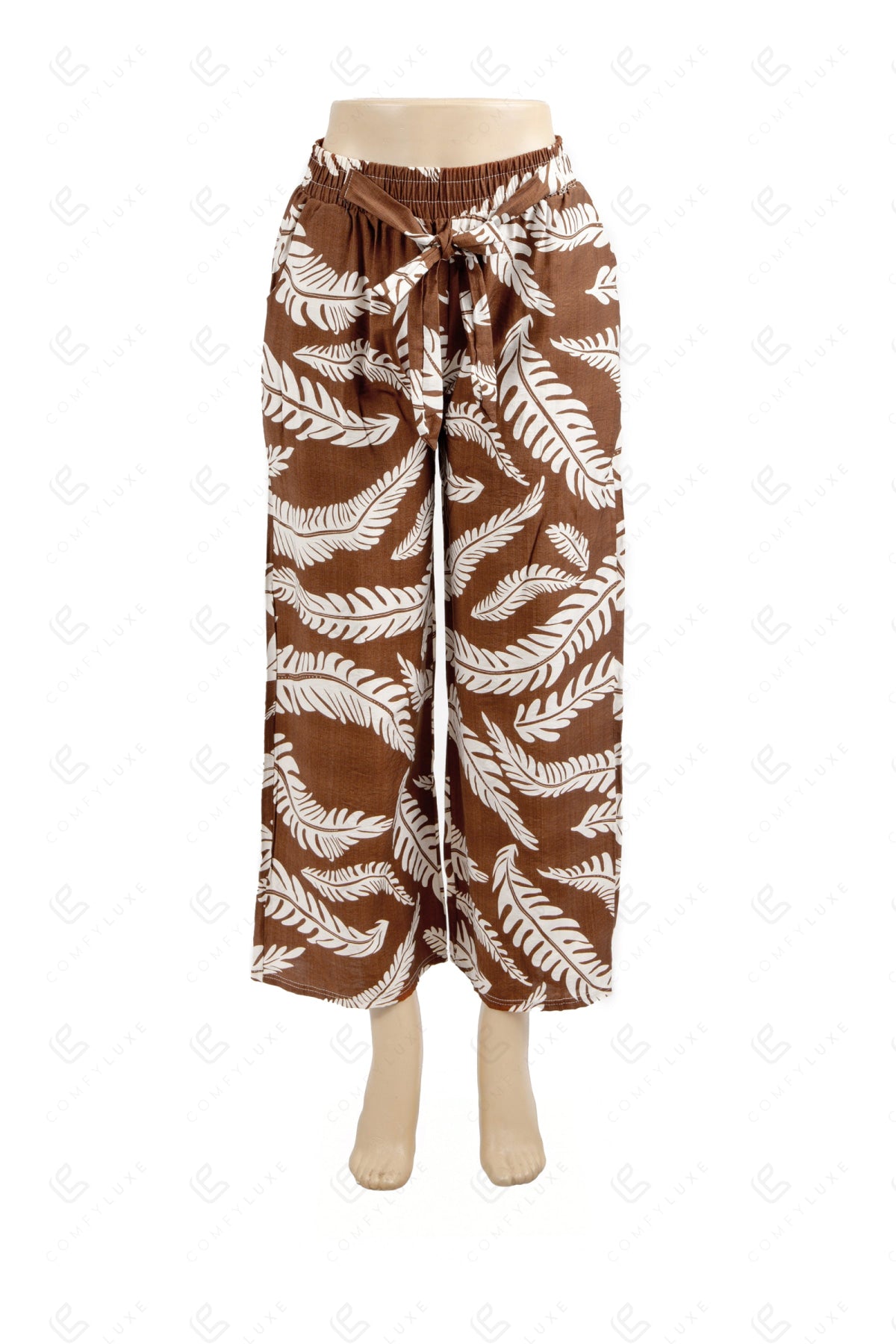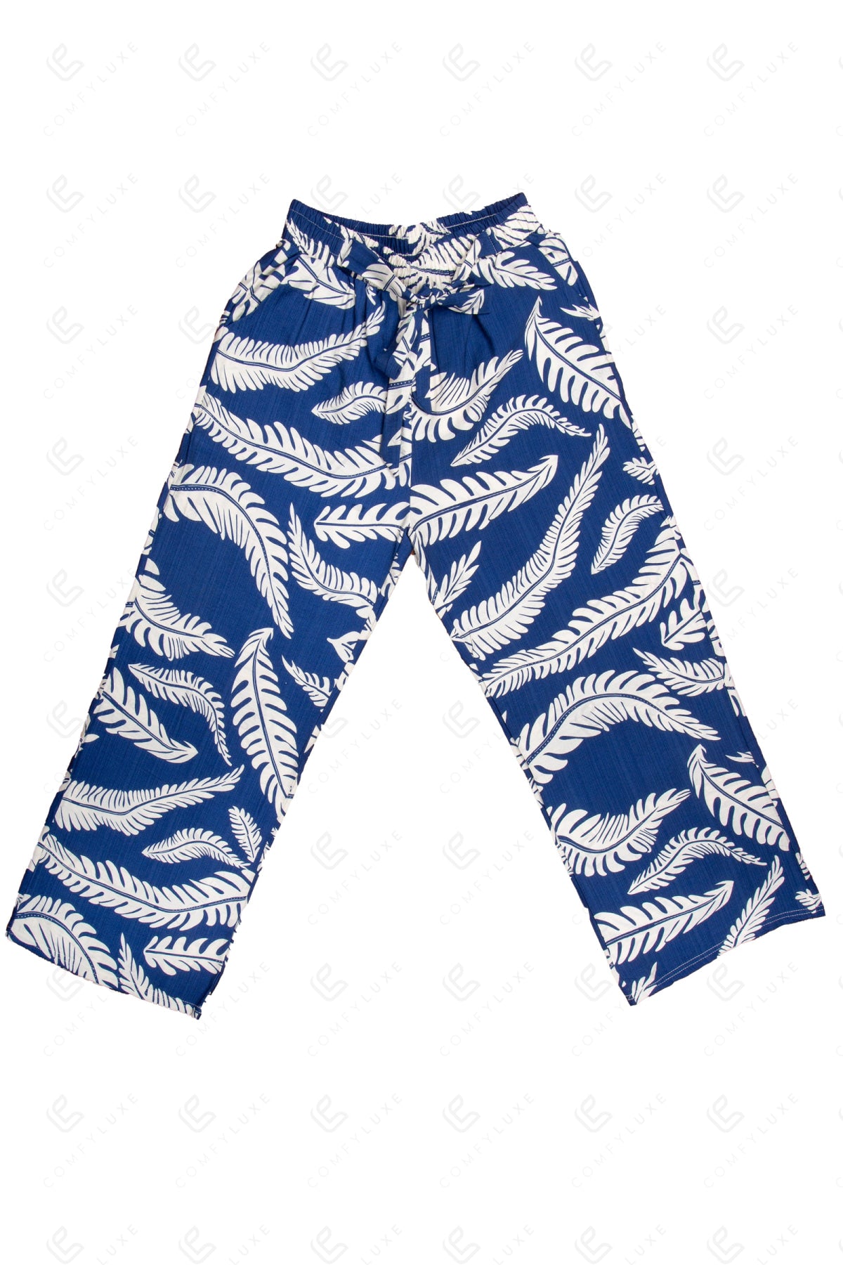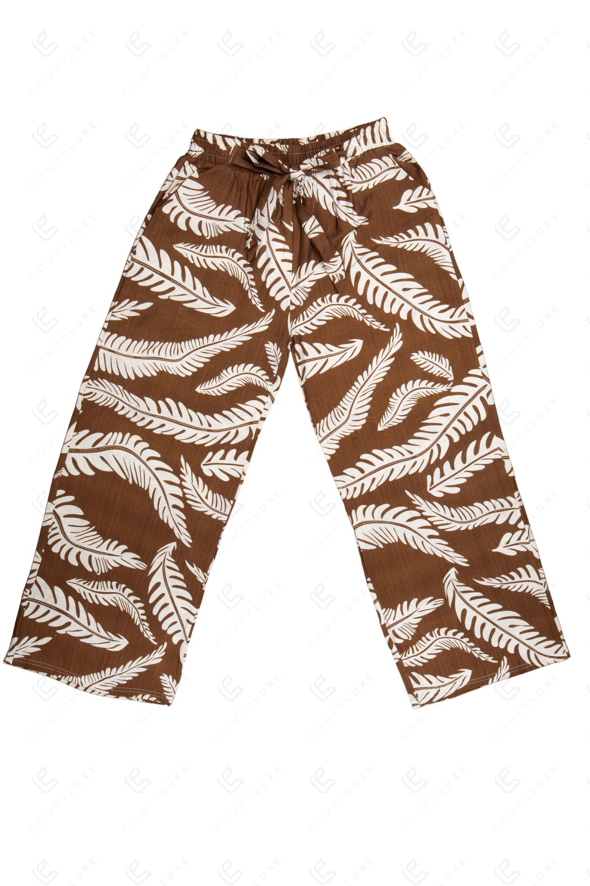 LEAF PATTERN WIDE-LEG PANTS W/ TIE-KNOT STRING & POCKETS