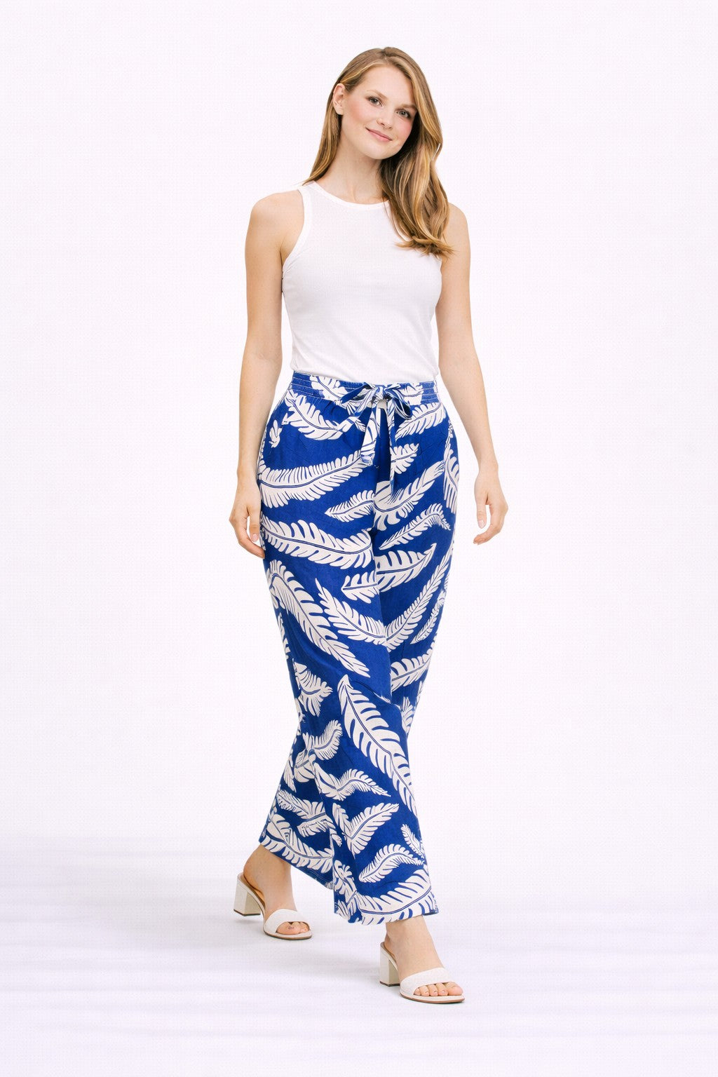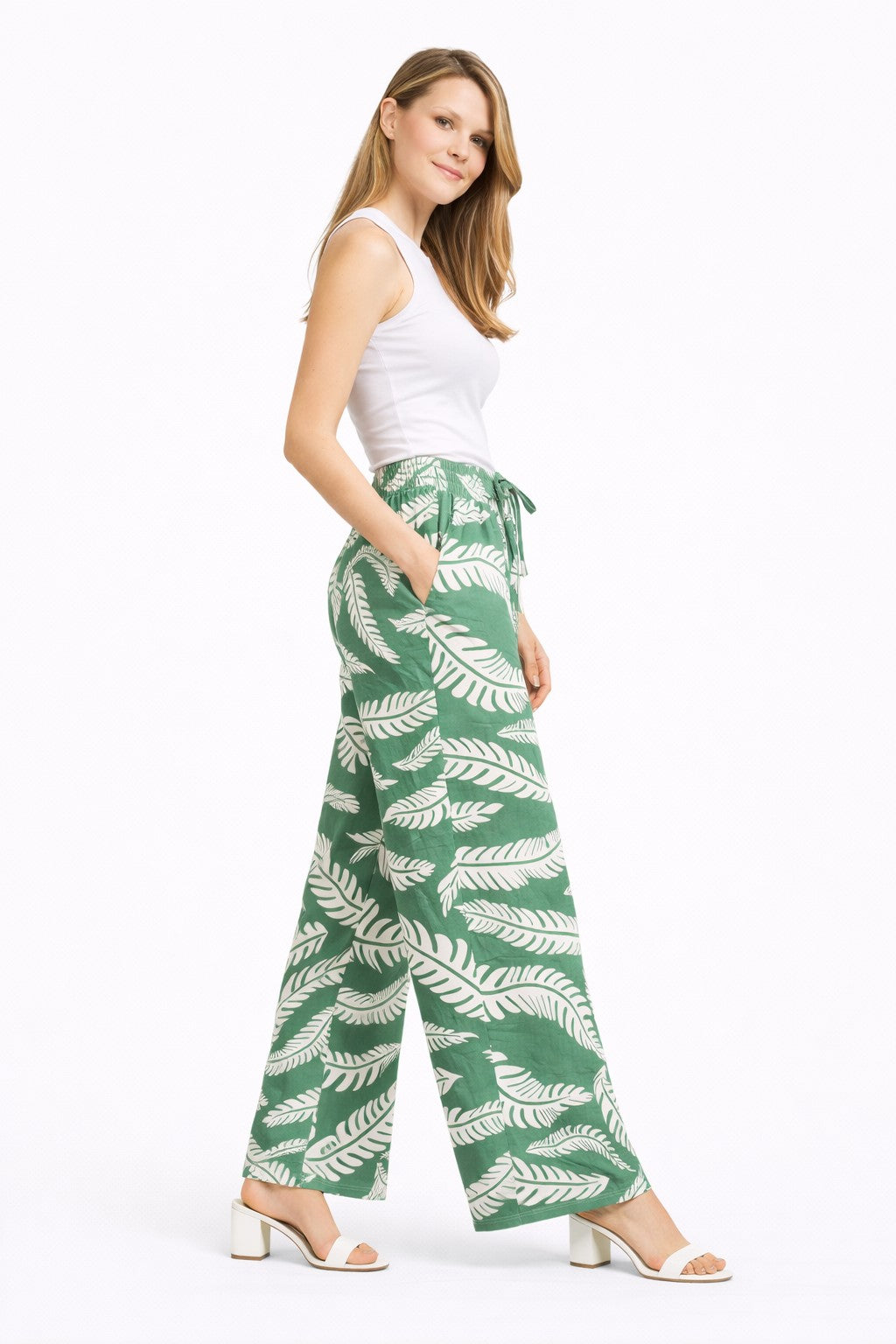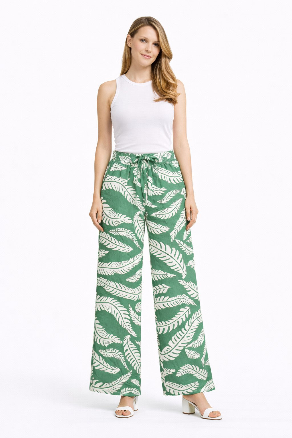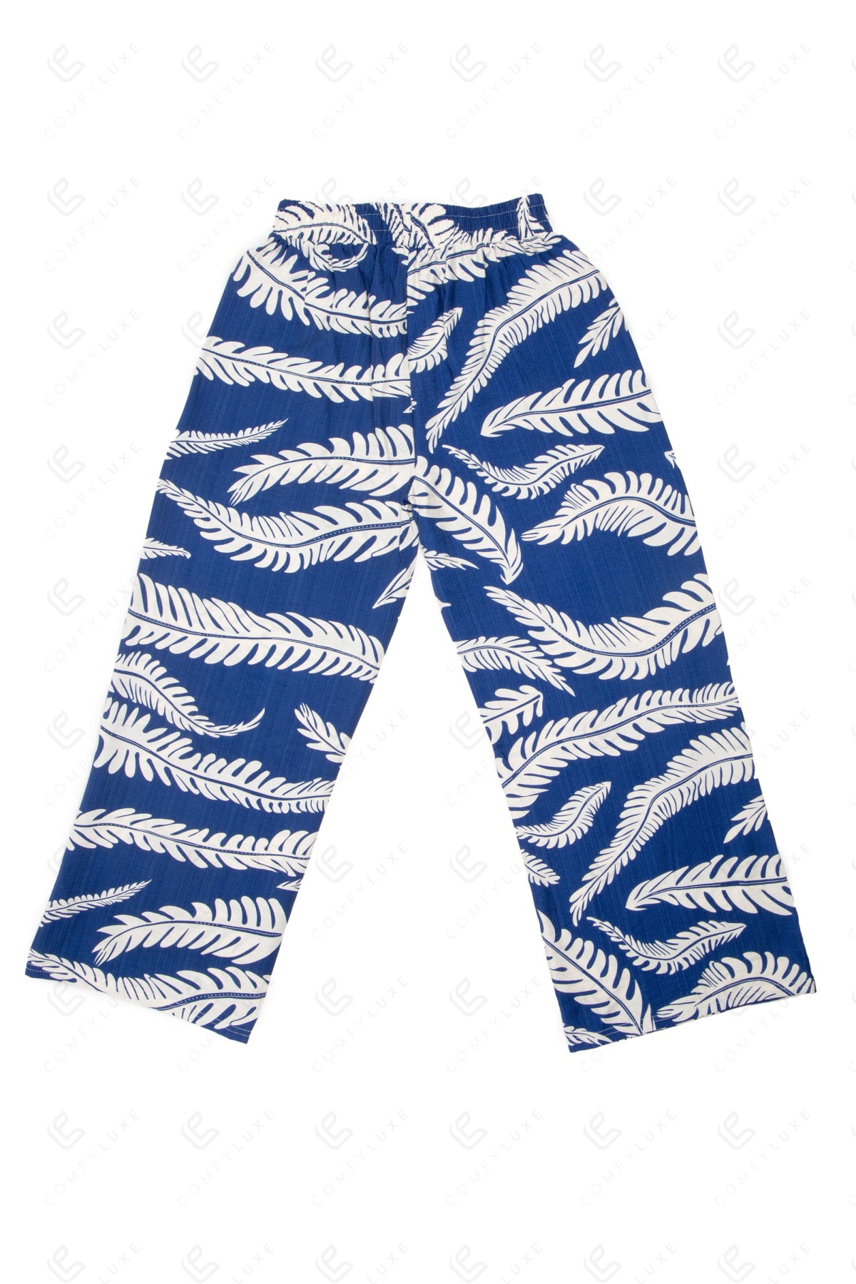 LEAF PATTERN WIDE-LEG PANTS W/ TIE-KNOT STRING & POCKETS