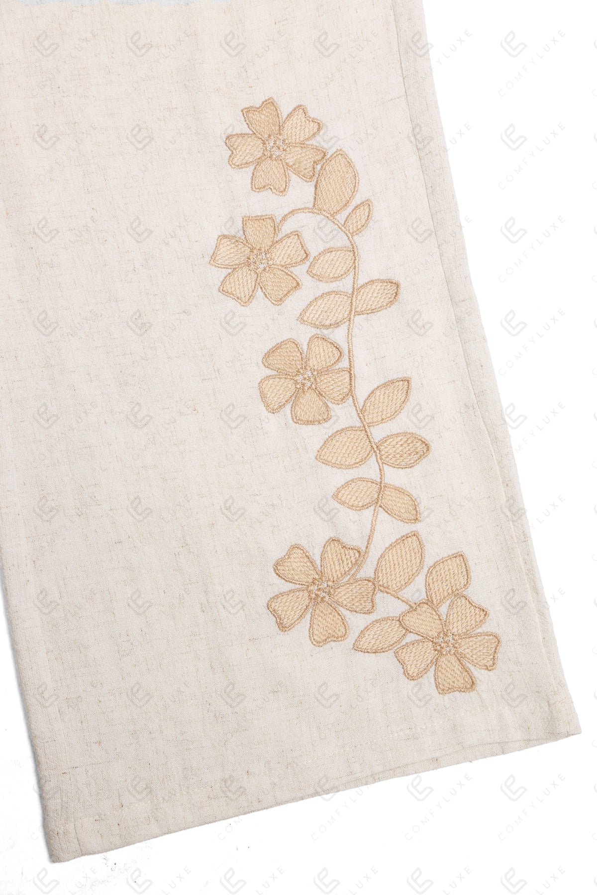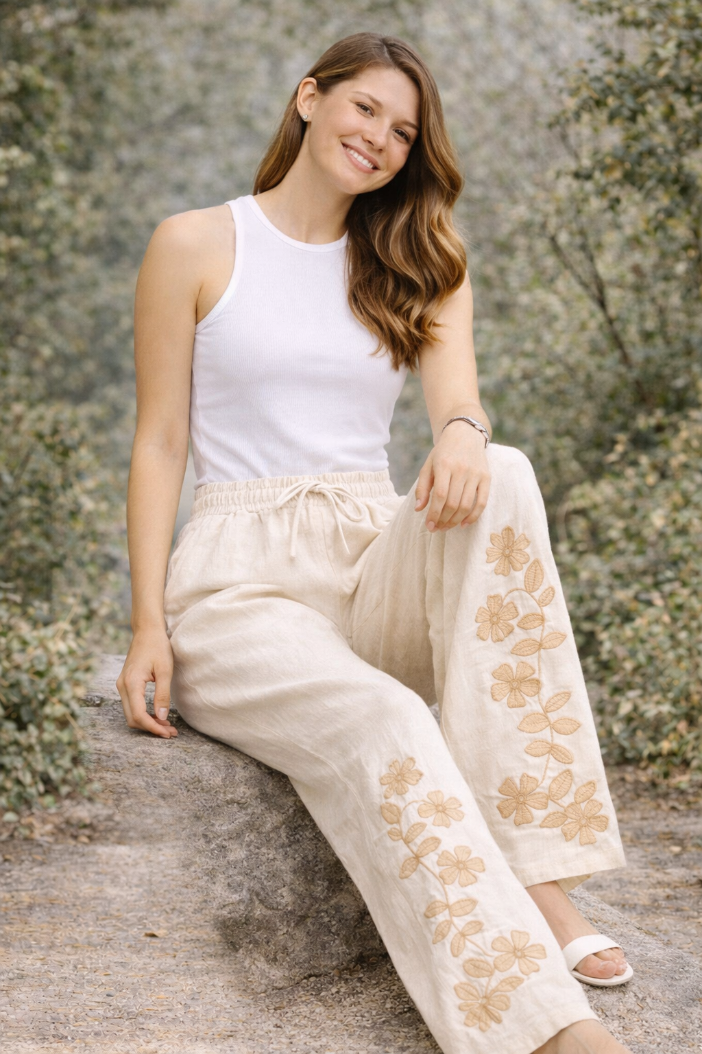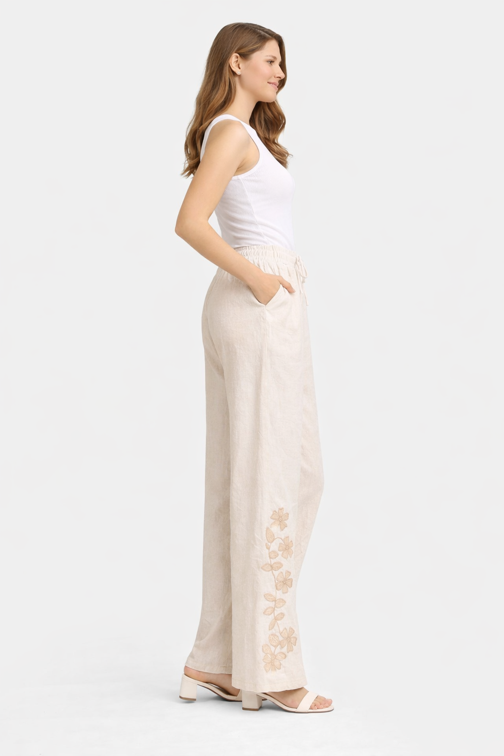 FLORAL PATTERN WIDE-LEG LINEN PANTS W/ EMBROIDERED DETAILING, DRAWSTRING, & POCKETS