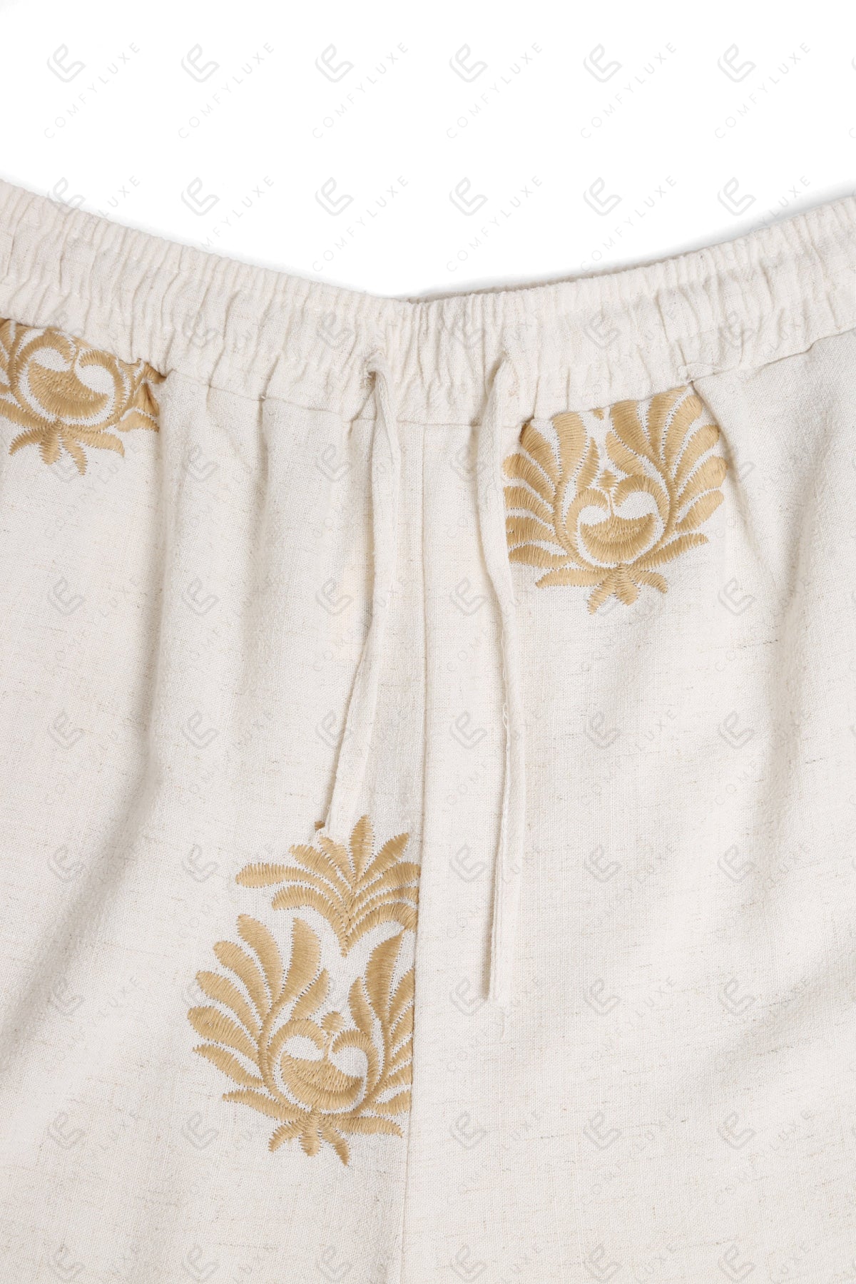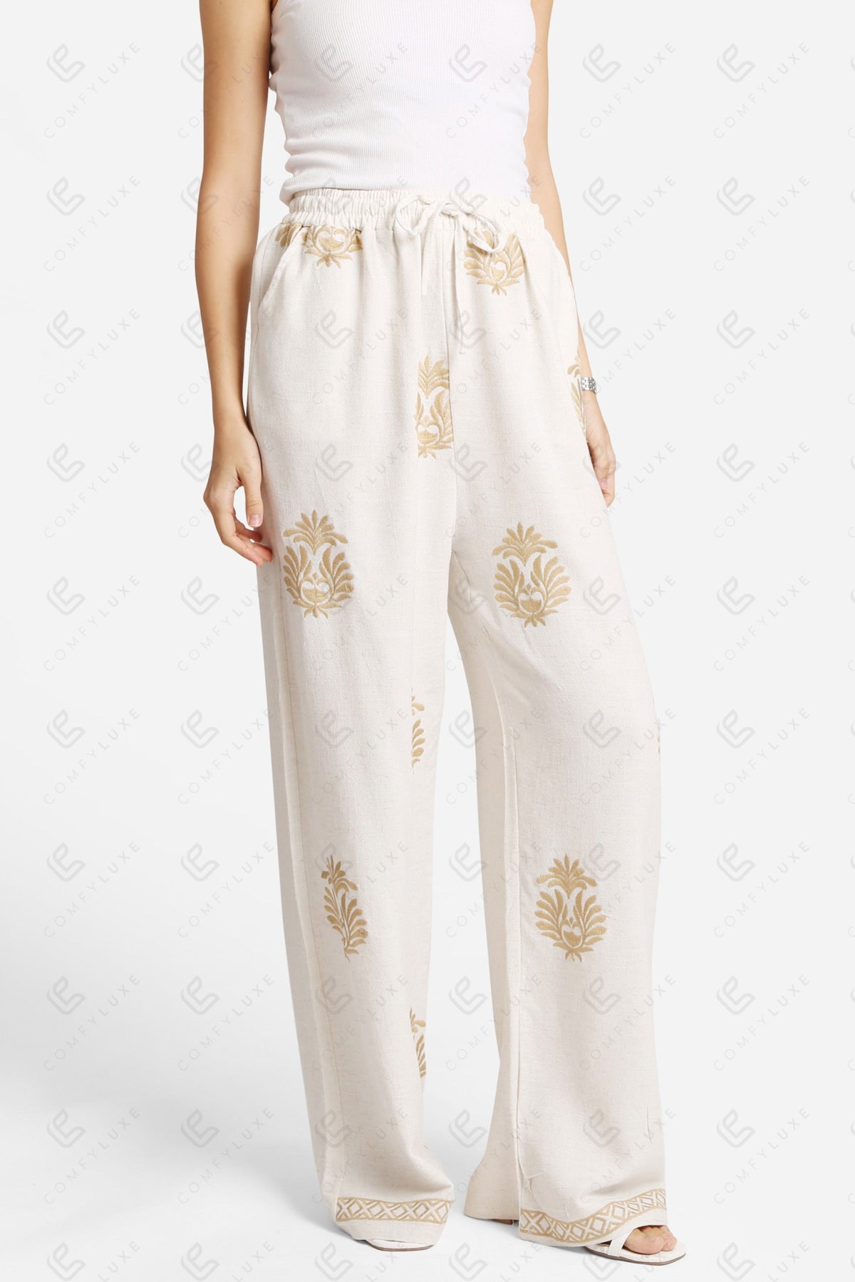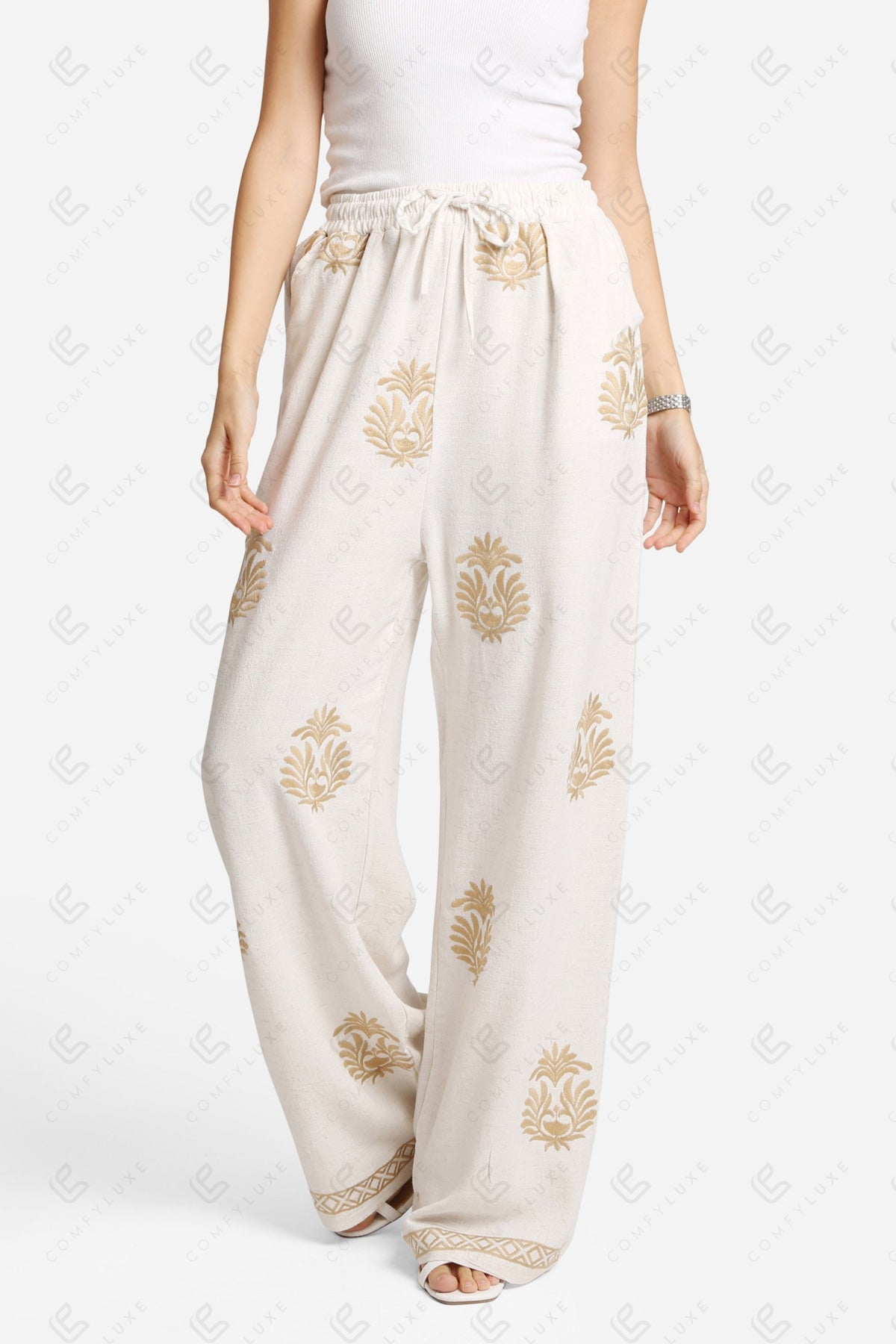 BOHO PATTERN WIDE-LEG LINEN PANTS W/ EMBROIDERED DETAILING, DRAWSTRING, & POCKETS