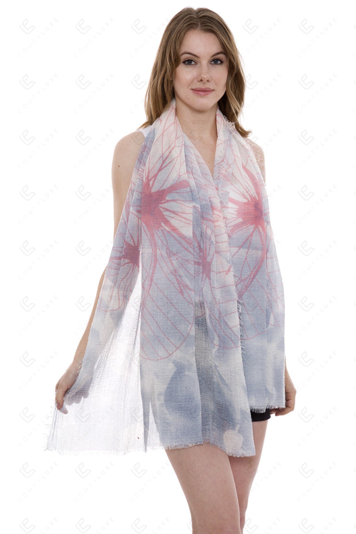 BUTTERFLY PATTERN OBLONG SCARF W/ SHORT TRIM